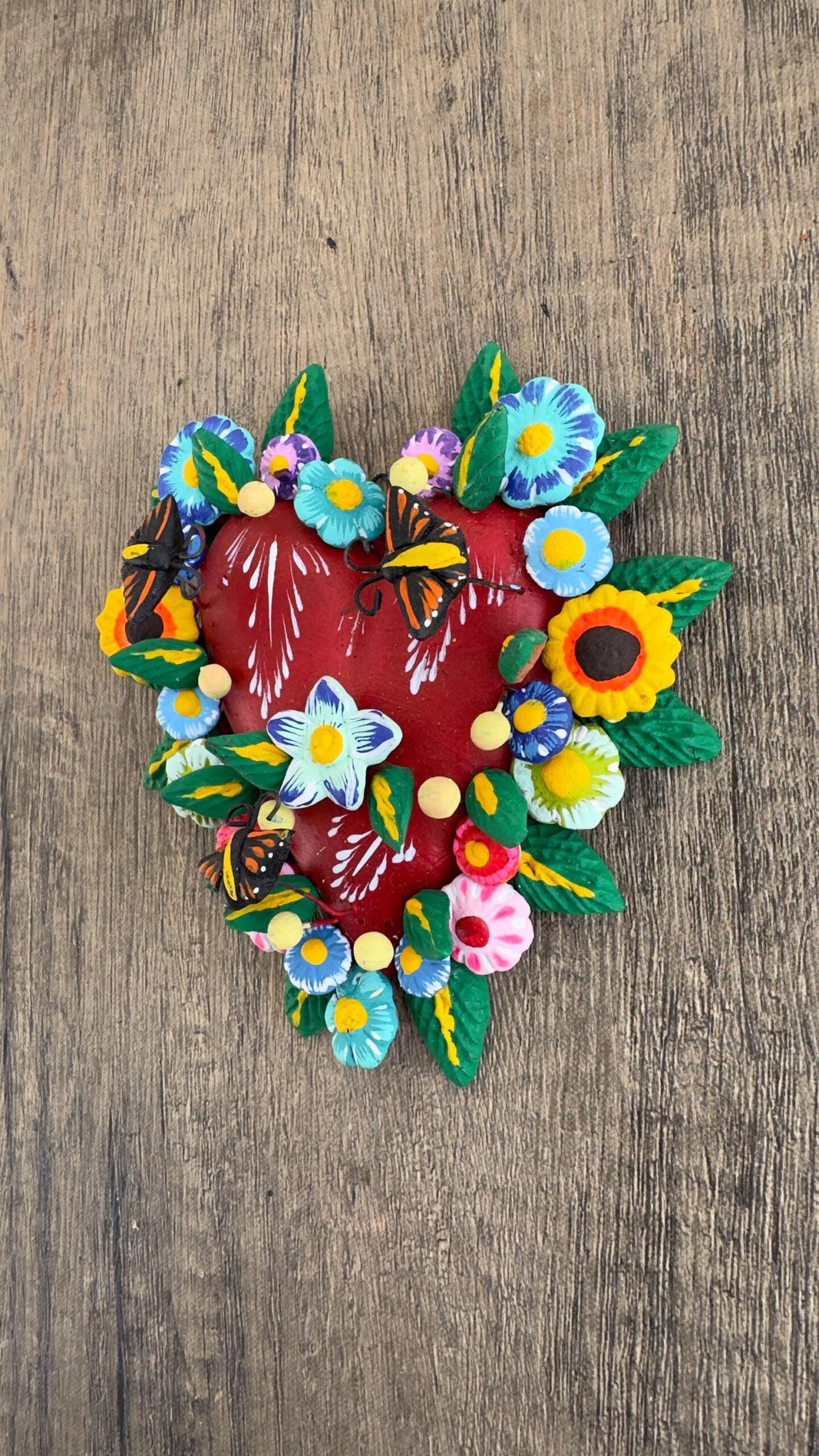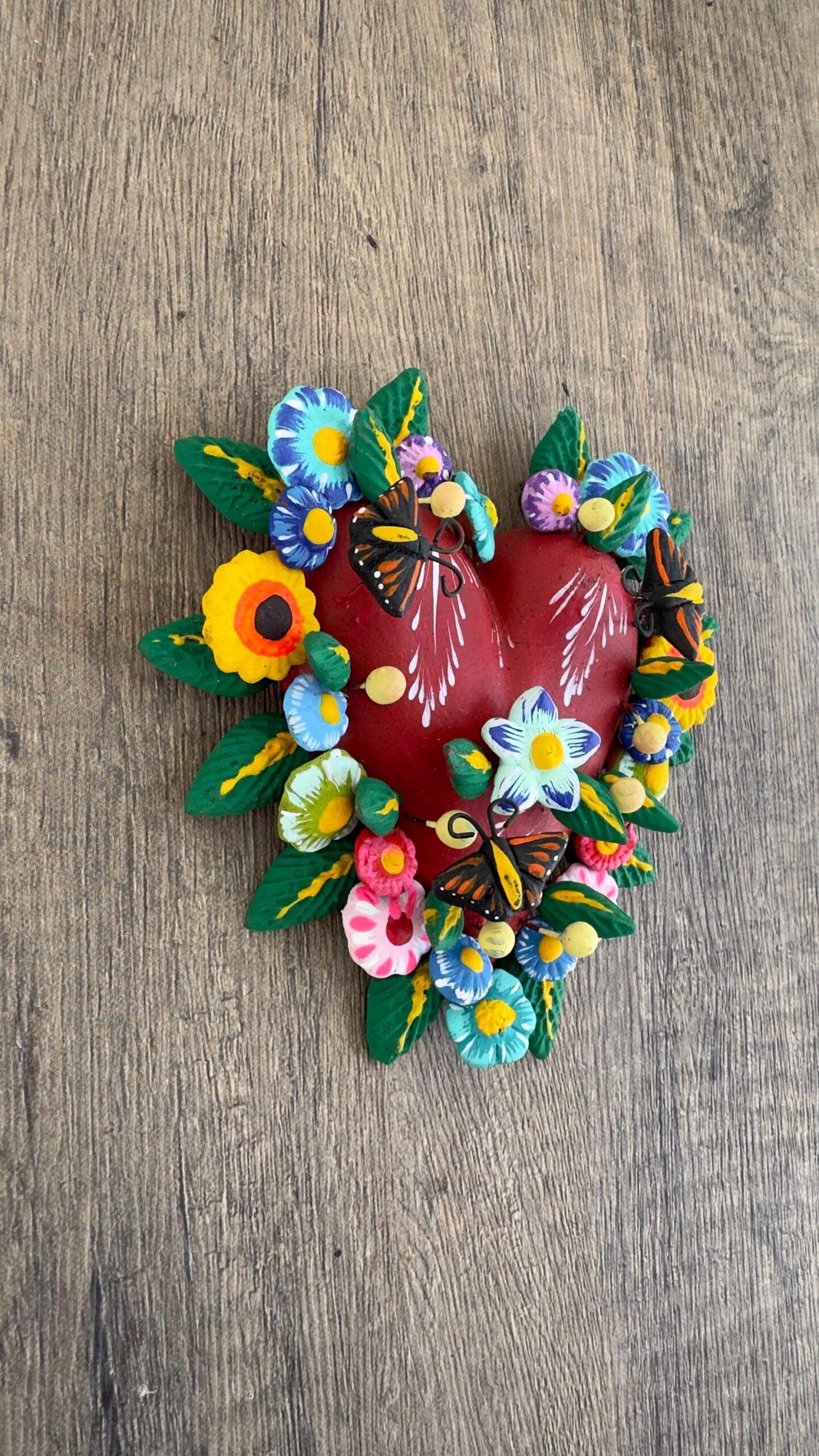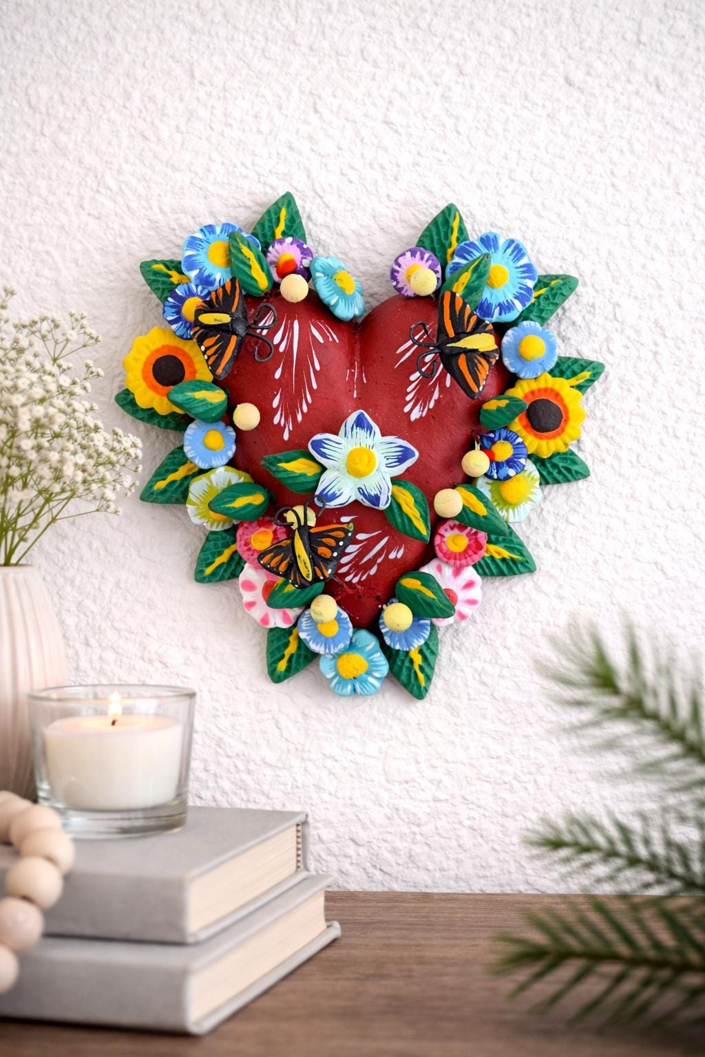 ” Mexican decoration, Heart wall hanging, Heart sculpture, Heart tree of life” Item Description: * Mexican art * Handmade by Mexican artisans * 4.5” tall * Made of clay Figures it have: * Butterflies * Roses * Leaves * Flowers * Red balls This beautiful heart statue has several elements that represent the tree of life, as its main figure is a heart, we will call it the heart of life. Each element that it has is attached to a metal wire, this in order to have a more interesting appearance. The figurines that make up the heart can be easily accommodated in case they get disheveled during transport. The back has a hook to hang it on the wall. This Mexican sculpture will give an interesting touch to your home, show it off to each of your guests ________________________________________________________________________________________________________________________________________________________________ Order carefully we’ll packed ✅ Product in sent in a box ✅ Shipping priority mail 3-5 business days✅ Express shipping is available for an additional charge, please ask ✅ Can send this with a special dedicatory✅ It can be sent with a special wrapping as a gift (please notify)✅ Any question please don’t hesitate, we usually respond in less than an hour 😀