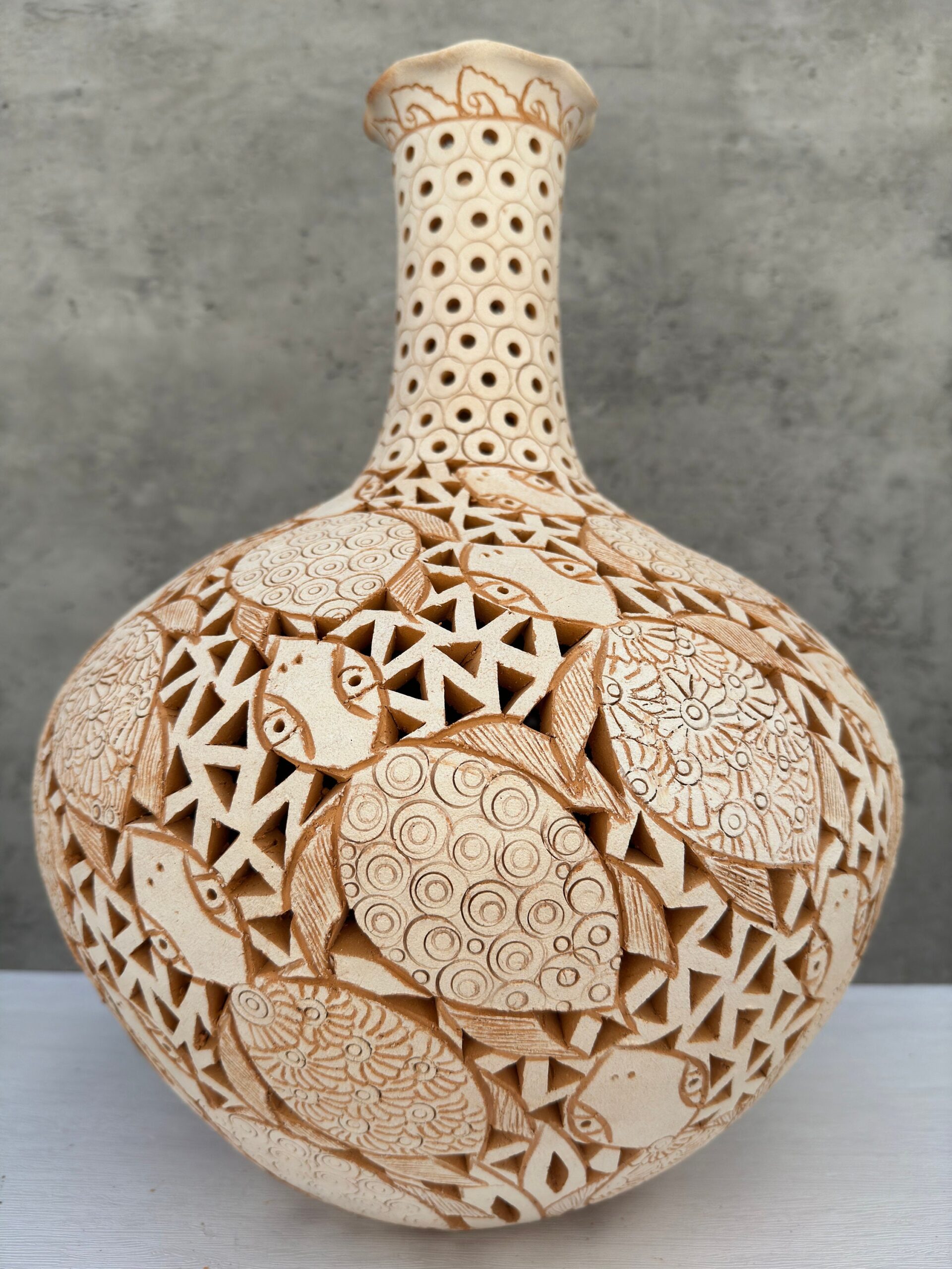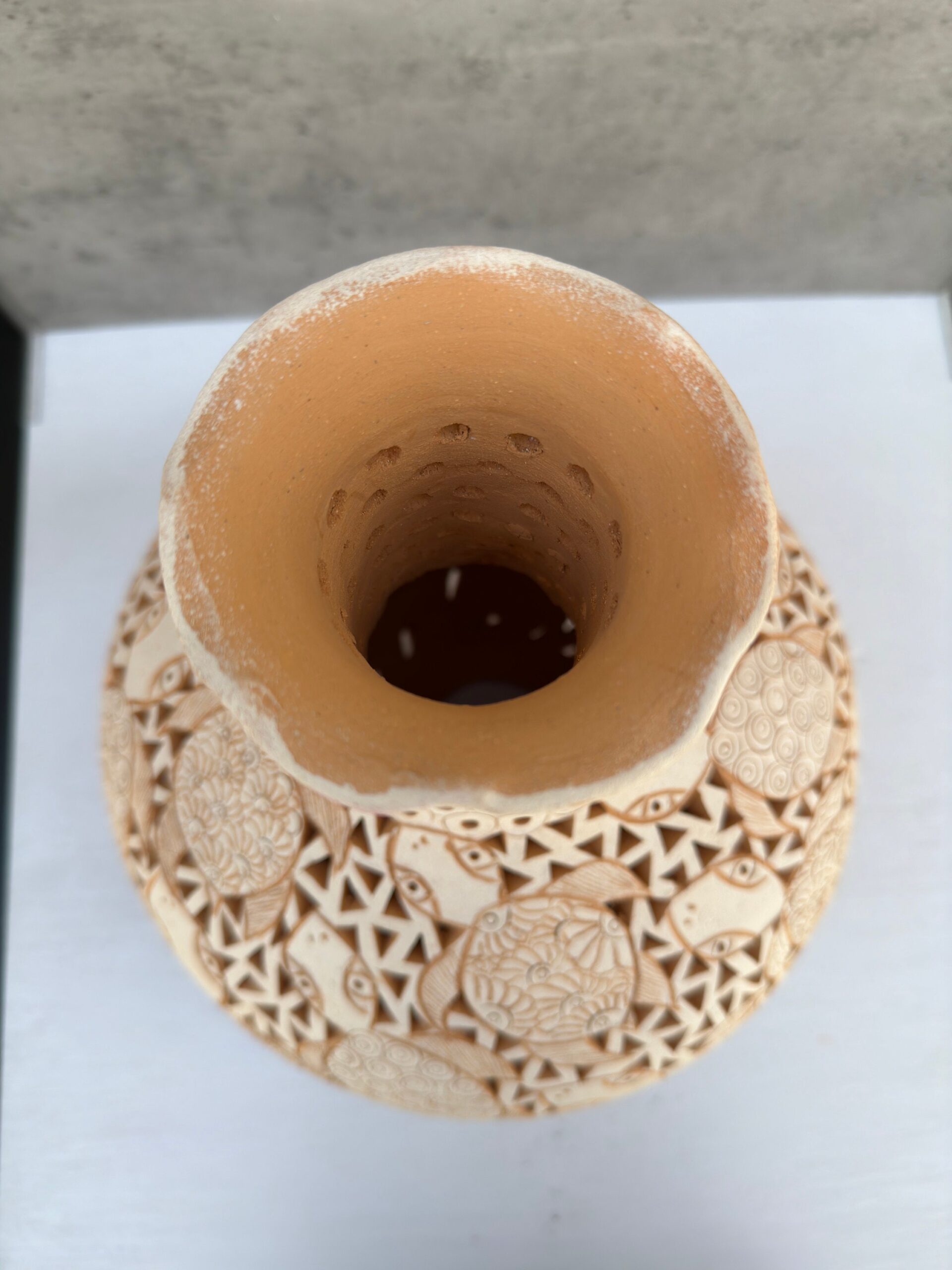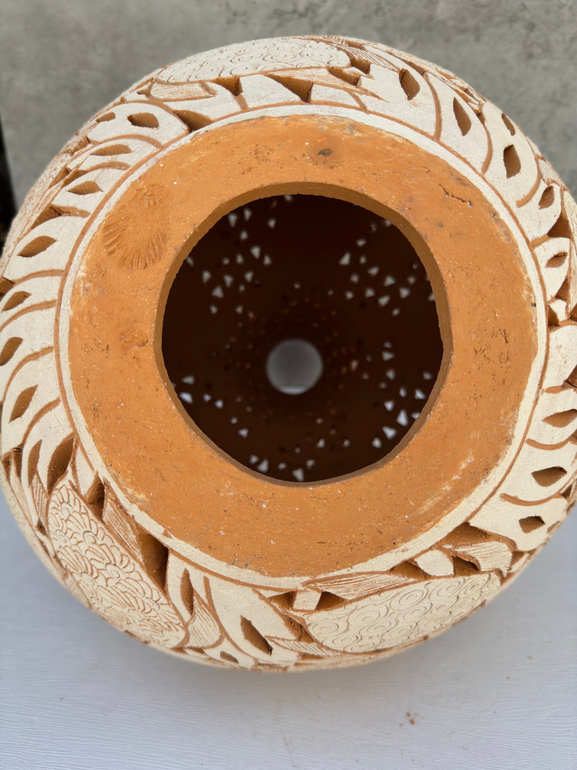 This exquisite handcrafted Oaxacan vase boasts an intricate, hand-carved design that exudes the richness of Mexican artisanal heritage. Fashioned from the finest white clay, each pattern is meticulously etched, revealing a warm terracotta hue beneath. The floral and geometric motifs celebrate traditional aesthetics, while the cut-out details add a contemporary flair, allowing light to dance through, casting enchanting shadows. Standing proudly at a height that captures the eye, this vase is not just a receptacle for blooms but a standalone piece of art. Each purchase supports the preservation of Oaxacan pottery, ensuring the survival of these age-old techniques. Perfect for adding a touch of rustic elegance to any home decor, this vase is a testament to the skill and creativity of its makers, making it an exceptional find on Etsy for collectors and admirers of authentic craftsmanship.