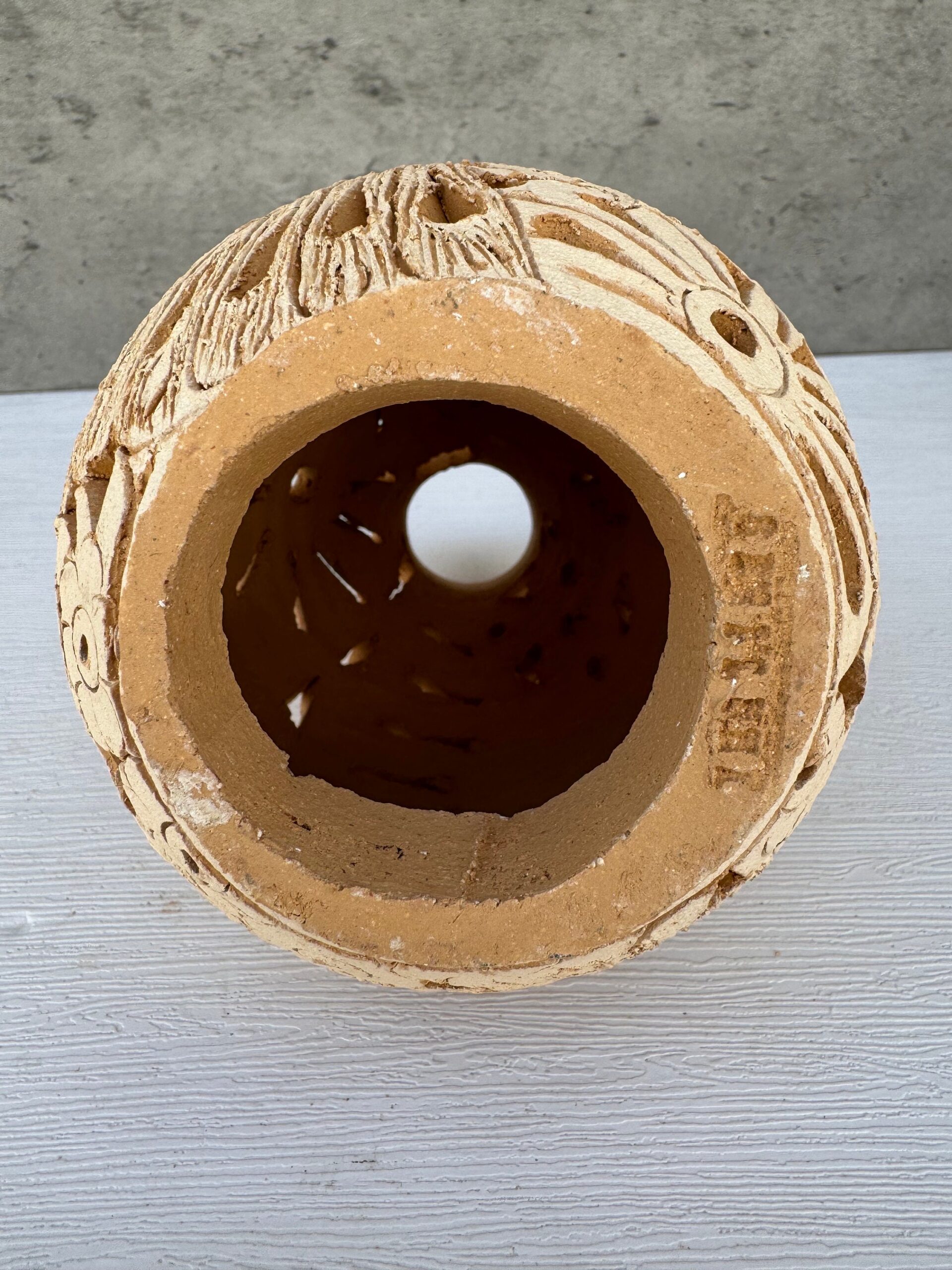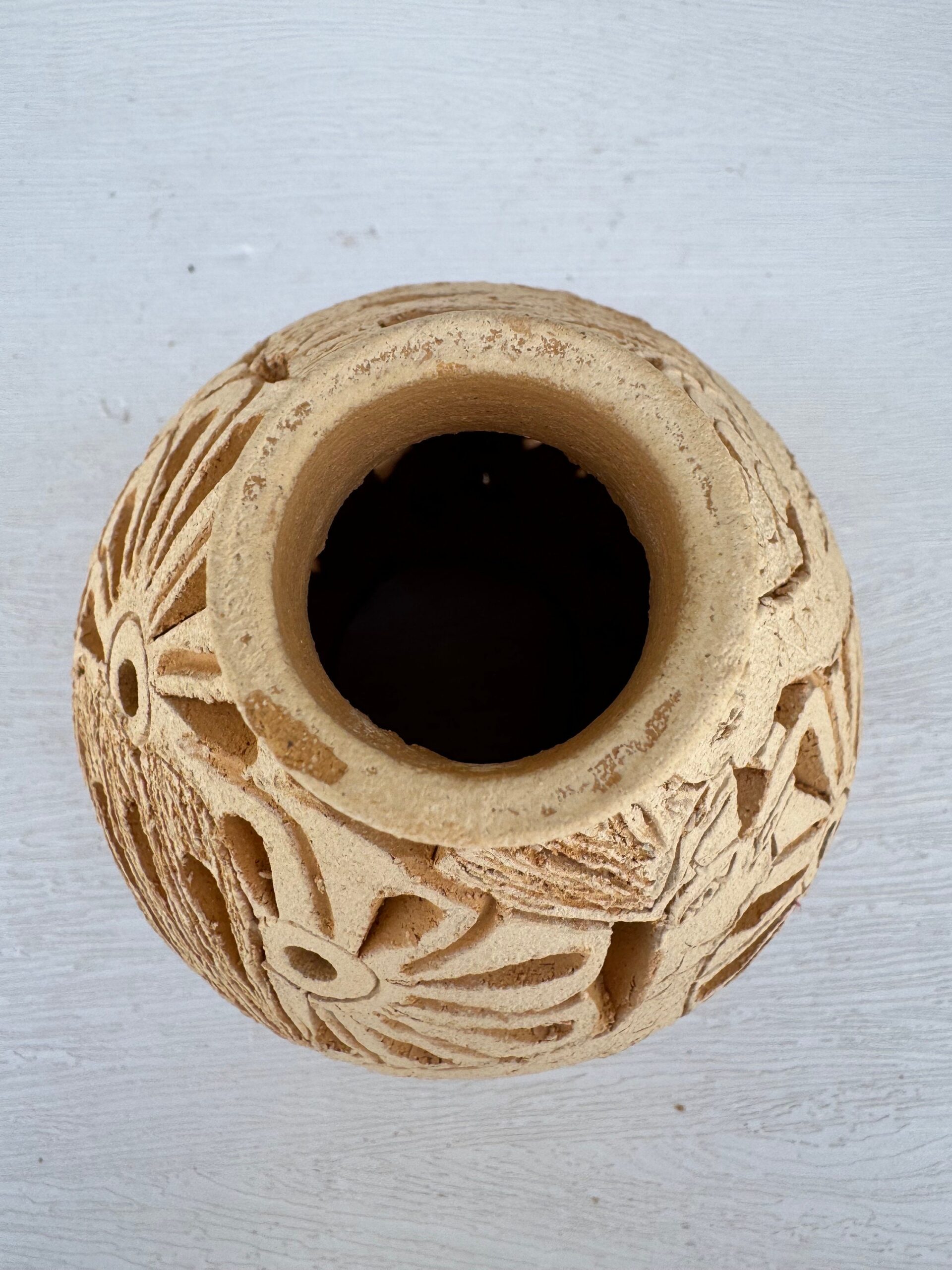 Beautiful decorative white clay vase from Mexico with dimensions of: 5” Tall, 4.5” Wide, 1.5” Top surface