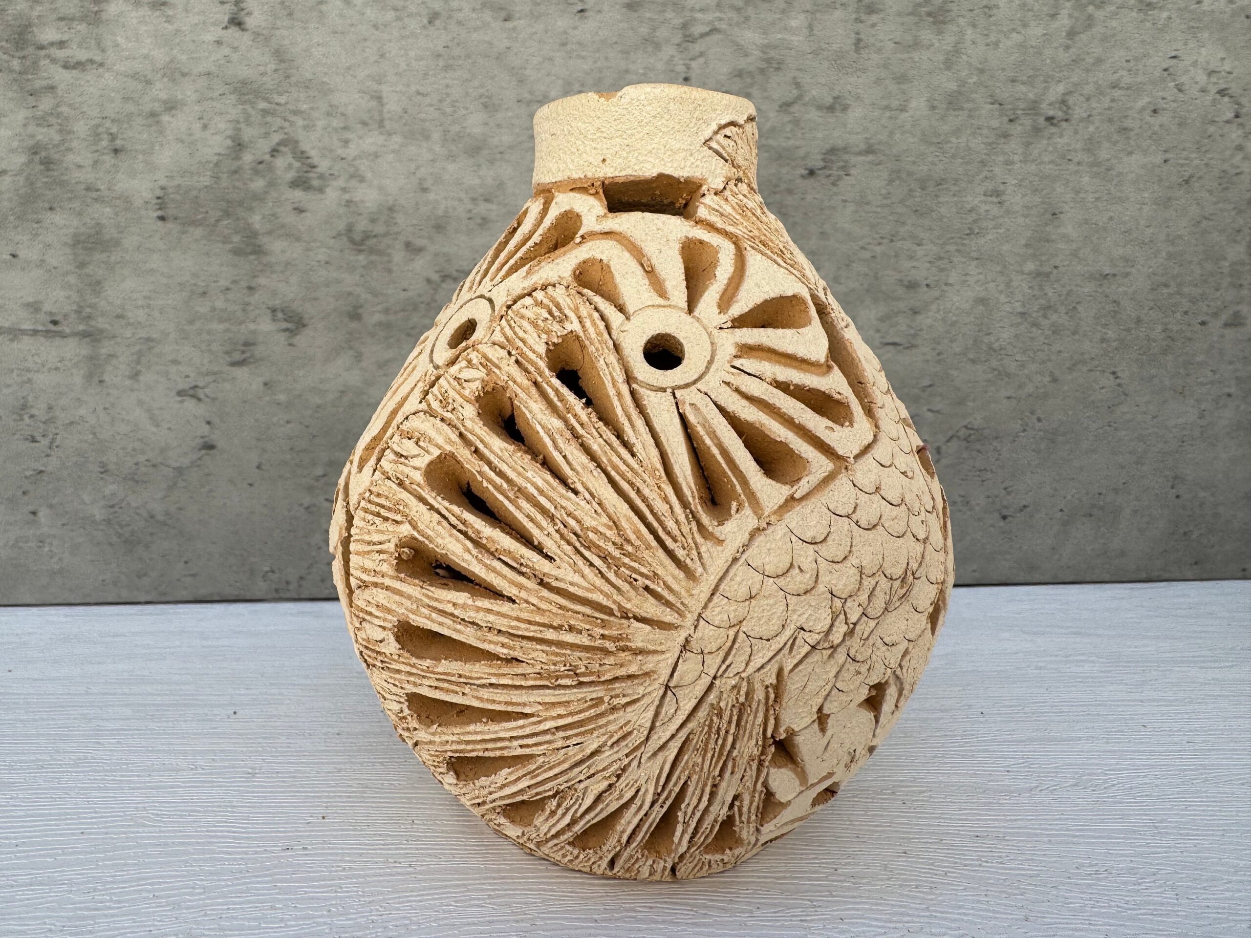 This exquisite handcrafted Oaxacan vase boasts an intricate, hand-carved design that exudes the richness of Mexican artisanal heritage. Fashioned from the finest white clay, each pattern is meticulously etched, revealing a warm terracotta hue beneath. The floral and geometric motifs celebrate traditional aesthetics, while the cut-out details add a contemporary flair, allowing light to dance through, casting enchanting shadows. Standing proudly at a height that captures the eye, this vase is not just a receptacle for blooms but a standalone piece of art. Each purchase supports the preservation of Oaxacan pottery, ensuring the survival of these age-old techniques. Perfect for adding a touch of rustic elegance to any home decor, this vase is a testament to the skill and creativity of its makers, making it an exceptional find on Etsy for collectors and admirers of authentic craftsmanship.