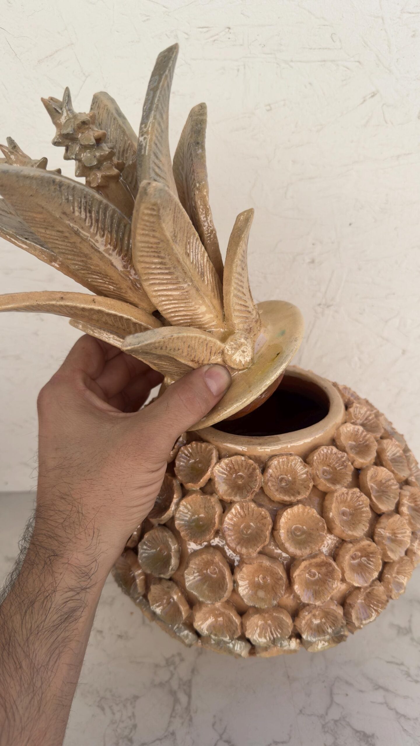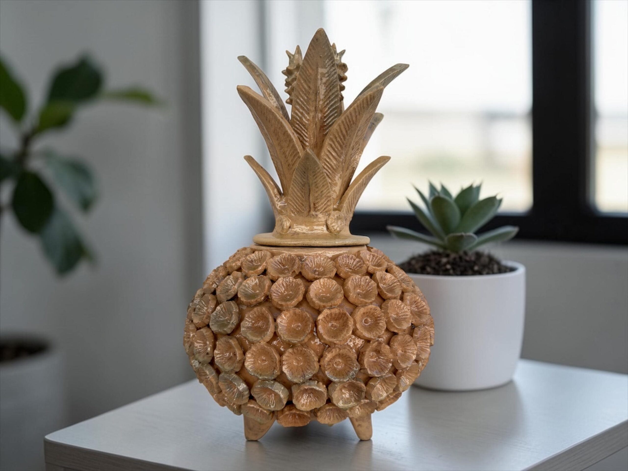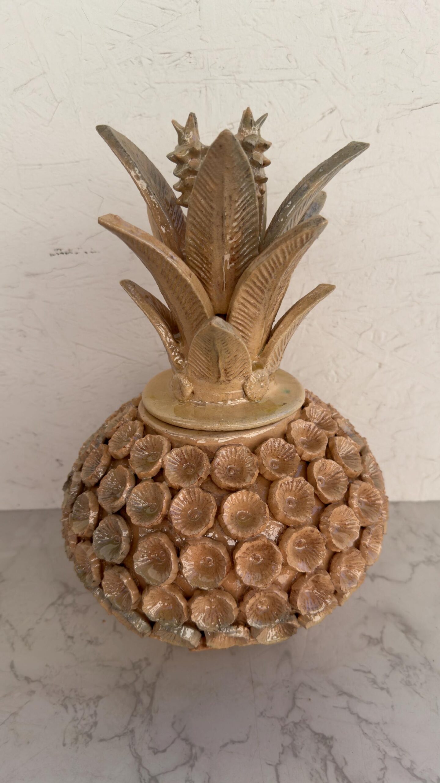 Glazed Pineapple – Mexican folk pottery – Mexican folk art This pineapple decor is a unique piece, each part of the scale is made by hand, by artisans from the state of Michoacan, Mexico. Characteristic: – Size: 8” wide, 13.5” tall – Clay material The pineapple sculpture of Michoacan is distinguished in Popular Art in Mexico not only for its quality, but also for the ancestral techniques they use, making a fusion of prehispanic techniques. Glazed clay, named for its glazed, glass-like appearance. The potters’ process consists of applying to the clay pieces, after their first firing, a film or layer that, after melting in an oven, takes on a crystalline appearance. It is therefore a smooth and waterproof coating achieved in a second firing that must reach 800 °C to 1300 °C. ______________________________________________________________________________________________________________________________________________________________________________________________________________________ This beautiful decoration pineapple can be used as a home decoration, the top of the pinecone can be removed to store items inside. By buying one of these pieces you support the families of artisans who work in this beautiful art. ______________________________________________________________________________________________________________________________________________________________________________________________________________________ IMPORTANT NOTE: – The colors of the pineapple may vary slightly from what is seen in the monitor – Please note that as this is a handmade enameled piece there may be some imperfections. – All our fragile products, we pack them with special materials to guarantee their protection, if there is any problem with your package, please contact us to solve it as soon as possible. ______________________________________________________________________________________________________________________________________________________________________________________________________________________ Order carefully, we will pack ✅ Express shipping is available for an additional charge, please ask ✅ You can send this with a special dedication✅ It can be sent with a special wrapping as a gift (warn)✅ Any questions please do not hesitate, we usually respond in less than an hour 😀