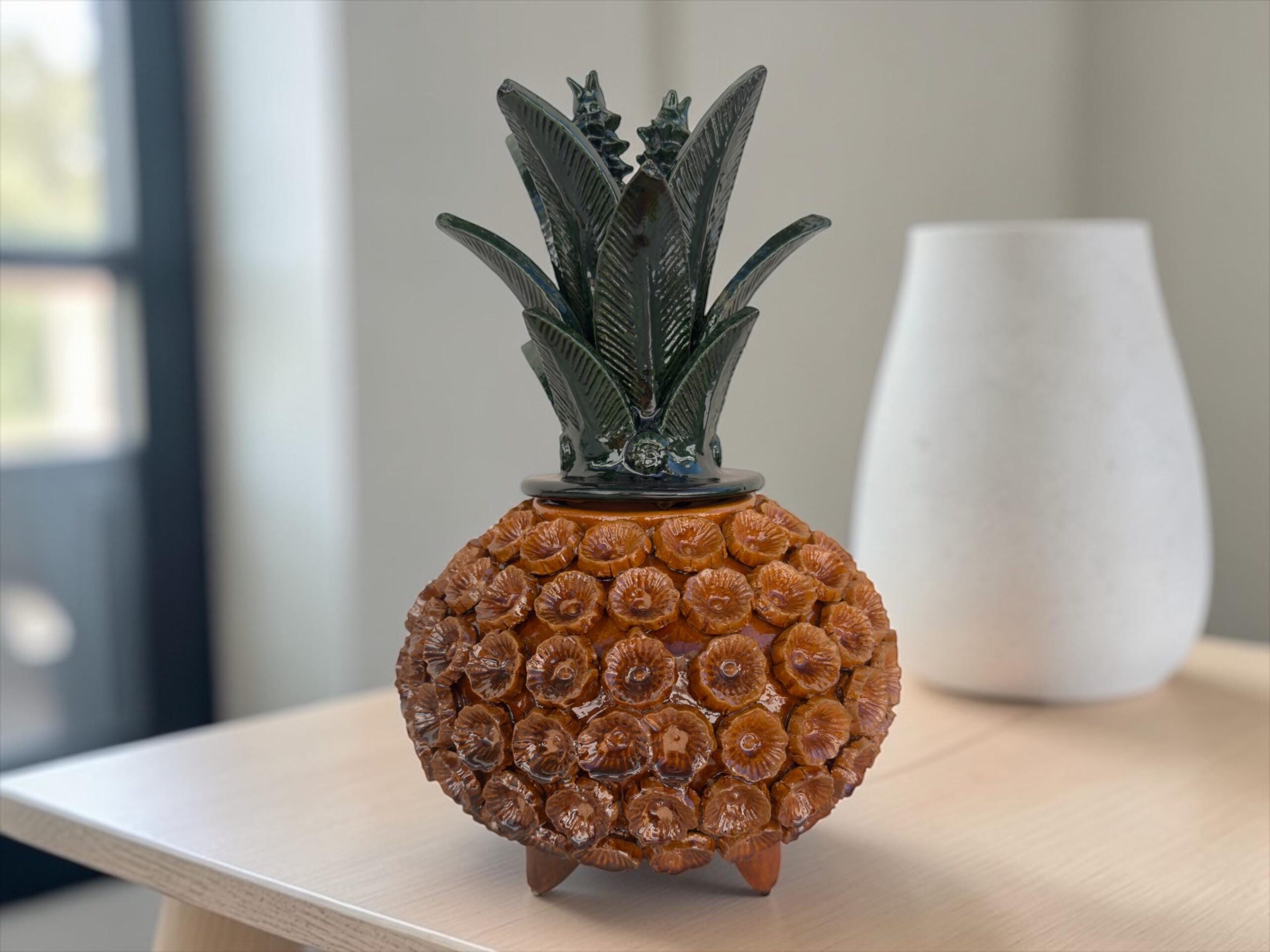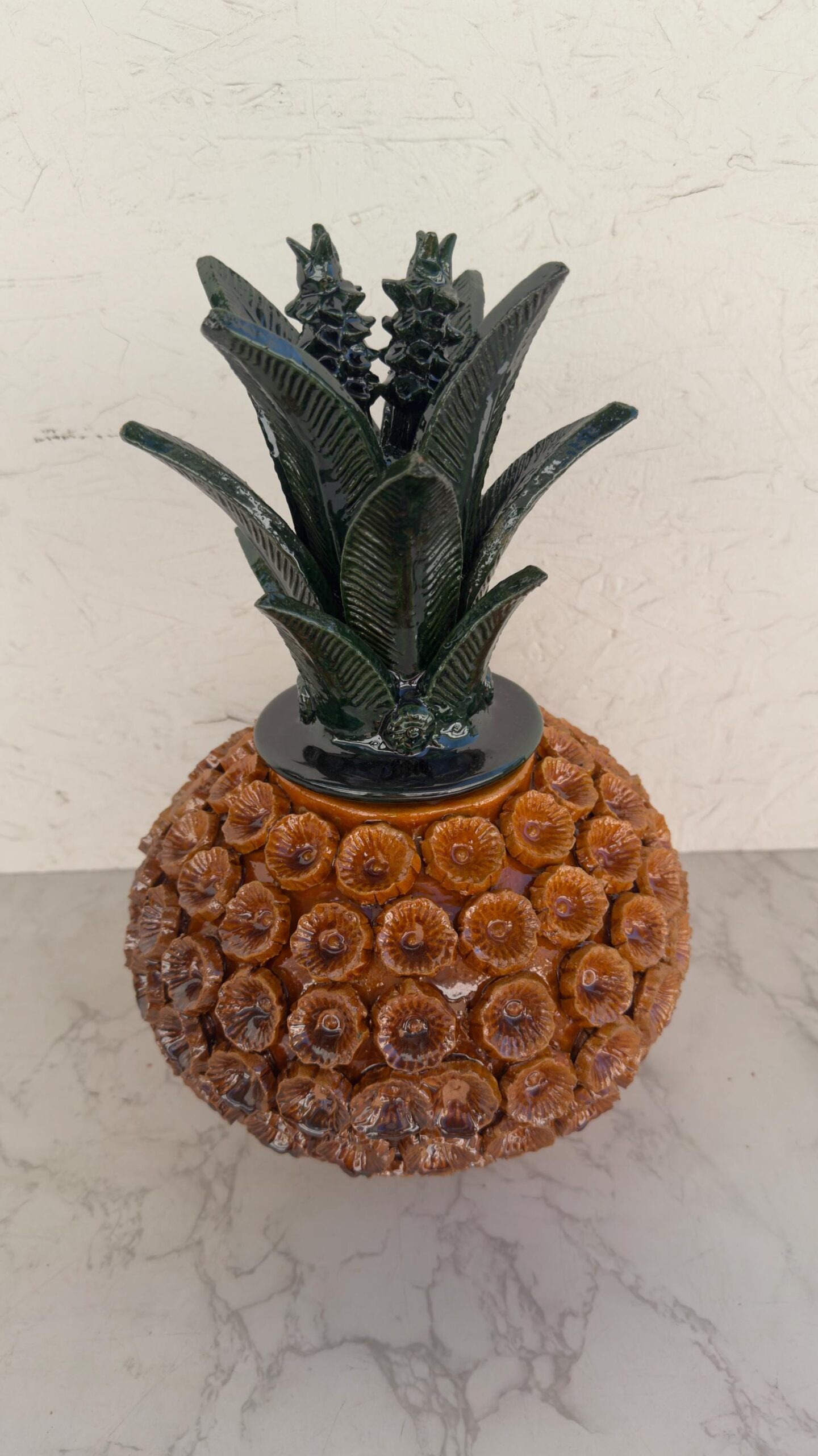 Glazed Pineapple – Mexican folk pottery – Mexican folk art This pineapple decor is a unique piece, each part of the scale is made by hand, by artisans from the state of Michoacan, Mexico. Characteristic: – Size: 8” wide, 13.5” tall – Clay material The pineapple sculpture of Michoacan is distinguished in Popular Art in Mexico not only for its quality, but also for the ancestral techniques they use, making a fusion of prehispanic techniques. Glazed clay, named for its glazed, glass-like appearance. The potters’ process consists of applying to the clay pieces, after their first firing, a film or layer that, after melting in an oven, takes on a crystalline appearance. It is therefore a smooth and waterproof coating achieved in a second firing that must reach 800 °C to 1300 °C. ______________________________________________________________________________________________________________________________________________________________________________________________________________________ This beautiful decoration pineapple can be used as a home decoration, the top of the pinecone can be removed to store items inside. By buying one of these pieces you support the families of artisans who work in this beautiful art. ______________________________________________________________________________________________________________________________________________________________________________________________________________________ IMPORTANT NOTE: – The colors of the pineapple may vary slightly from what is seen in the monitor – Please note that as this is a handmade enameled piece there may be some imperfections. – All our fragile products, we pack them with special materials to guarantee their protection, if there is any problem with your package, please contact us to solve it as soon as possible. ______________________________________________________________________________________________________________________________________________________________________________________________________________________ Order carefully, we will pack ✅ Express shipping is available for an additional charge, please ask ✅ You can send this with a special dedication✅ It can be sent with a special wrapping as a gift (warn)✅ Any questions please do not hesitate, we usually respond in less than an hour 😀