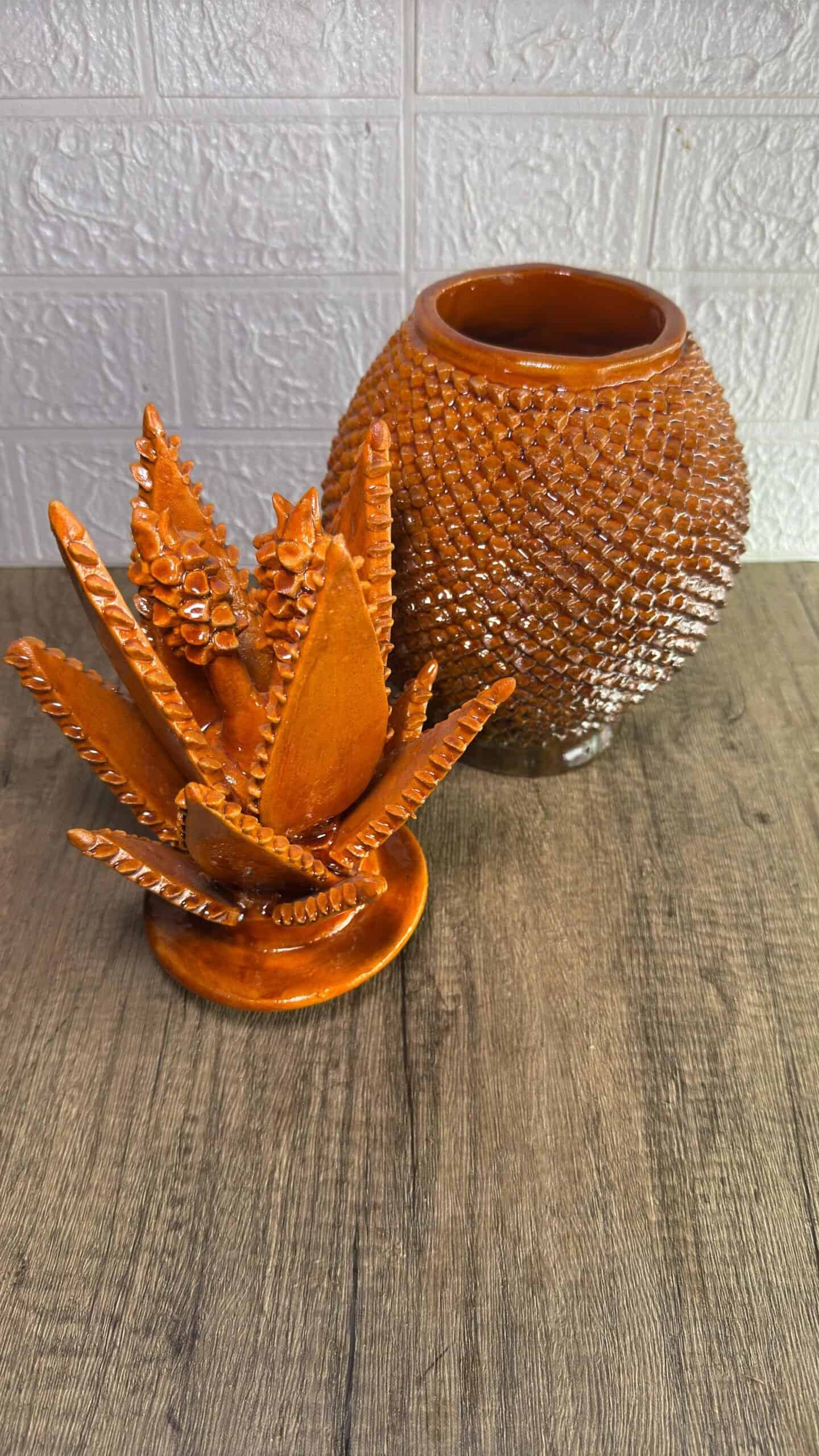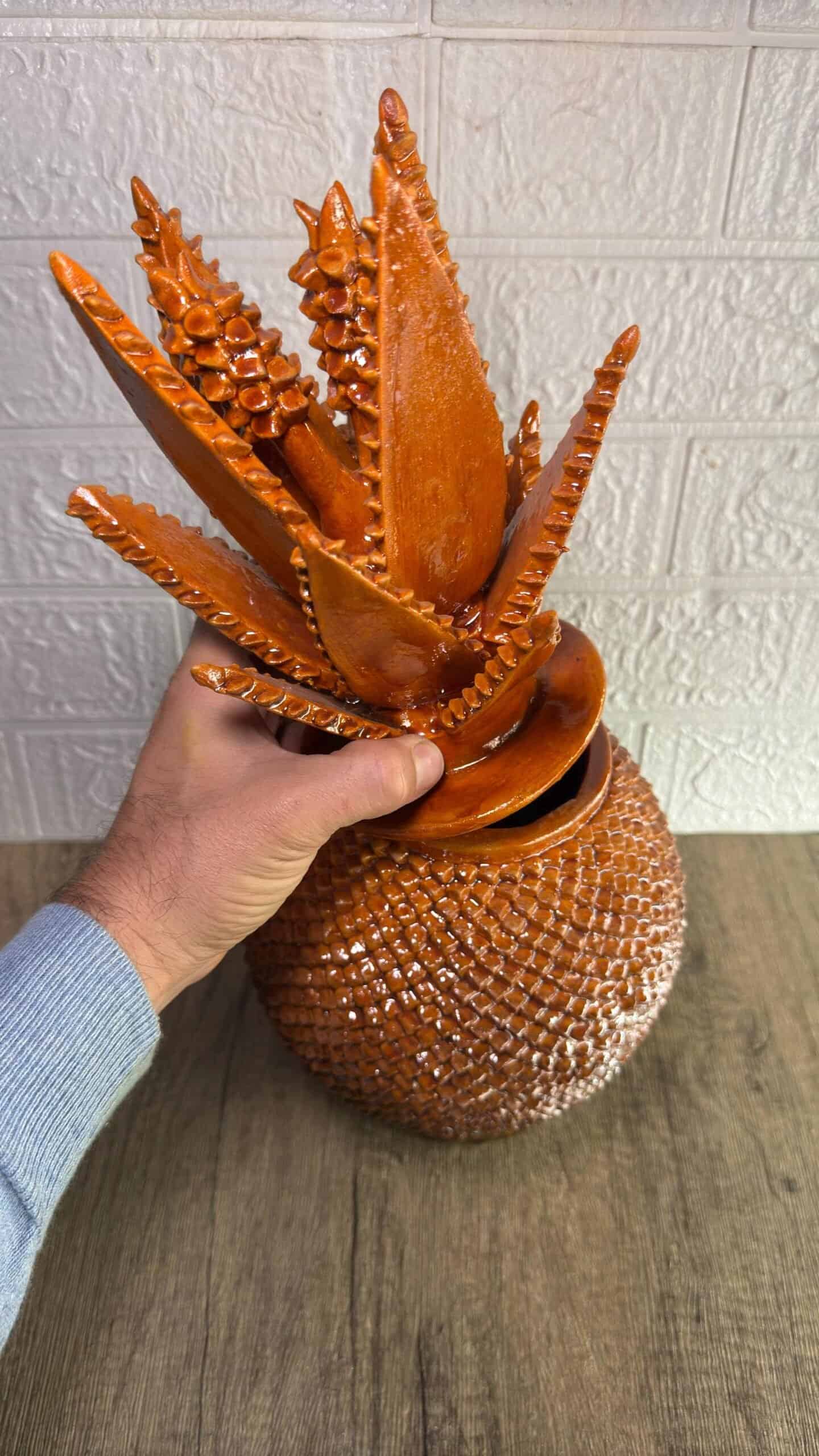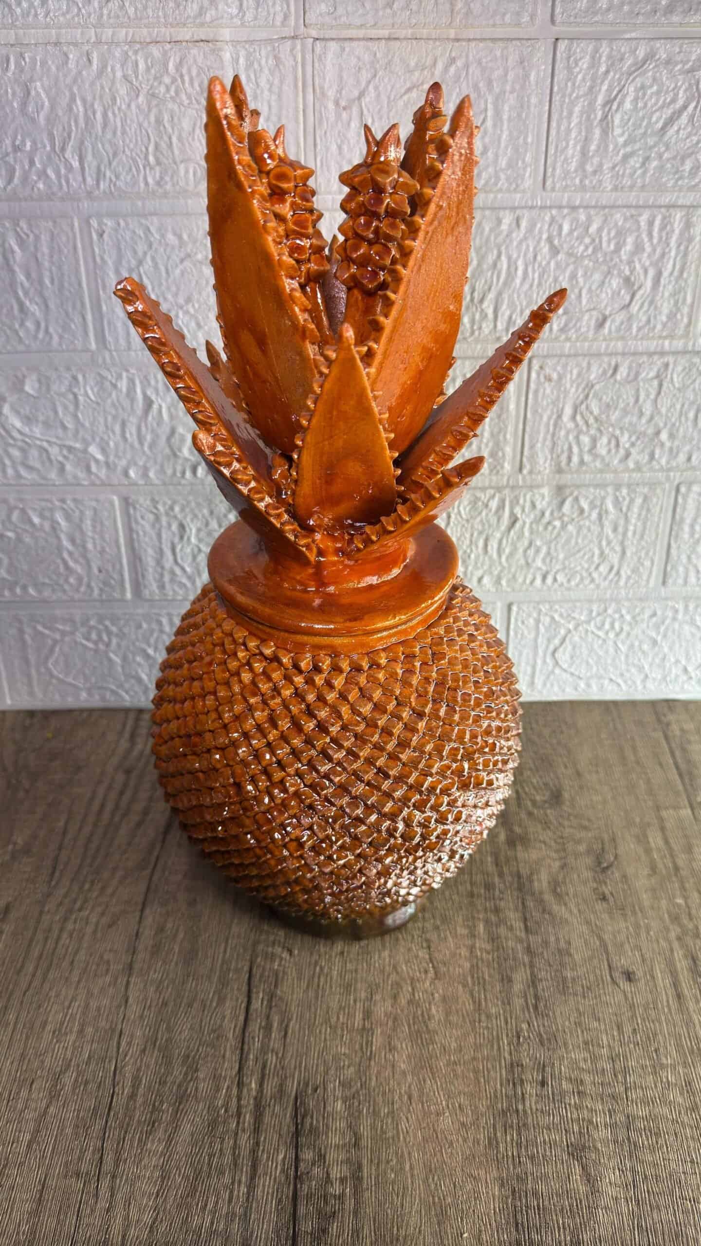 The pineapple sculpture of Michoacan is distinguished in Popular Art in Mexico not only for its quality, but also for the ancestral techniques they use, making a fusion of prehispanic techniques. Glazed clay, named for its glazed, glass-like appearance.