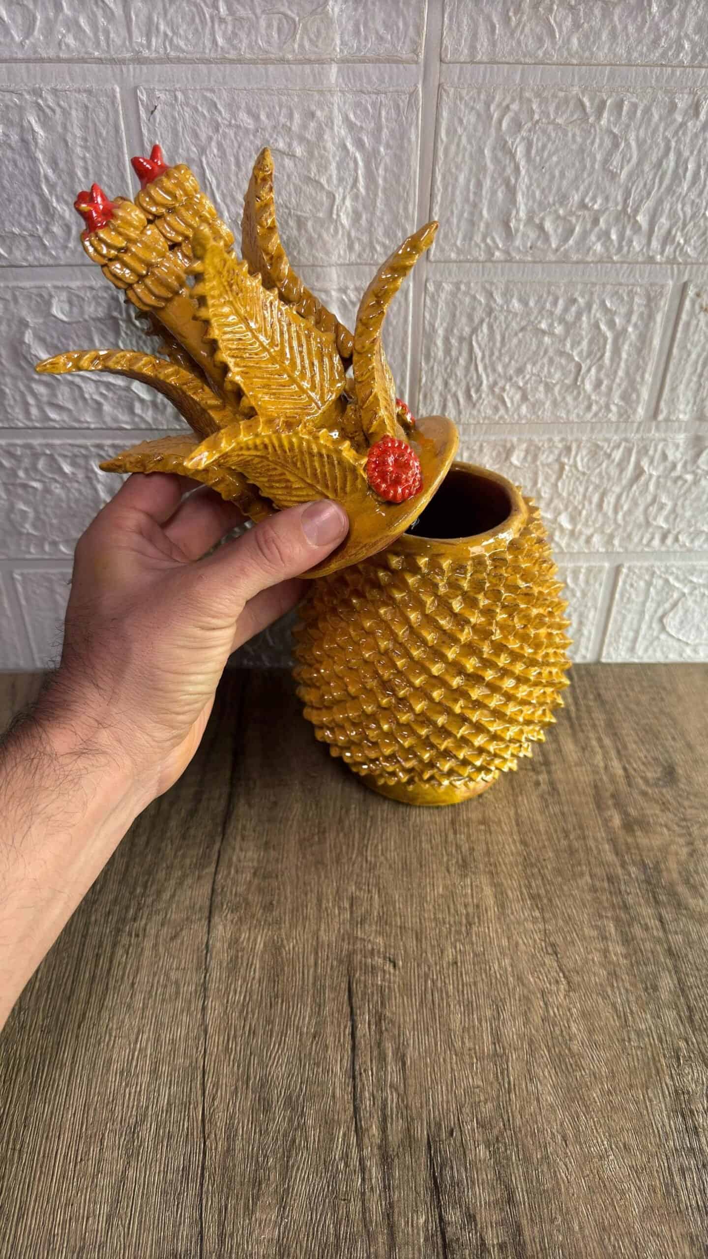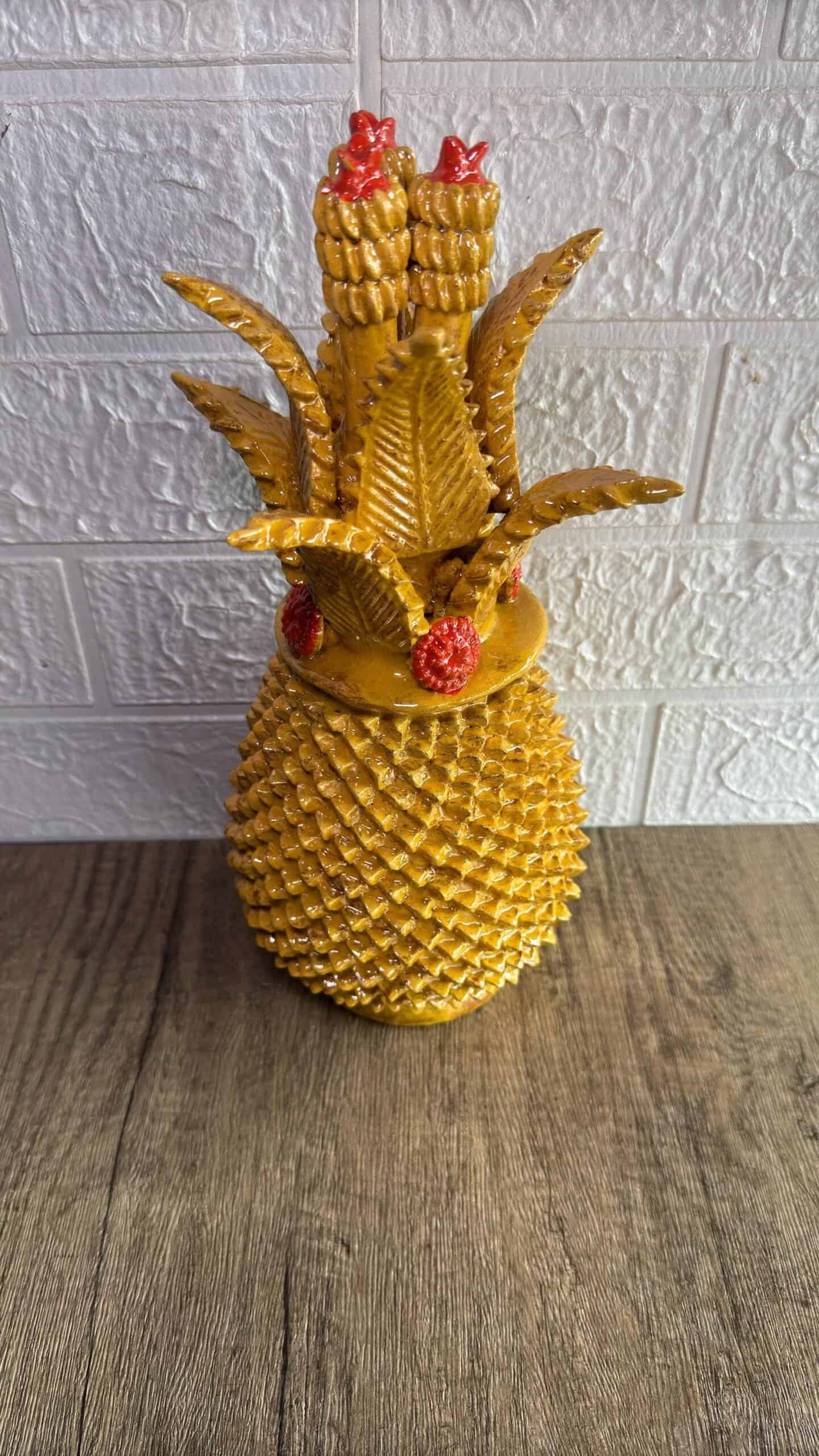 Glazed Pineapple – Mexican folk pottery – Mexican folk art This pineapple decor is a unique piece, each part of the scale is made by hand, by artisans from the state of Michoacan, Mexico. Characteristic: – Size: 6.5” wide, 11” tall – Clay material The pineapple sculpture of Michoacan is distinguished in Popular Art in Mexico not only for its quality, but also for the ancestral techniques they use, making a fusion of prehispanic techniques. Glazed clay, named for its glazed, glass-like appearance. The potters’ process consists of applying to the clay pieces, after their first firing, a film or layer that, after melting in an oven, takes on a crystalline appearance. It is therefore a smooth and waterproof coating achieved in a second firing that must reach 800 °C to 1300 °C. ______________________________________________________________________________________________________________________________________________________________________________________________________________________ This beautiful decoration pineapple can be used as a home decoration, the top of the pinecone can be removed to store items inside. By buying one of these pieces you support the families of artisans who work in this beautiful art. ______________________________________________________________________________________________________________________________________________________________________________________________________________________ IMPORTANT NOTE: – The colors of the pineapple may vary slightly from what is seen in the monitor – Please note that as this is a handmade enameled piece there may be some imperfections. – All our fragile products, we pack them with special materials to guarantee their protection, if there is any problem with your package, please contact us to solve it as soon as possible. ______________________________________________________________________________________________________________________________________________________________________________________________________________________ Order carefully, we will pack ✅ Express shipping is available for an additional charge, please ask ✅ You can send this with a special dedication✅ It can be sent with a special wrapping as a gift (warn)✅ Any questions please do not hesitate, we usually respond in less than an hour 😀