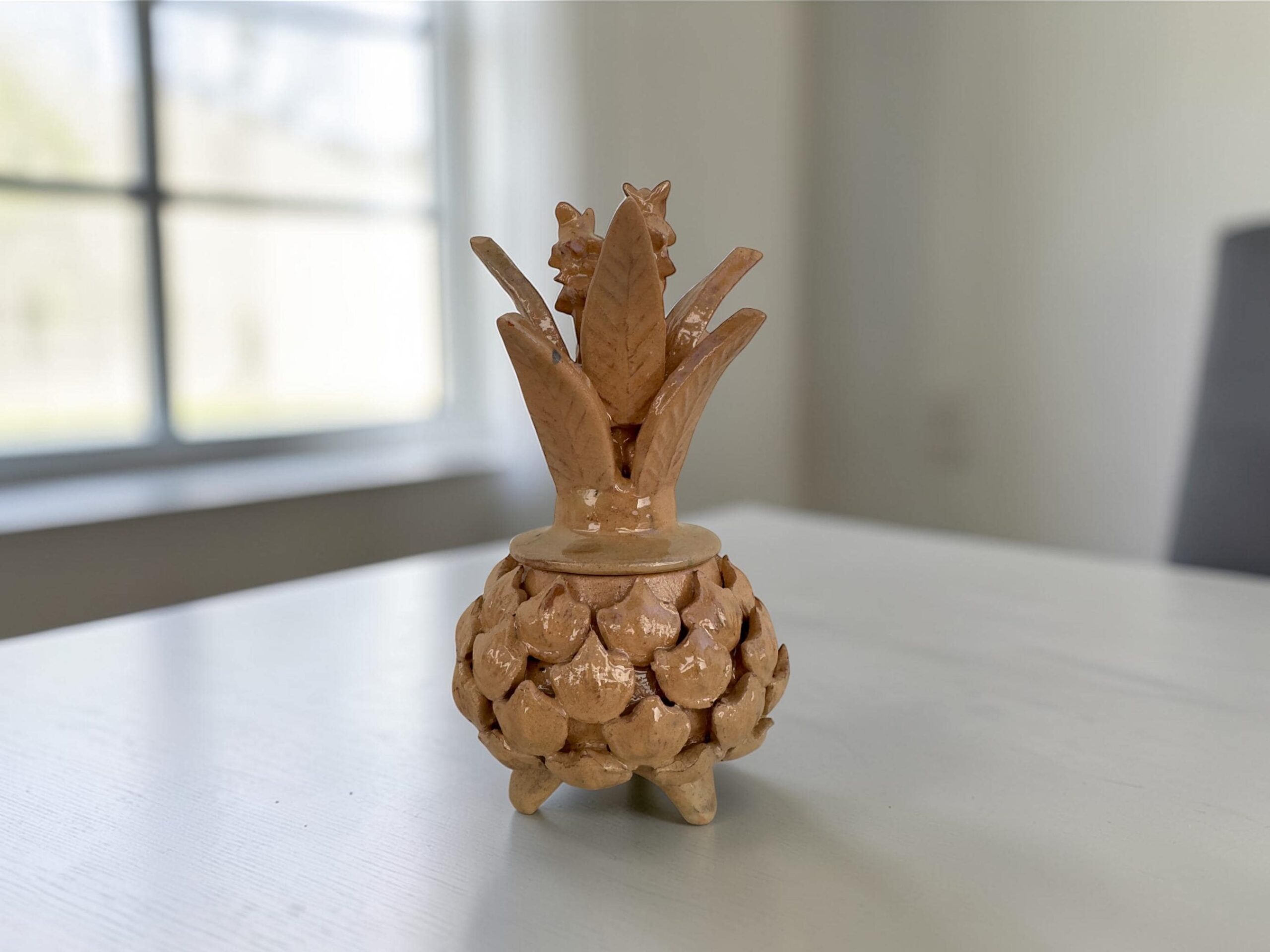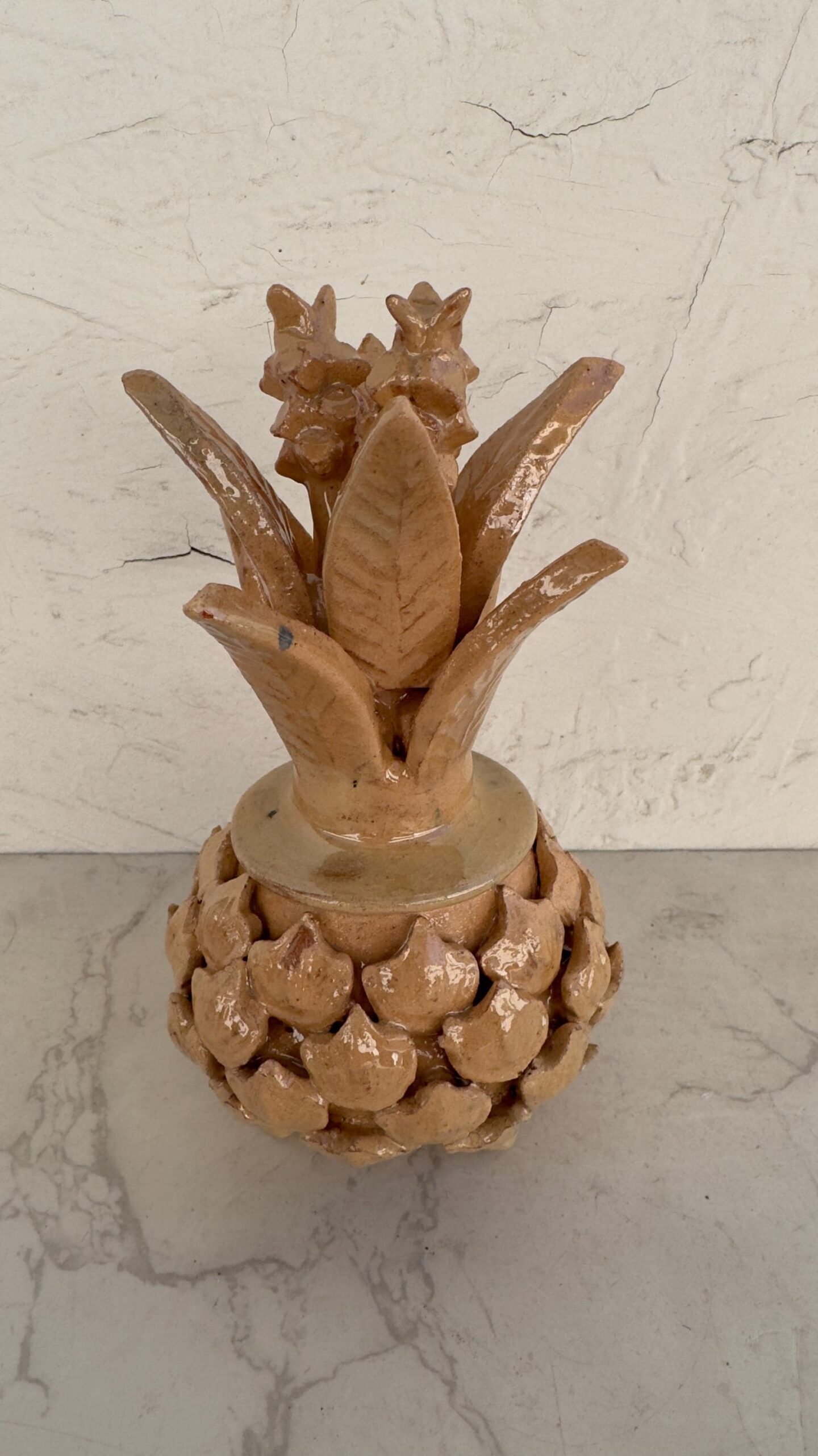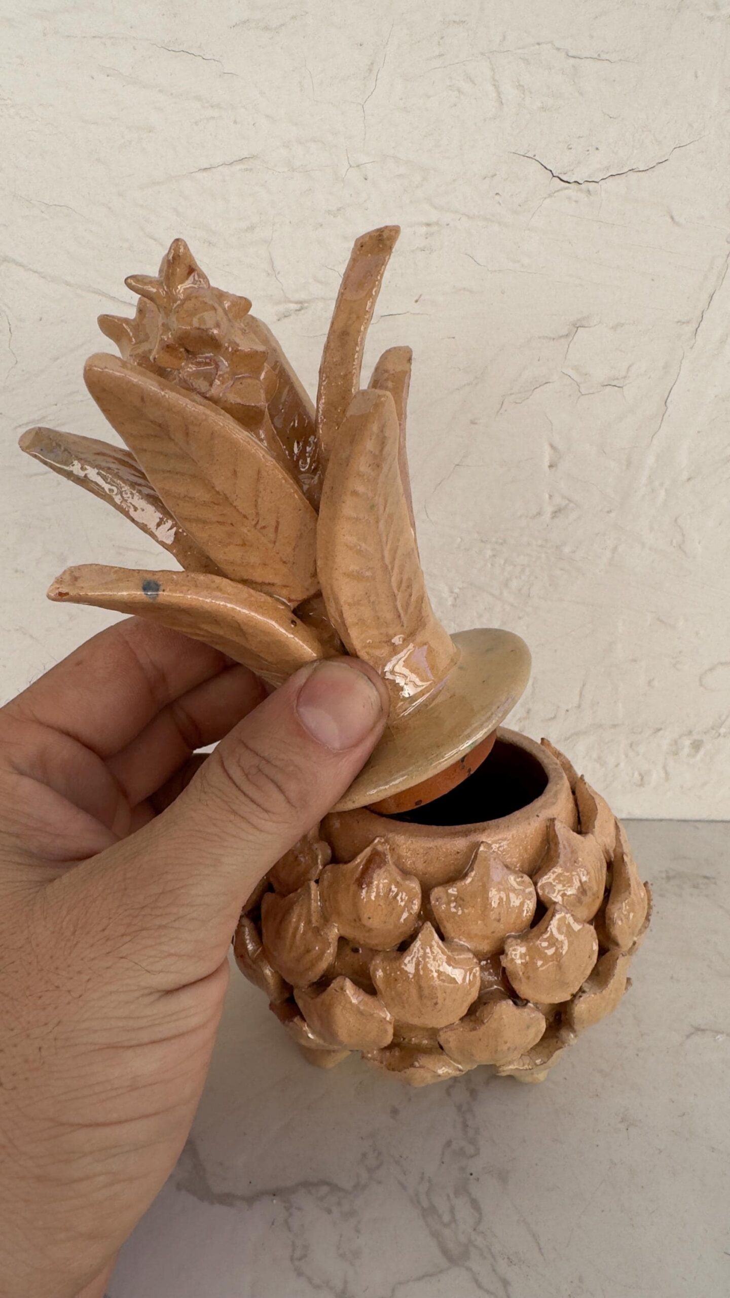 Glazed pineapple – Mexican folk pottery – Mexican folk art This pineapple decor is a unique piece, each part of the scale is made by hand, by artisans from the state of Michoacan, Mexico. Characteristic: – Size: 4” wide, 7” tall – Clay material The pineapple sculpture of Michoacan is distinguished in Popular Art in Mexico not only for its quality, but also for the ancestral techniques they use, making a fusion of prehispanic techniques. Glazed clay, named for its glazed, glass-like appearance. The potters’ process consists of applying to the clay pieces, after their first firing, a film or layer that, after melting in an oven, takes on a crystalline appearance. It is therefore a smooth and waterproof coating achieved in a second firing that must reach 800 °C to 1300 °C. ______________________________________________________________________________________________________________________________________________________________________________________________________________________ This beautiful decoration pineapple can be used as a home decoration, the top of the pinecone can be removed to store items inside. By buying one of these pieces you support the families of artisans who work in this beautiful art. ______________________________________________________________________________________________________________________________________________________________________________________________________________________ IMPORTANT NOTE: – Please note that as this is a handmade enameled piece there may be some imperfections. – All our fragile products, we pack them with special materials to guarantee their protection, if there is any problem with your package, please contact us to solve it as soon as possible. ______________________________________________________________________________________________________________________________________________________________________________________________________________________ Order carefully, we will pack ✅ Express shipping is available for an additional charge, please ask ✅ You can send this with a special dedication✅ It can be sent with a special wrapping as a gift ✅ Any questions please do not hesitate, we usually respond in less than an hour 😀