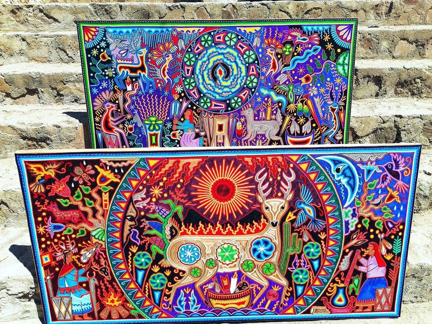 Tables of yarn.- Such compositions expose deep mythological themes of this Mesoamerican ethnic group. It is about thresholds to glimpse the hermetic universe of the deities of the deep Mexico according to the perspective of the Huichol indigenous people. The Huichol culture is guided by pre-Columbian shamanic traditions linked to ceremonies carried out in its historical past. The jicuri (peyote) is the centerpiece of Huichol ritualism, revered for its healing properties and its ability to illuminate whoever participates in it.