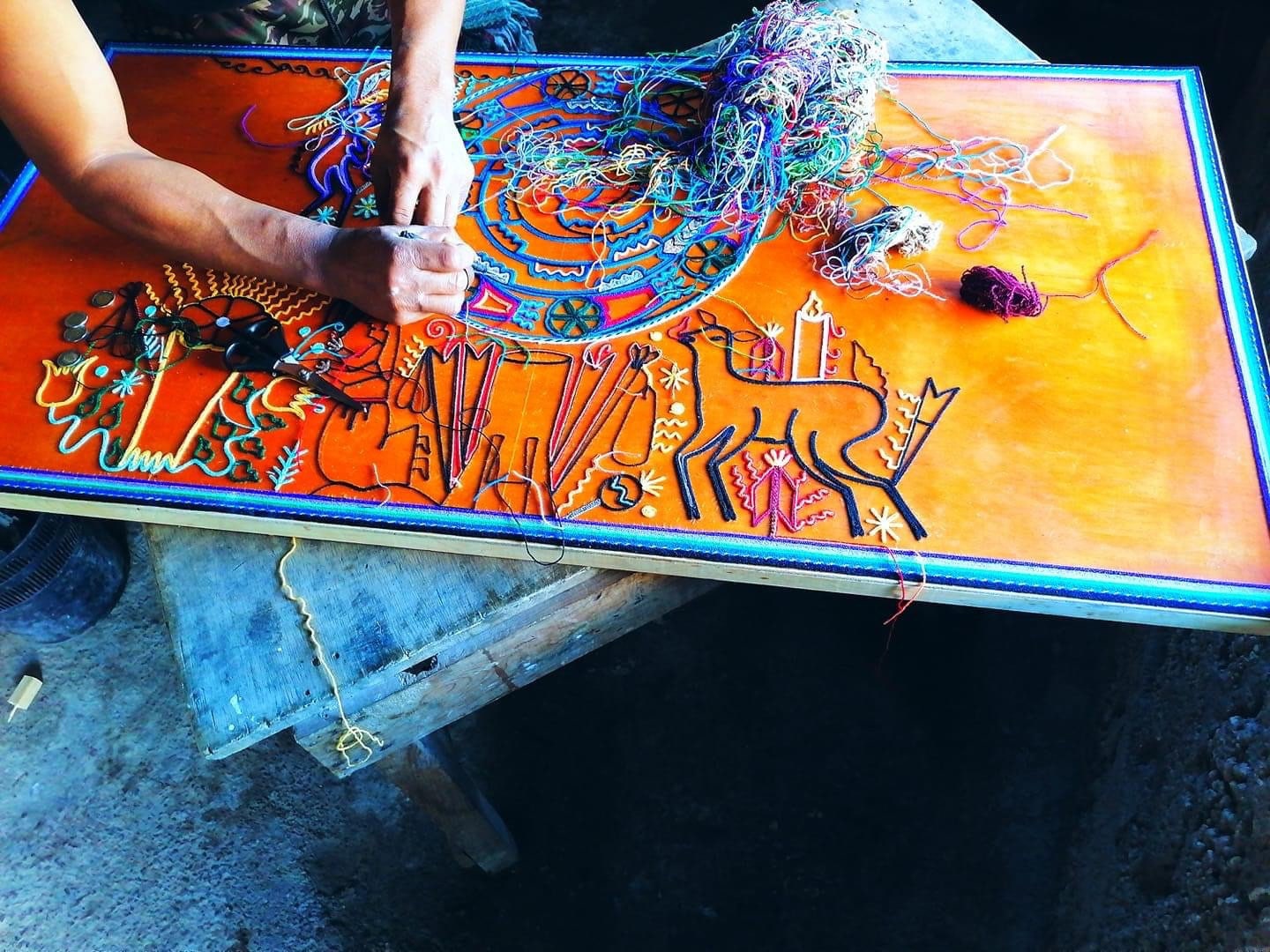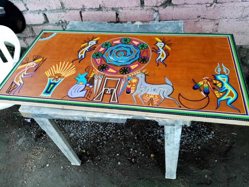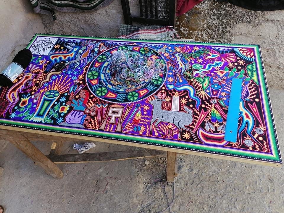 The making of the Huichol stamen tables are true multicolored stamen paintings, the stamen is glued with Campeche wax (beeswax), where the Huichols express the visions they have during their rituals, their stories and religion.