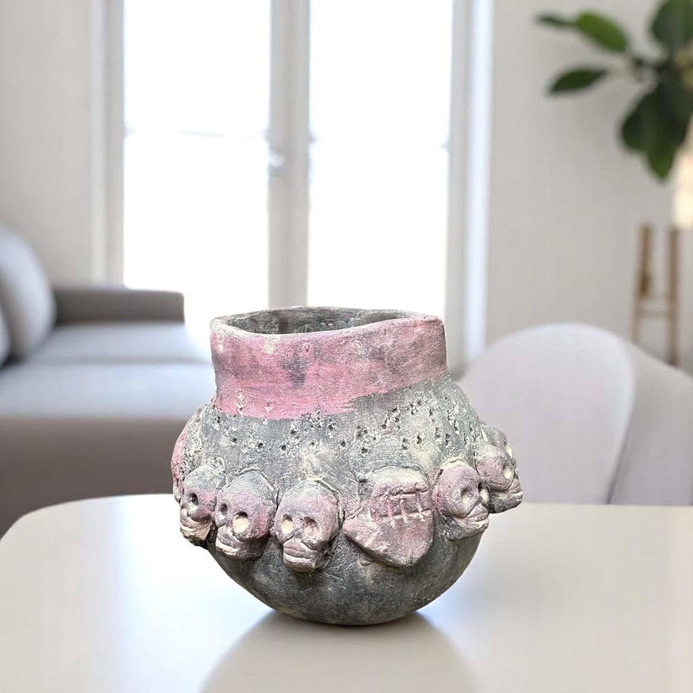 This unique clay figurine is a handcrafted representation of Mictlantecuhtli, the Aztec god of death, carefully made by artisans in Mexico. Mictlantecuhtli, revered in ancient Mexica culture, is known as the ruler of Mictlán, the underworld, where souls journey after death. The figurine showcases intricate details, such as skeletal features and traditional motifs, symbolizing the deep connection between life, death, and the afterlife. The piece is painted in earth tones with subtle pigments, giving it an authentic, weathered look that highlights the artistry and cultural significance behind it. The distressed finish evokes the ancient origins of this powerful deity, making it a perfect addition to collections of Mexican folk art, spiritual altars, or culturally inspired home décor. Whether you are a collector of pre-Hispanic art or someone looking for a meaningful and unique piece, this Mictlantecuhtli sculpture embodies a piece of Mexico’s rich cultural heritage. Each figurine is crafted with care and passion, ensuring that no two pieces are exactly alike. Bring a touch of ancient tradition and mystique into your space with this one-of-a-kind Mexican clay figurine.