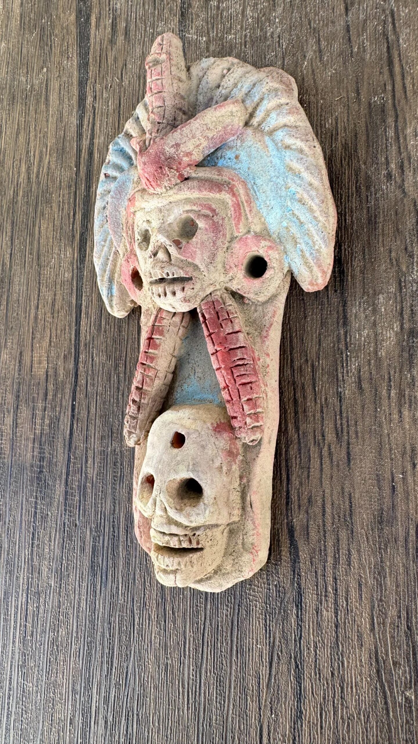 The piece is painted in earth tones with subtle pigments, giving it an authentic, weathered look that highlights the artistry and cultural significance behind it. The distressed finish evokes the ancient origins of this powerful deity, making it a perfect addition to collections of Mexican folk art, spiritual altars, or culturally inspired home décor.