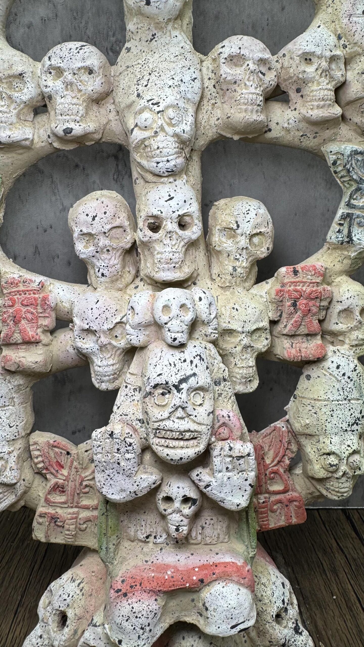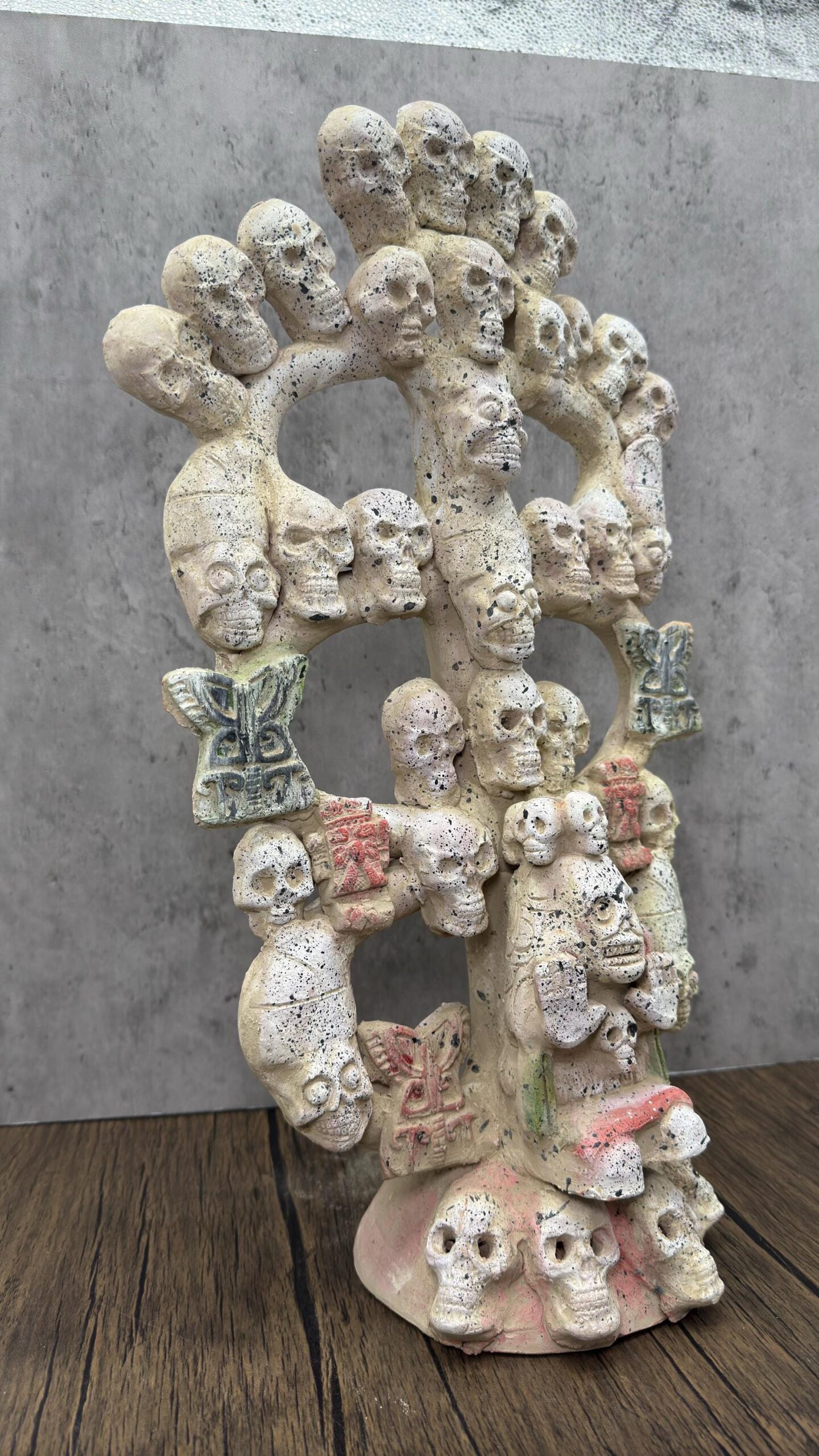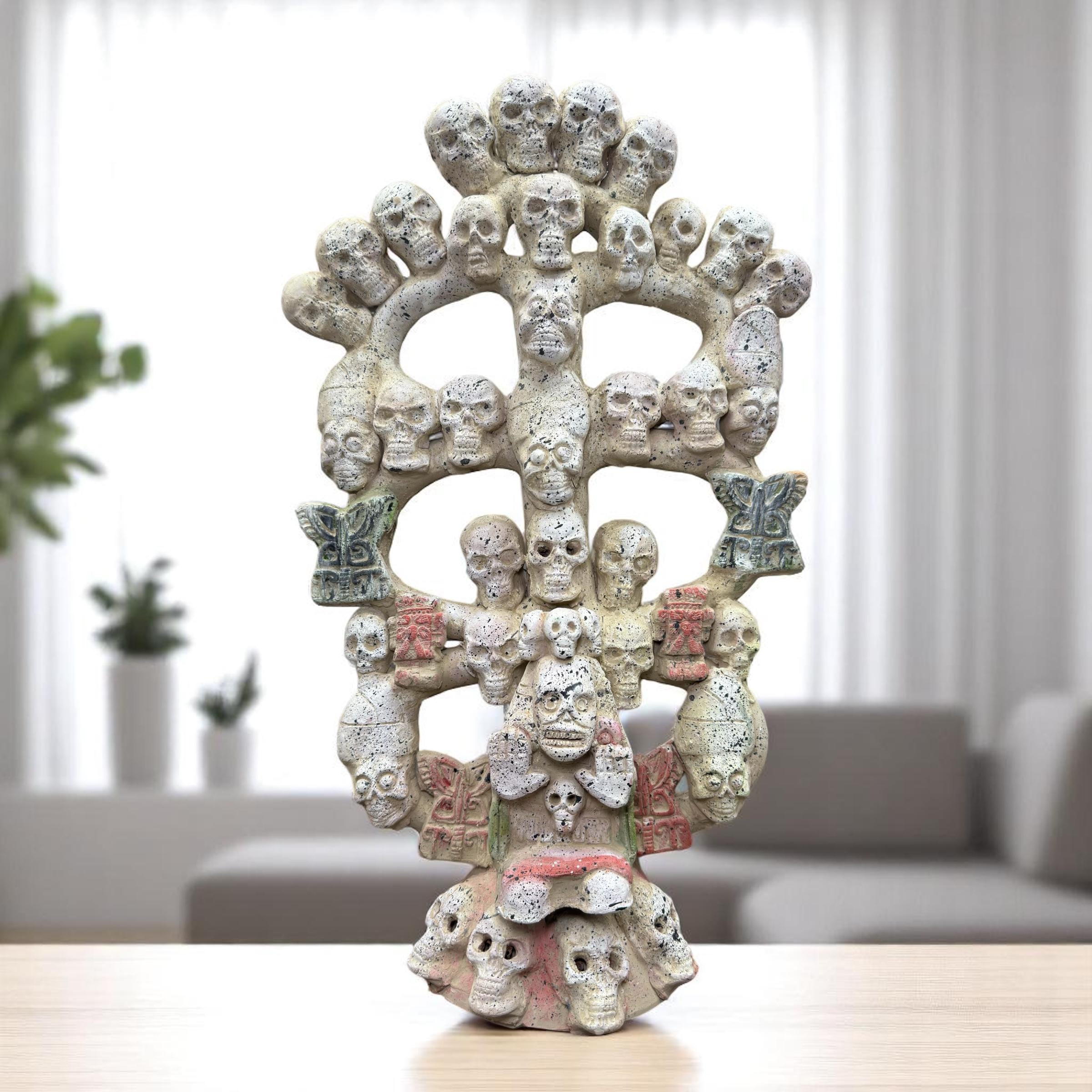 **Tree Of Death Clay Figurine of Mictlantecuhtli, God of Death – Mexican Folk Art** Specifications: -made of clay -prehispanic style -estado de Mexico -Dimensions: 11” wide, 20” tall