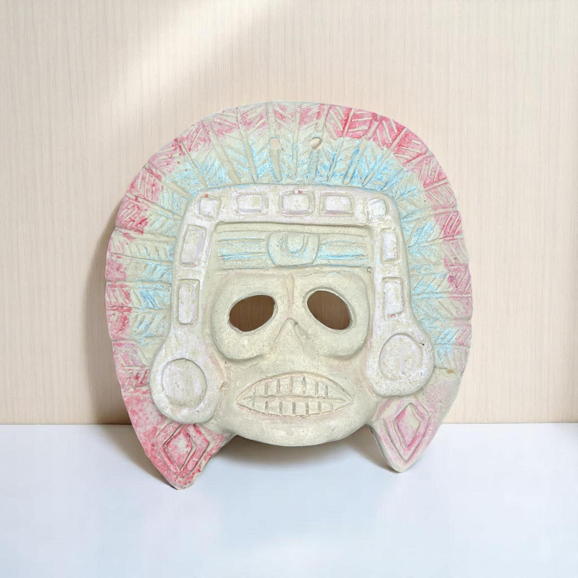 This mask is a representation of Mictlantecuhtli, the Aztec god of the underworld and death. In Mexica mythology, Mictlantecuhtli ruled over Mictlan, the lowest level of the underworld, where souls of the dead journeyed after passing through nine challenging levels. His image is often depicted with skeletal features, as seen in this mask adorned with skulls, symbolizing his dominion over death and the afterlife. The skulls and intricate details on the headdress reflect the deep cultural reverence and fear associated with Mictlantecuhtli. The Aztecs believed that he played a crucial role in maintaining the balance of life and death, guiding souls through the afterlife and overseeing rituals related to death. This handcrafted mask is an impressive piece that embodies the rich symbolism and artistic tradition of the pre-Columbian era. Its striking design and bold colors make it a captivating decorative element while also serving as a significant cultural artifact. Ideal for collectors of indigenous art or those looking to connect with ancient Mesoamerican history, this mask offers more than just aesthetic appeal—it carries a deep story of spiritual beliefs and traditions. Display it as a unique conversation piece that pays homage to the powerful imagery and mythology of the Mexica civilization.