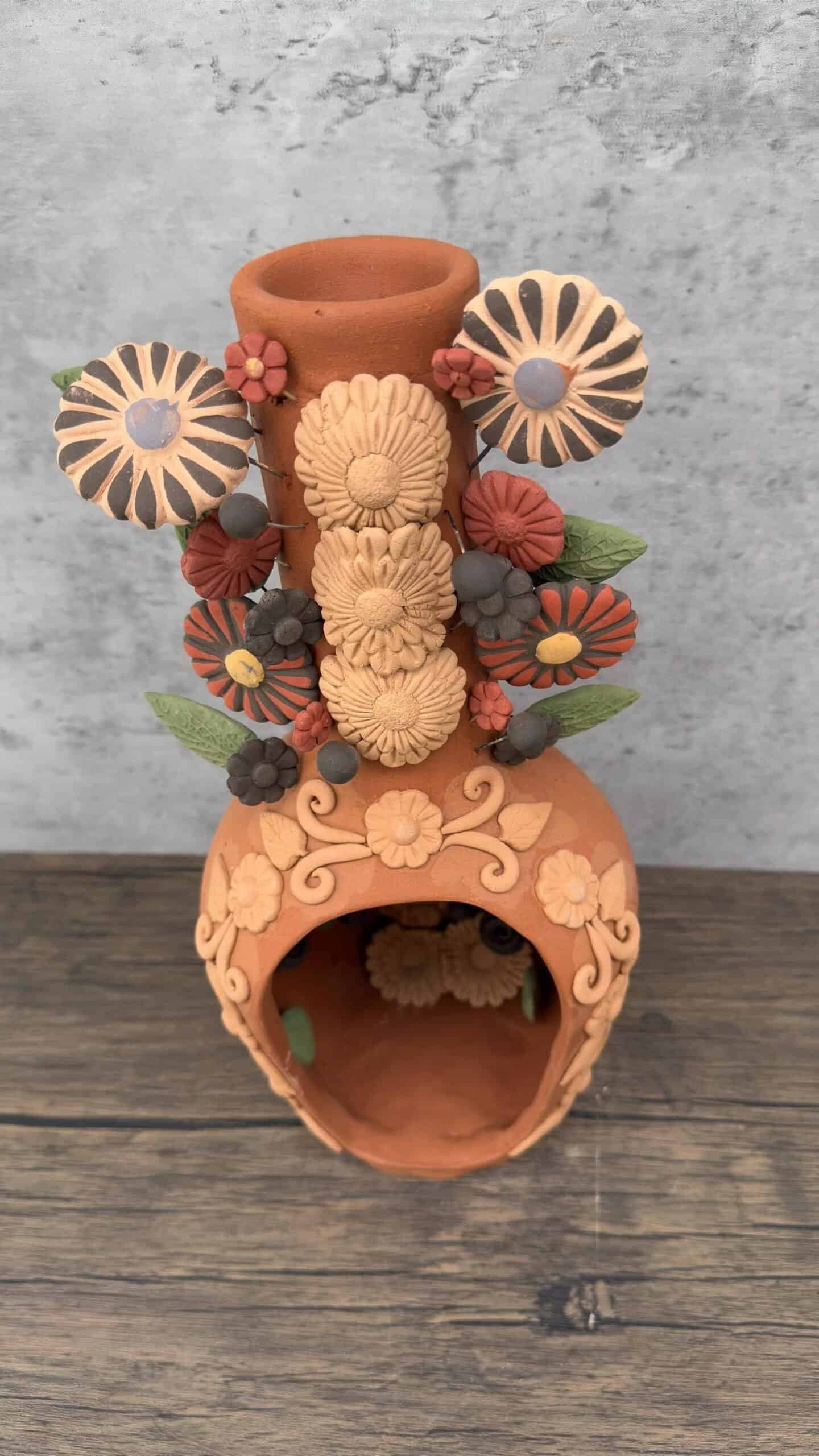 “ Mini Chimney Filifrana Or Pastillaje Technique“ – Handmade by Mexican artisans Oaxaca – Natural clay, Red clay – Measures 12” tall 2.5” hole top surface 3.5” middle hole Experience the warmth of Oaxacan artistry with this unique mini indoor fireplace, handcrafted using the traditional “Pastillaje” or “Filigrana” technique. Made from the finest natural and red Oaxacan clay, this piece not only provides warmth but also serves as a stunning element of decor. Each fireplace is meticulously sculpted by hand, showcasing the exquisite detail and craftsmanship that Oaxacan artisans are renowned for. The “Pastillaje” technique involves layering thin strips of soft clay into complex patterns, creating a delicate filigree effect that is both visually striking and texturally rich. The contrasting hues of the natural and red clay enhance these designs, making each fireplace a vibrant centerpiece in any room. This mini fireplace is designed for indoor use, perfect for adding a cozy ambiance to your living space. It is equipped with a small opening to accommodate safe, eco-friendly fuel options, ensuring a clean burn without smoke. Ideal for those who cherish unique, handcrafted items, this mini fireplace marries functionality with art, embodying the spirit of traditional Mexican craftsmanship. It is an exceptional choice for anyone looking to infuse their home with warmth, beauty, and cultural heritage. — This description emphasizes the unique craftsmanship, functionality, and cultural significance of the mini indoor fireplace, appealing to customers interested in home decor that combines aesthetic appeal with practical use.