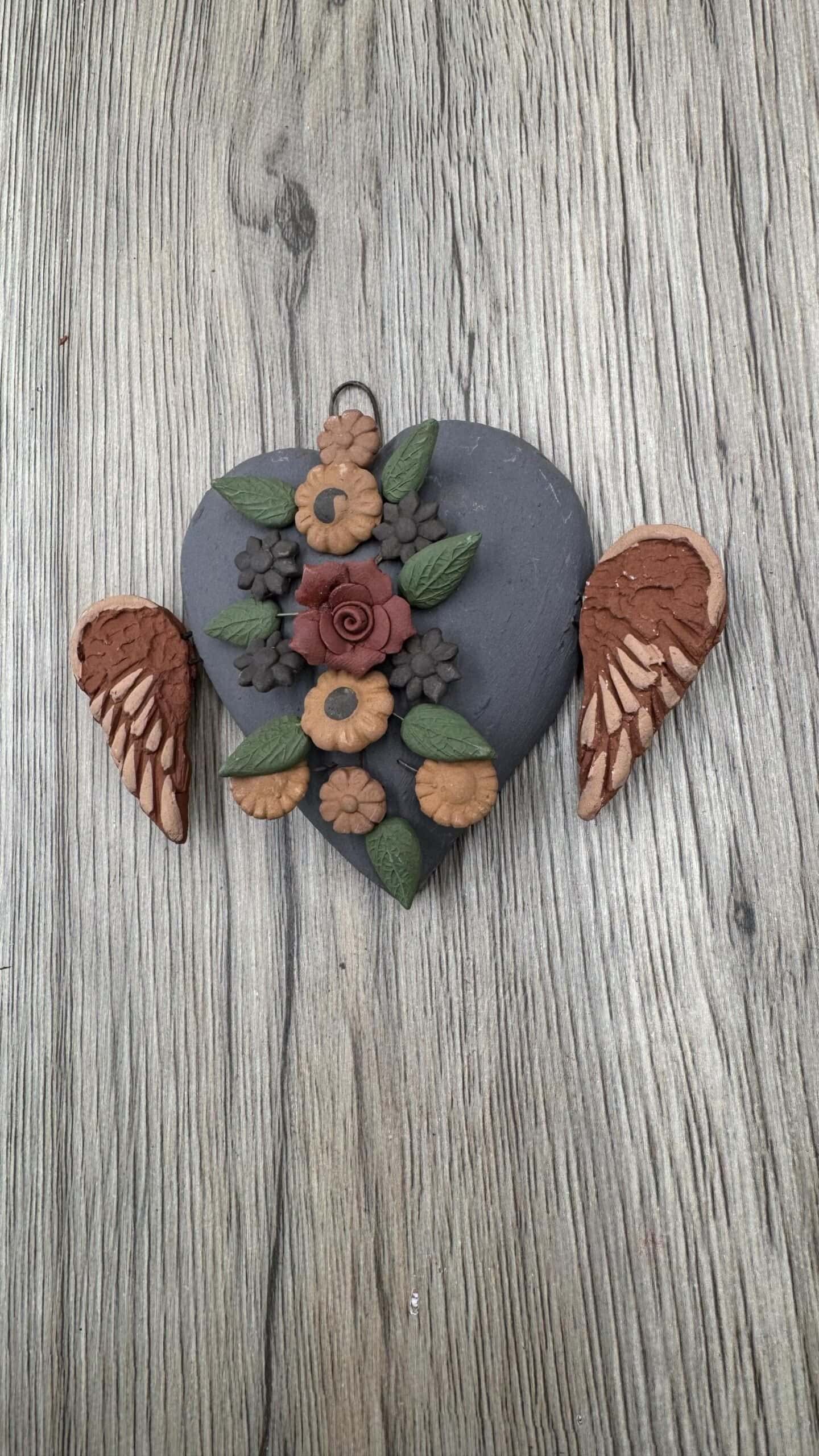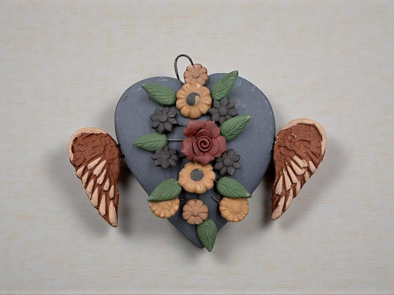 The heart features delicate floral elements sculpted entirely by hand, giving every pendant its own unique character. No molds are used, which means no two pieces are ever exactly alike. The raised details and textured flowers create depth and dimension, making it a meaningful decorative accent for any space.