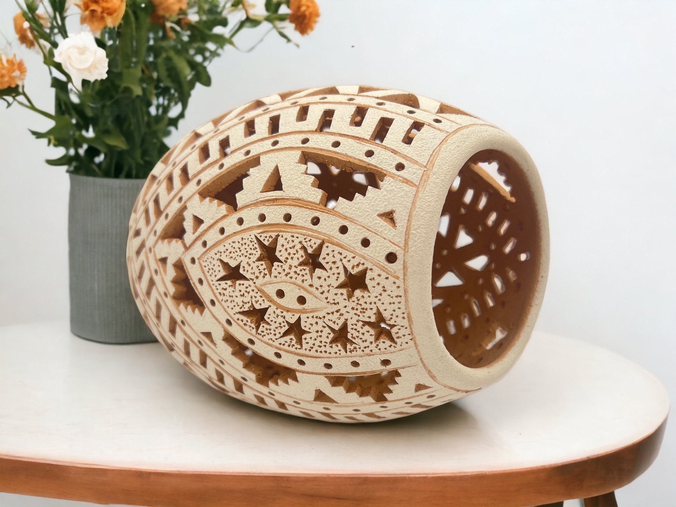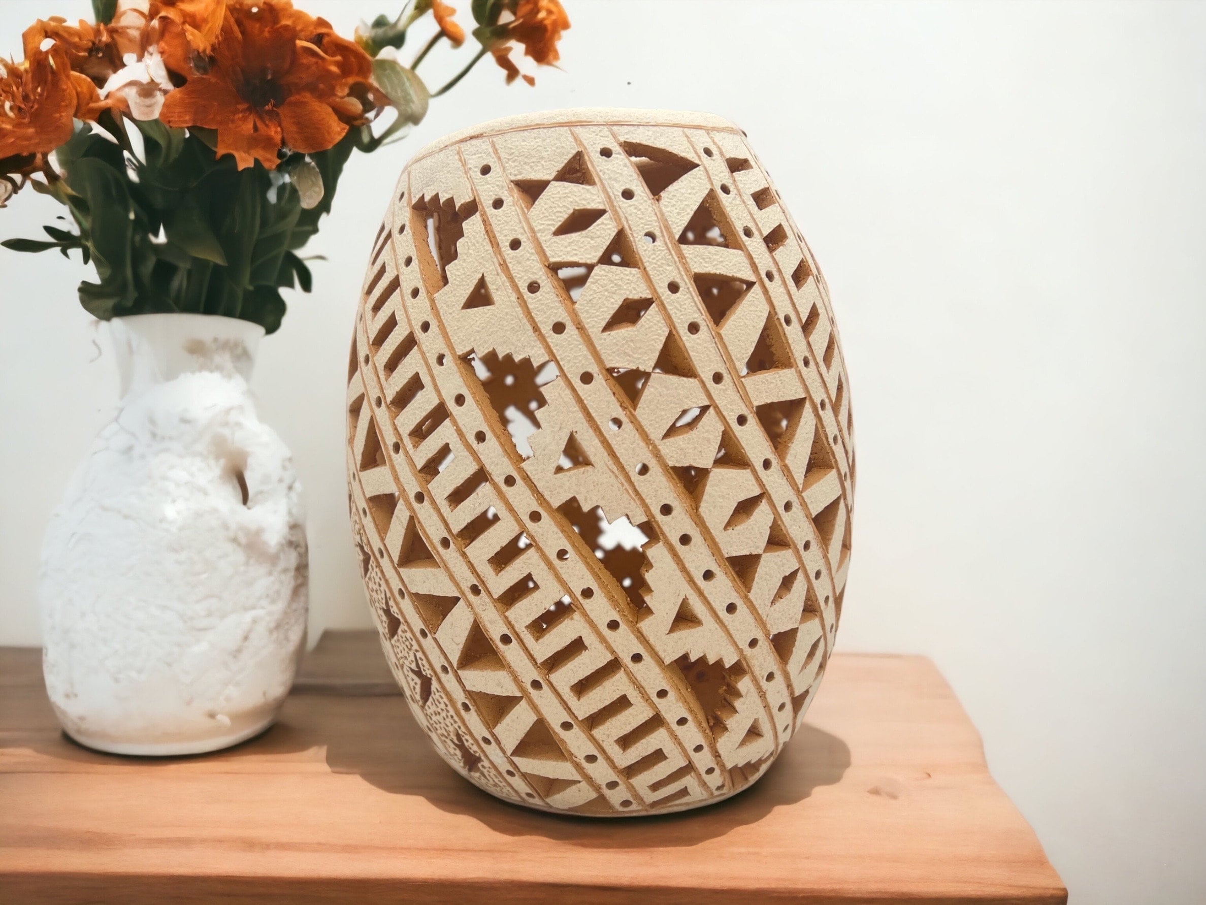 The contrasting colors of white and brown clay create a striking visual appeal that effortlessly blends rustic charm with modern elegance. Each stroke and pattern on the vase reflects the meticulous craftsmanship and attention to detail invested by the artisans.