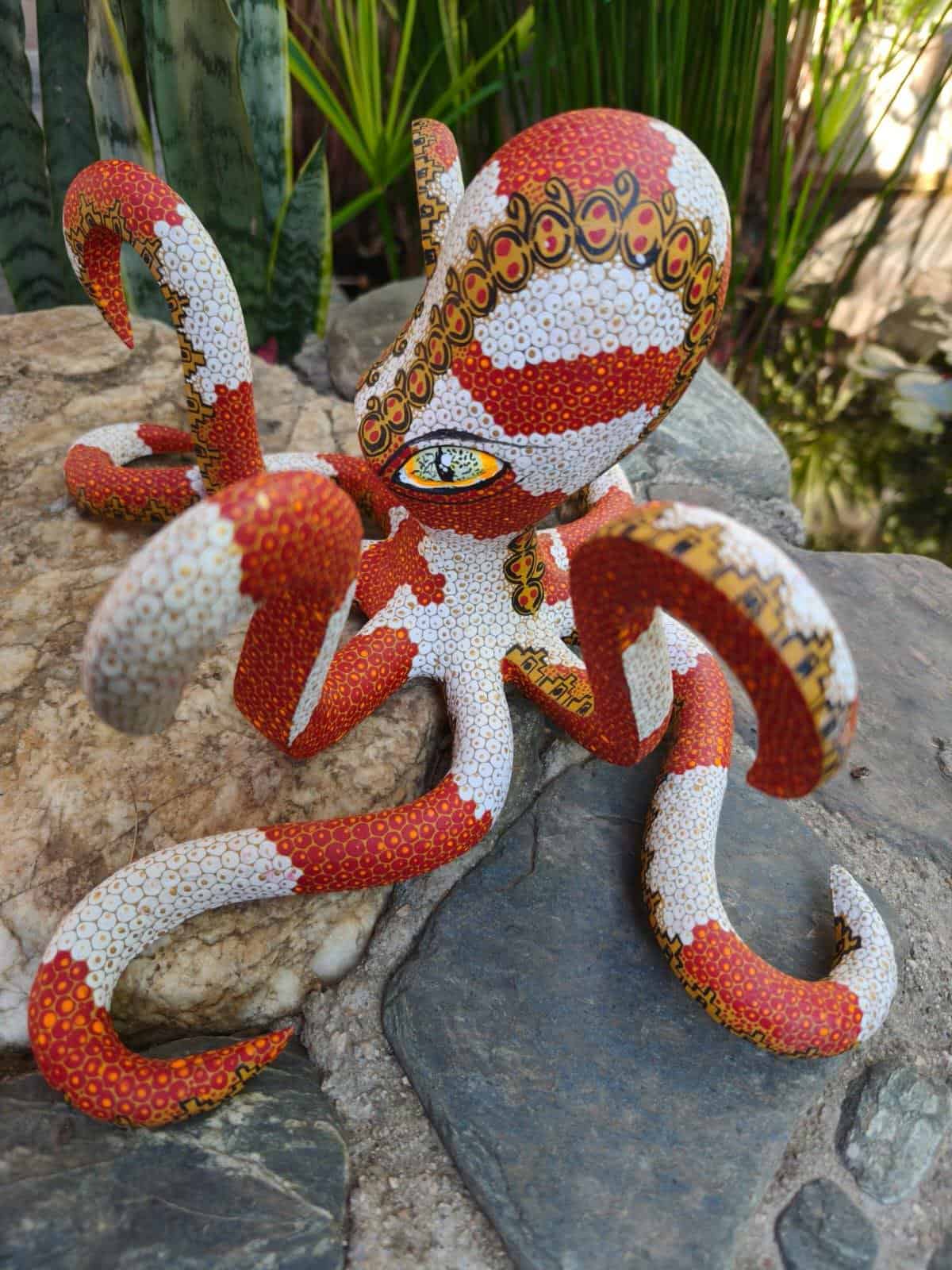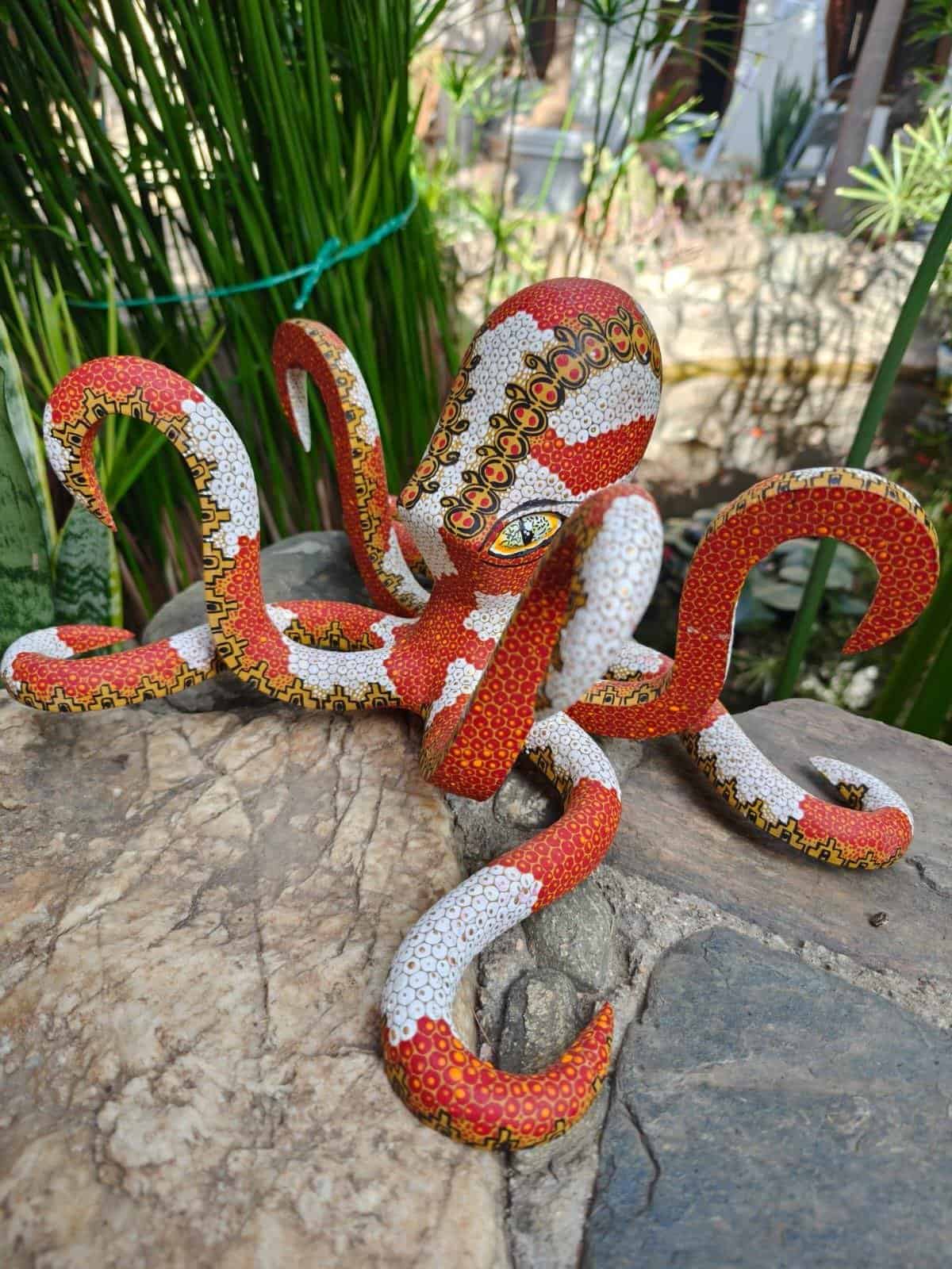 “ Optopus figure – Alebrije – Carved in wood “ Item Description: * Made in Mexico * Made in Oaxaca by native indigenous people * Folk art Item details: * Made of copal wood * Carved and painted by hand * Measures: Long:13” Tall:6.5” Wide:11 (IT’S ONLY ONE PIECE, SELECT THE ONE YOU LIKE THE MOST) The ALEBRIJE is a type of handicraft native to Mexico, also called Nahuatkzosquit. These are handicrafts made with the carpentry technique and carved in copal wood that are painted with mostly cheerful and vibrant colors. ALEBRIJES are imaginary beings composed of physiognomic elements of different animals, a combination of several animals, not only fantastic but also real that form an amazing being. Alebrijes represent the innovative spirit and creative soul of Oaxaca, Mexico, where the ancestral tradition was created. The pieces, unreal and magical, are the most captivating in the AZTECA country and valued for their originality and extravagance “This alebrije is ideal as a Mexican decoration” Place your order carefully, we will pack it ✅ Product in shipped in box ✅ Priority Mail Shipping 3-5 business days✅ Express shipping is available for an additional charge, please inquire ✅ You can send this with a special dedication✅ It can be sent with a special gift wrapping (notify) ✅ Any questions do not hesitate, we usually respond in less than an hour 😀.