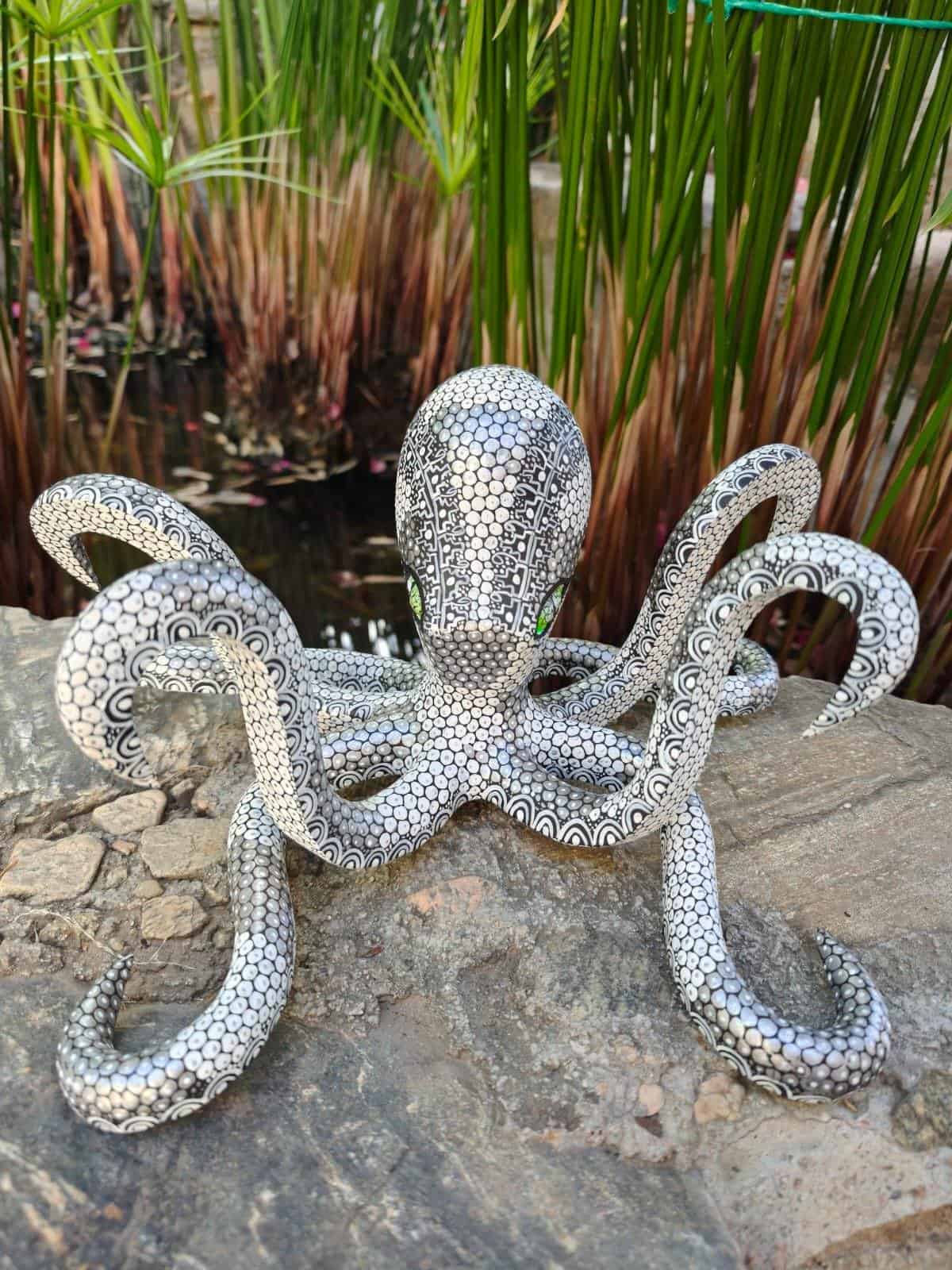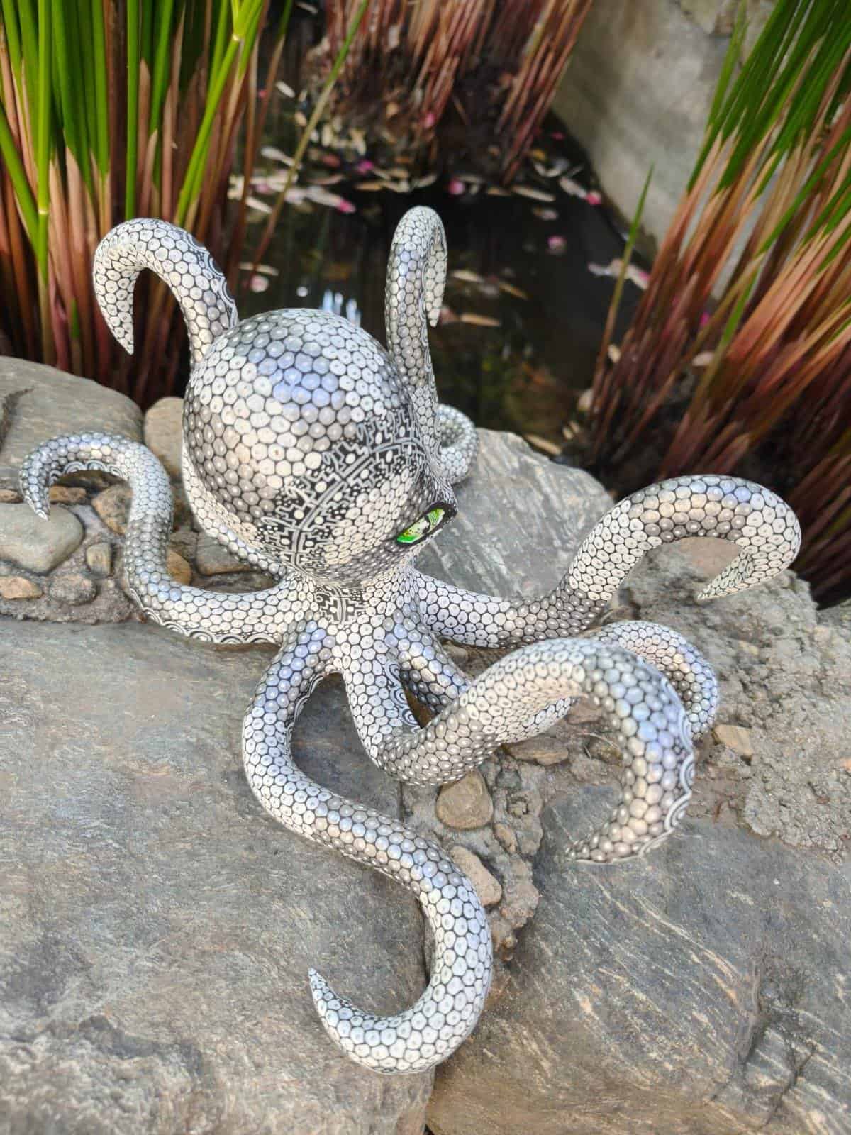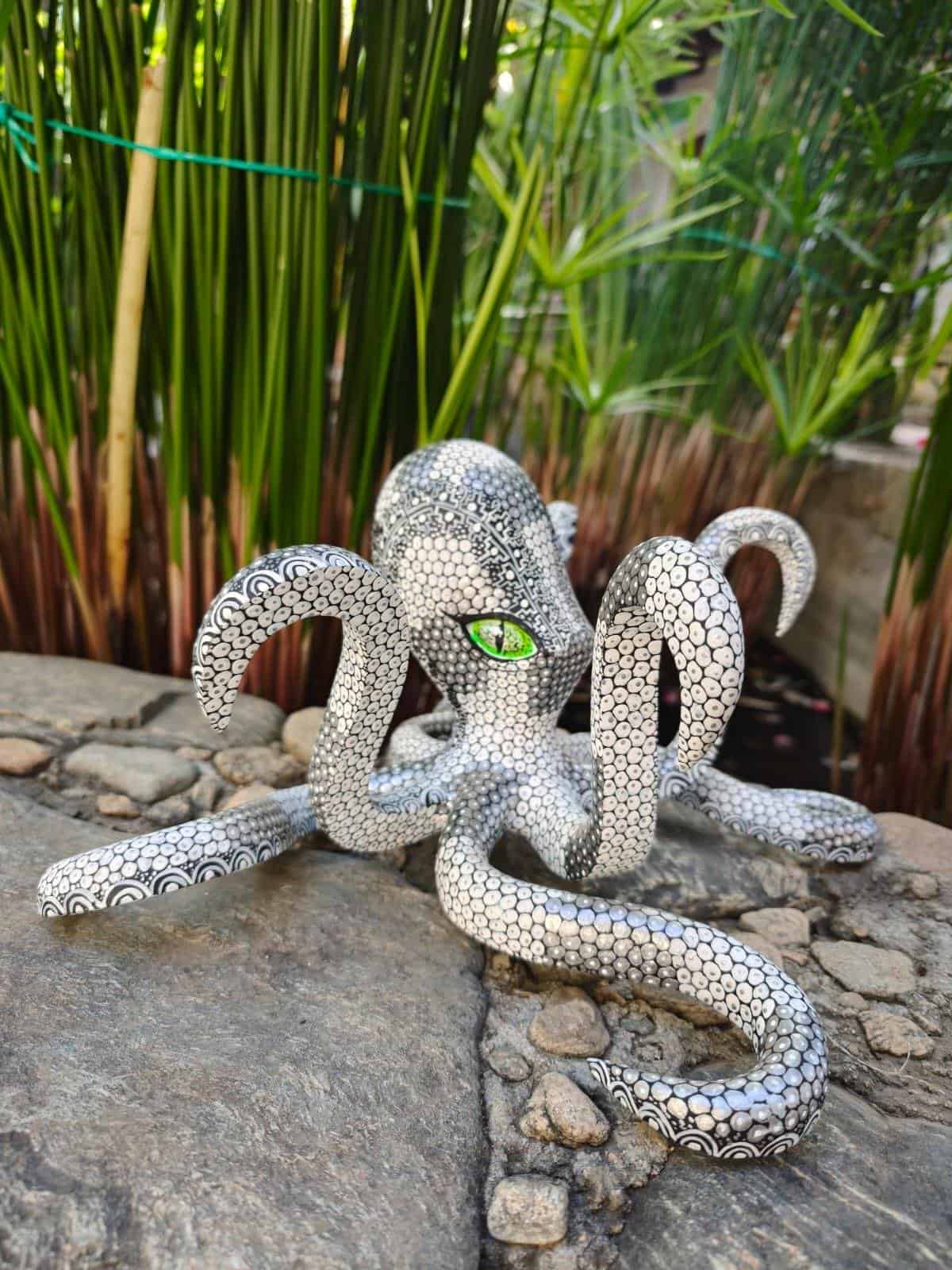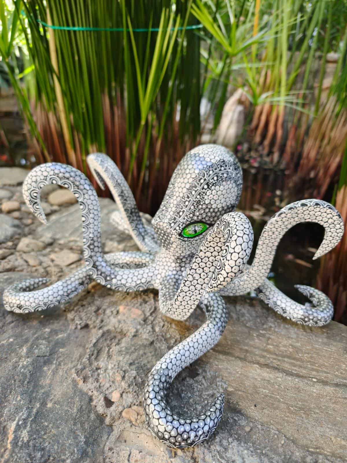 “ Optopus figure – Alebrije – Carved in wood “ Item Description: * Made in Mexico * Made in Oaxaca by native indigenous people * Folk art Item details: * Made of copal wood * Carved and painted by hand * Measures: Long:13” Tall:6.5” Wide:11 (IT’S ONLY ONE PIECE, SELECT THE ONE YOU LIKE THE MOST) The ALEBRIJE is a type of handicraft native to Mexico, also called Nahuatkzosquit. These are handicrafts made with the carpentry technique and carved in copal wood that are painted with mostly cheerful and vibrant colors. ALEBRIJES are imaginary beings composed of physiognomic elements of different animals, a combination of several animals, not only fantastic but also real that form an amazing being. Alebrijes represent the innovative spirit and creative soul of Oaxaca, Mexico, where the ancestral tradition was created. The pieces, unreal and magical, are the most captivating in the AZTECA country and valued for their originality and extravagance “This alebrije is ideal as a Mexican decoration” Place your order carefully, we will pack it ✅ Product in shipped in box ✅ Priority Mail Shipping 3-5 business days✅ Express shipping is available for an additional charge, please inquire ✅ You can send this with a special dedication✅ It can be sent with a special gift wrapping (notify) ✅ Any questions do not hesitate, we usually respond in less than an hour 😀.