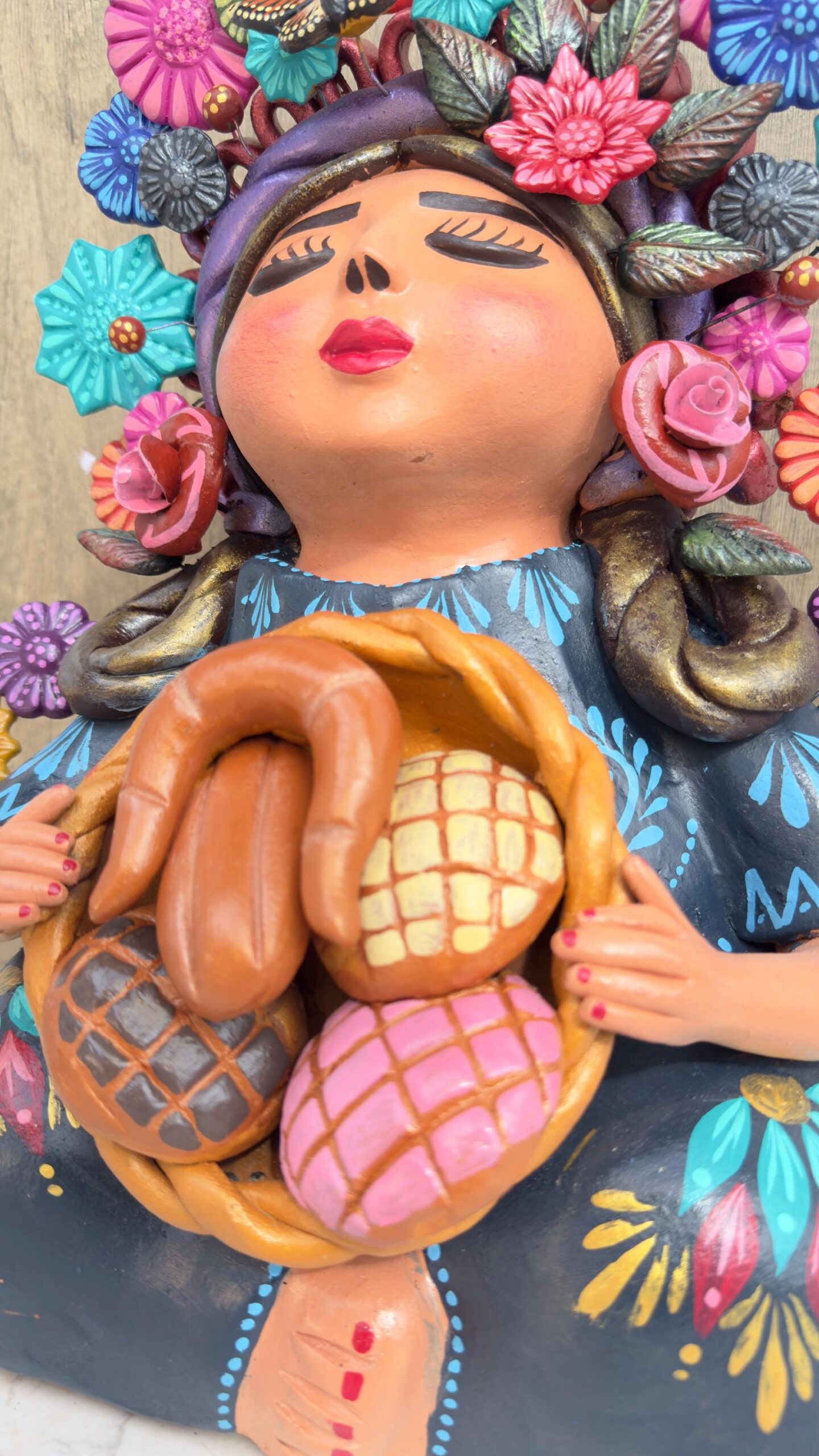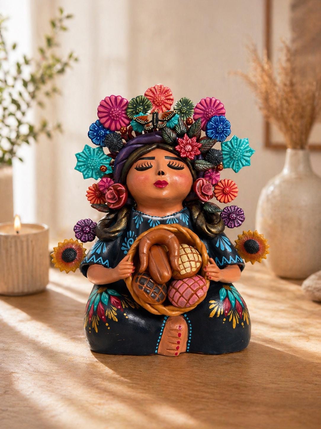Pachamama Madre Tierra – Handmade by Mexican artisans – Polychrome clay material – natural clay – Dimentions 15.8” Tall Bring the sacred essence of Mother Earth into your home with this stunning handmade Pachamama sculpture, inspired by Mexican indigenous culture. Pachamama, known as the goddess of fertility, life, and harmony, represents the deep connection between humanity and nature. This unique clay figurine features a serene mother figure embracing a child, symbolizing protection, nurturing, and love. Adorned with vibrant hand-painted floral patterns, butterflies, and traditional details, this sculpture is perfect for creating a peaceful and spiritual ambiance in any space. Each detail is carefully crafted by skilled artisans, making every piece truly one-of-a-kind. Ideal for boho, rustic, or eclectic home decor, this Mexican folk art sculpture also makes a meaningful gift for spiritual seekers, mothers, or art collectors. Place it on an altar, meditation space, or living room for a touch of cultural beauty and positive energy. Celebrate the power of the feminine spirit and the wisdom of nature with this beautiful Pachamama statue. A timeless reminder of balance, love, and connection to the earth.