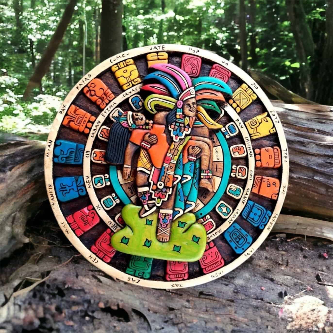 “ Mexican painting for wall or table, inspired by Mayan art, Mayan calendar, Popocatepetl and Iztaccíhuatl ” Hand Carved by Mexican Artisans, 3D Wood Carving Design.