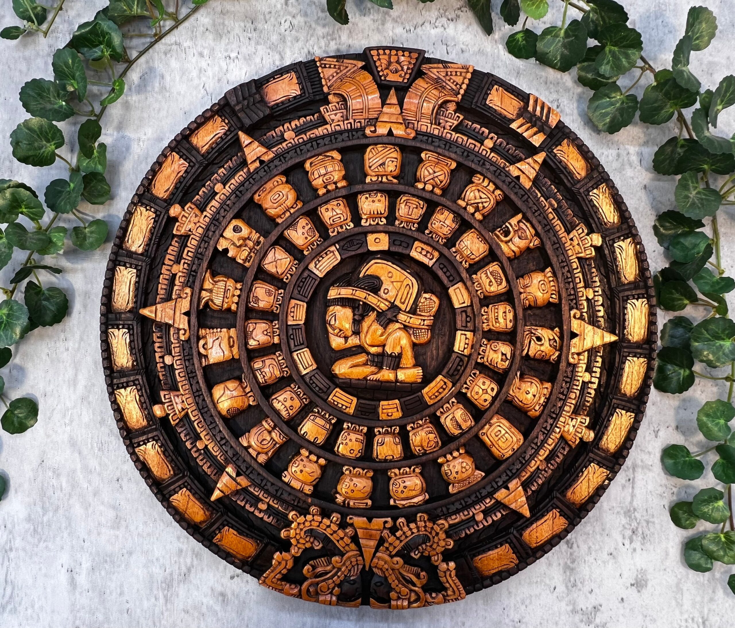 “ Mexican painting for wall or table, inspired by Mayan art, Mayan calendar ” Hand Carved by Mexican Artisans, 3D Wood Carving Design.