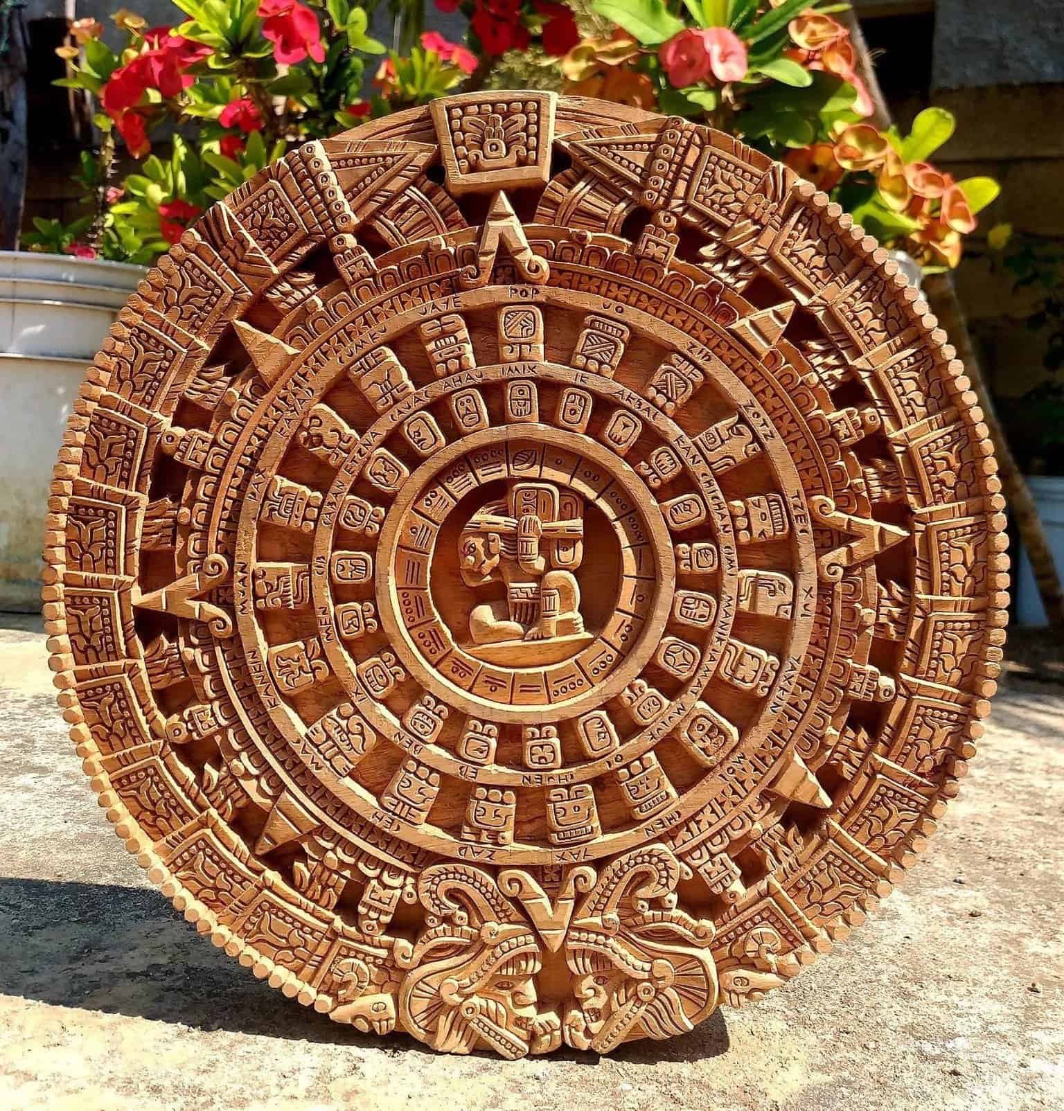 “ Mexican painting for wall or table, inspired by Mayan art, Mayan calendar ” Hand Carved by Mexican Artisans, 3D Wood Carving Design.