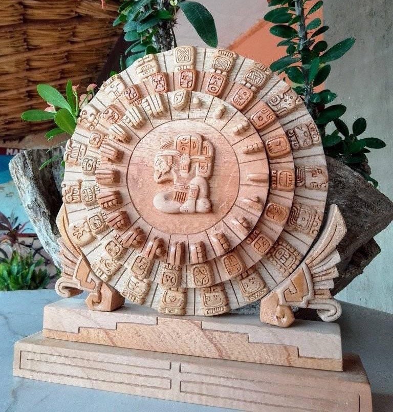 “ Mexican painting for wall or table, inspired by Mayan art, Mayan calendar, perpetual calendar ” Hand Carved by Mexican Artisans, 3D Wood Carving Design.