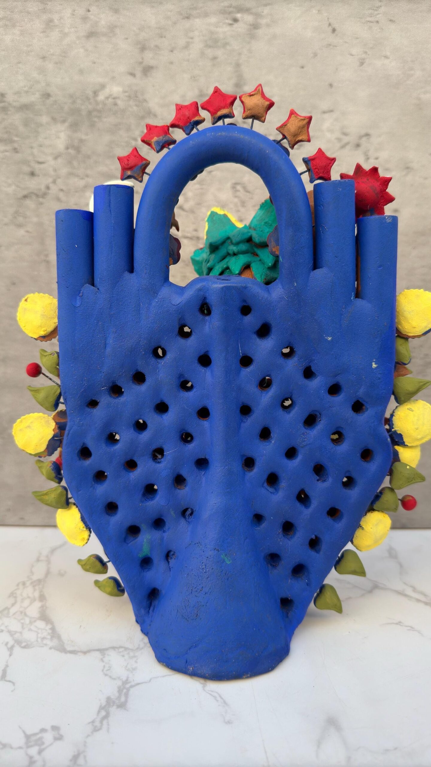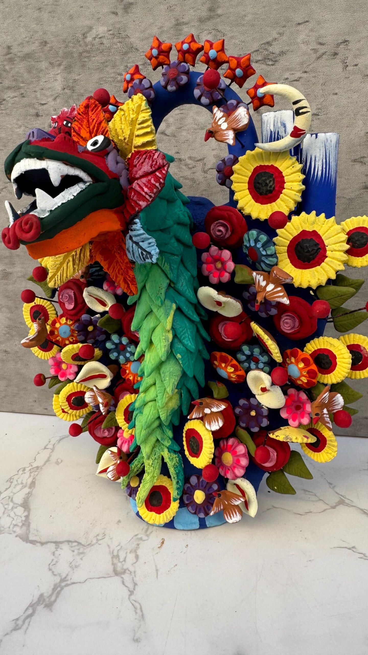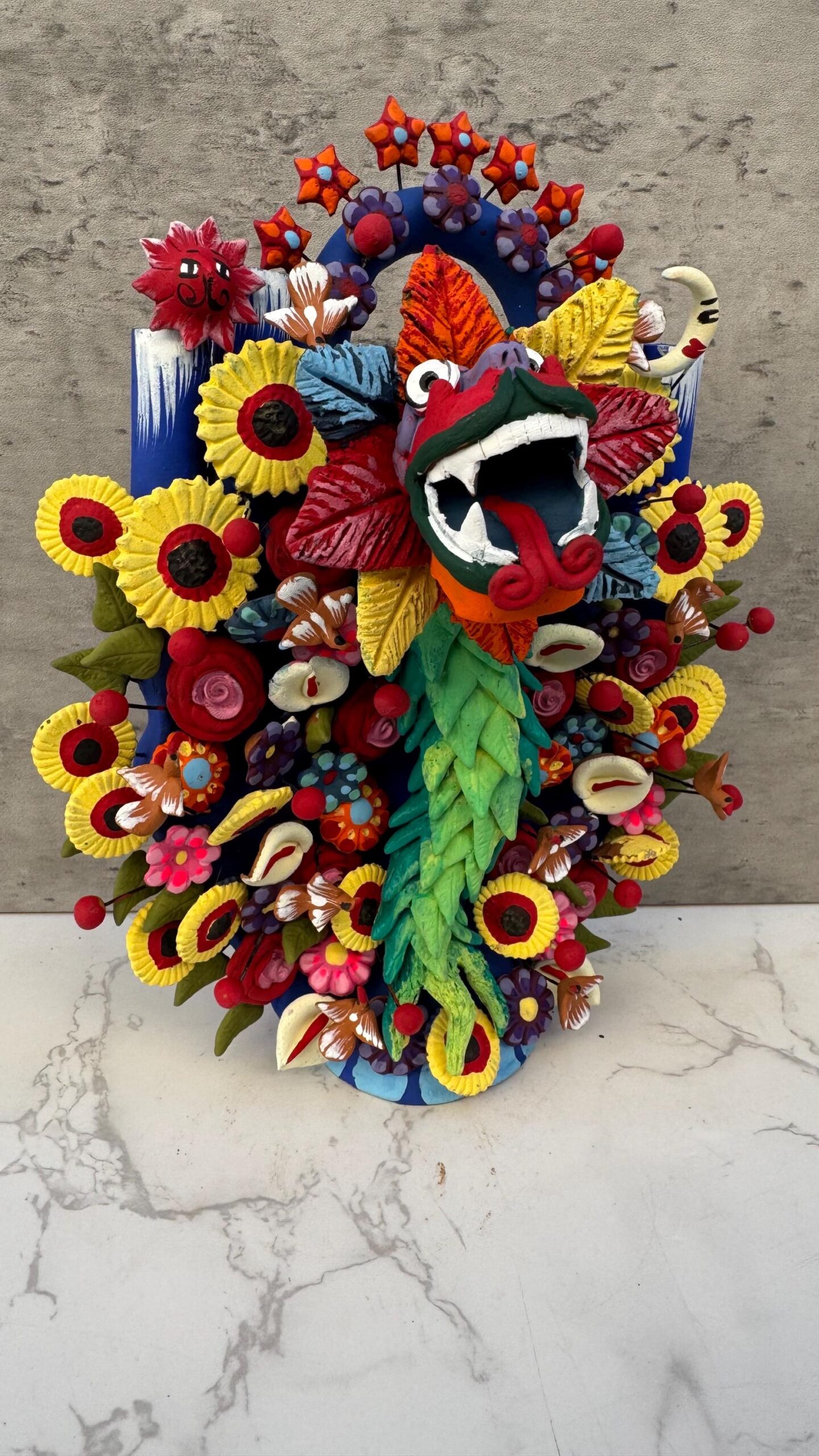 This stunning Tree of Life sculpture from Metepec, Estado de México, celebrates the legendary Quetzalcoatl, the feathered serpent deity, in vibrant handmade clay craftsmanship. Each element is meticulously crafted and hand-painted, showcasing the rich tradition of Mexican folk art. This piece bursts with colorful flowers, butterflies, and intricate details, symbolizing life, rebirth, and nature’s harmony. A perfect blend of artistry and cultural heritage, this unique Tree of Life honors ancient traditions while adding a bold statement to any space.