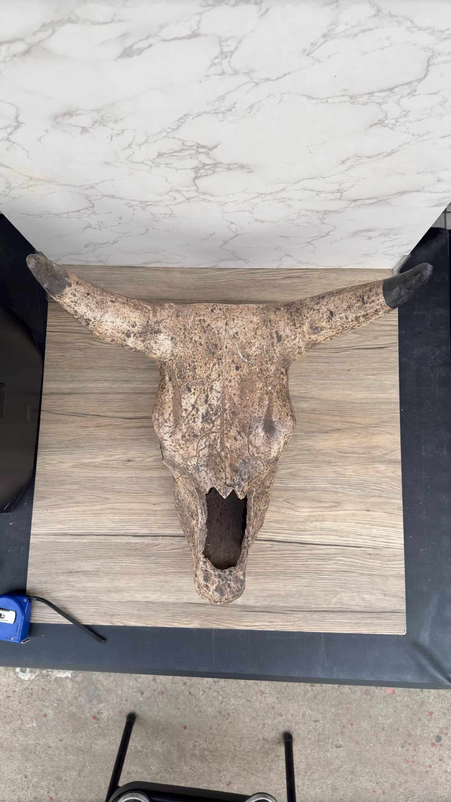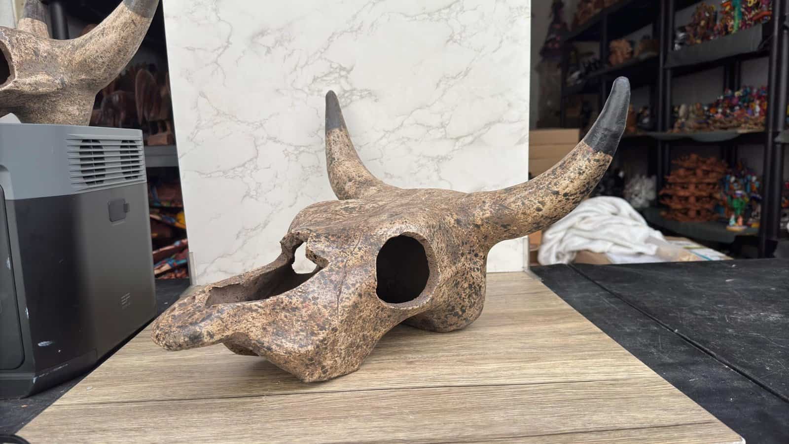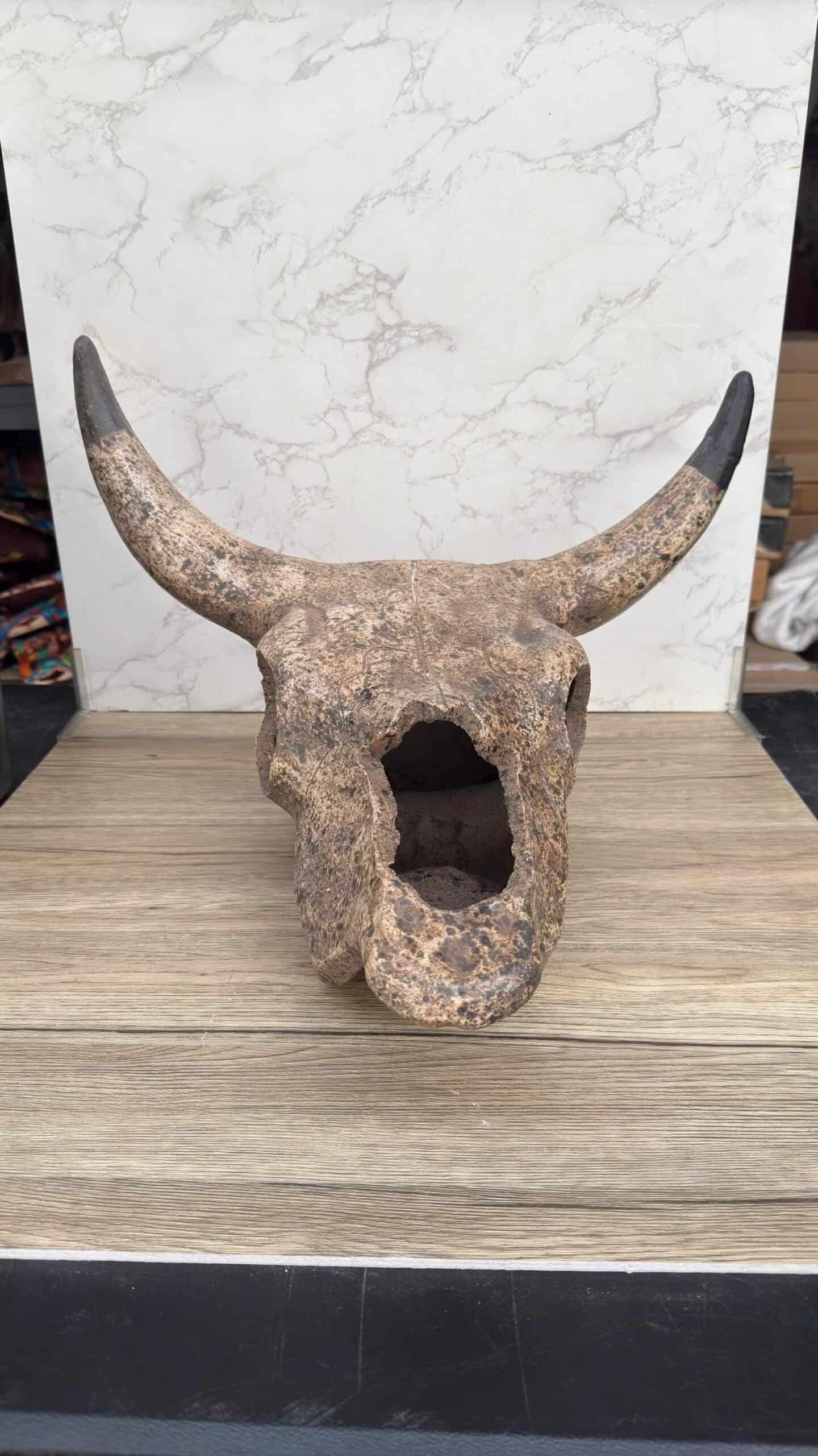 This handcrafted clay bull skull is a striking piece of rustic wall decor, inspired by Mexican artisan traditions. Made from natural terracotta with aged black accents on the horns, it evokes a vintage western aesthetic, perfect for farmhouse walls or eclectic interiors. The realistic form and weathered texture give it a unique character, ideal for lovers of southwestern, cowboy, or desert-style themes. It includes a hole in the back for easy wall mounting. Whether displayed in a living room, hallway, porch, or rustic-themed business, this ceramic cow skull adds cultural charm and rugged style to any space. Each piece is one-of-a-kind due to its handmade nature and natural variations in the clay. A bold decorative element that celebrates traditional craftsmanship and earthy elegance.