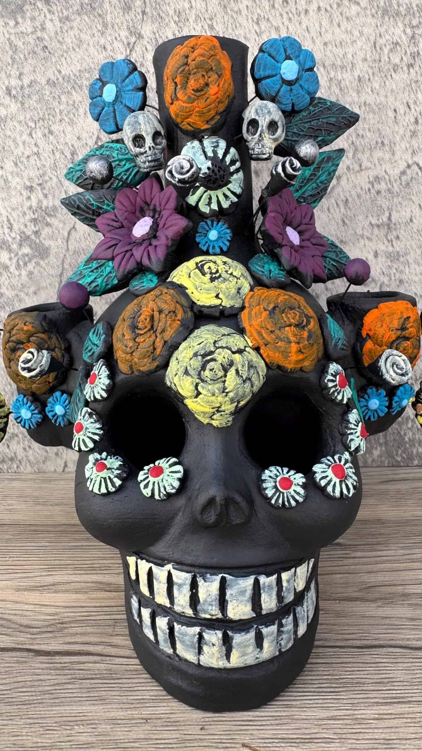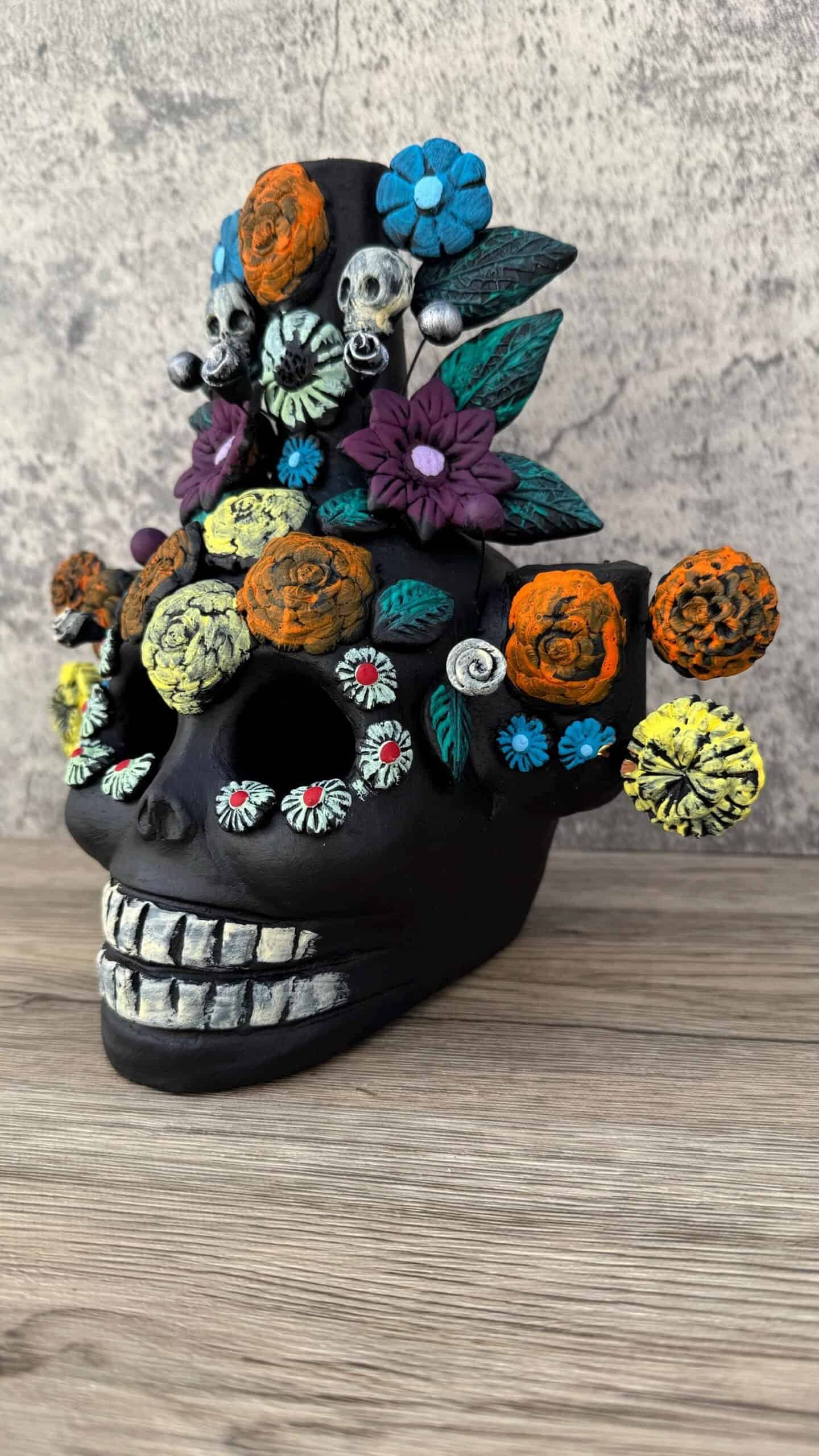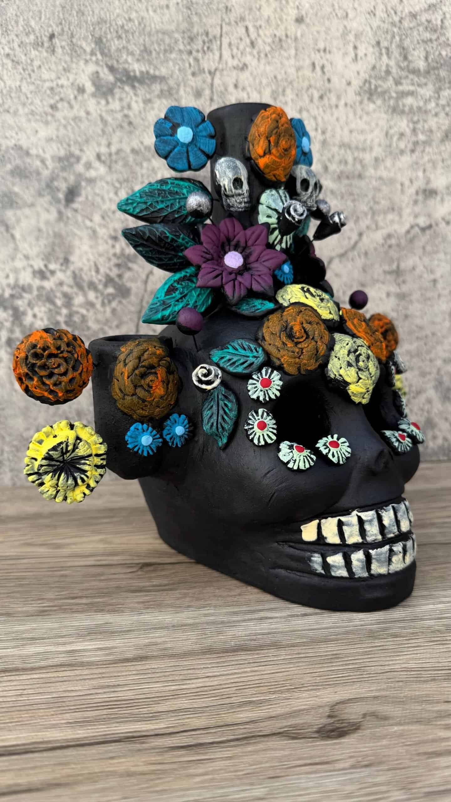 – Handmade by Mexican artisans Michoacan – clay material – Measures 8.5” wide 8” tall – Can also work as a mini Chimney of you put a plate under the skull (the bottom it’s not sealed)