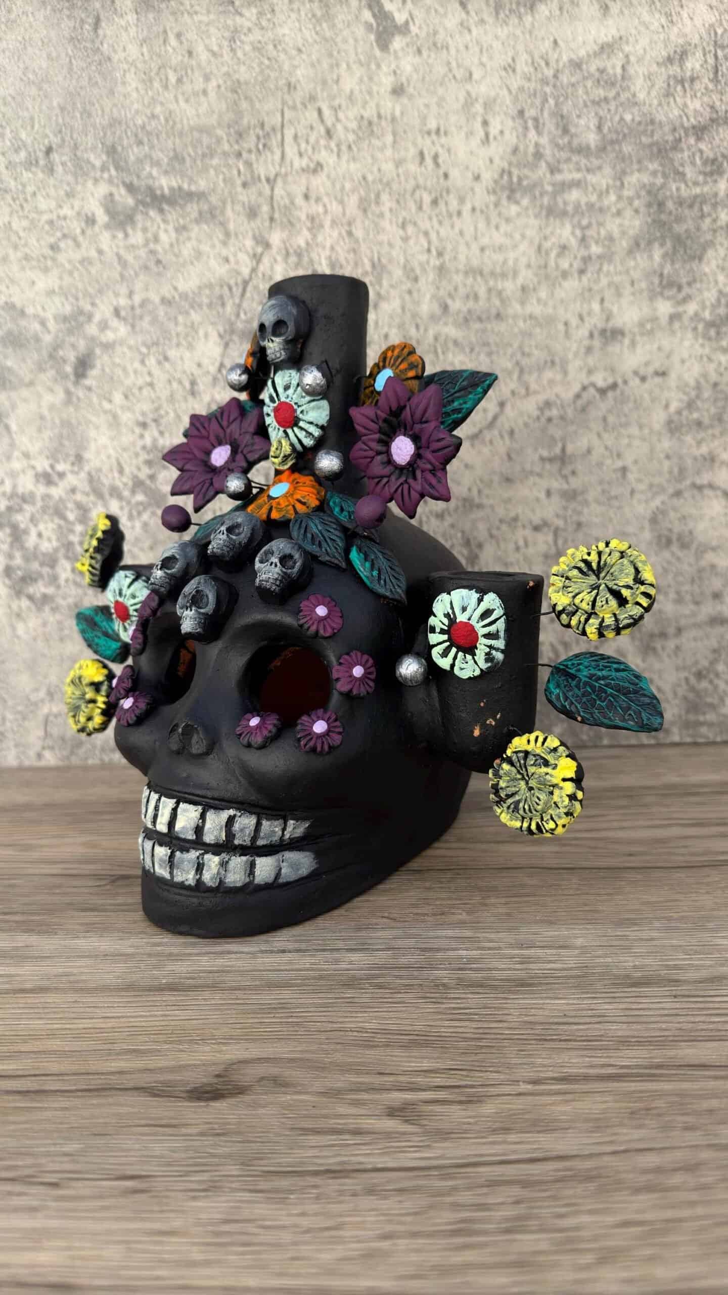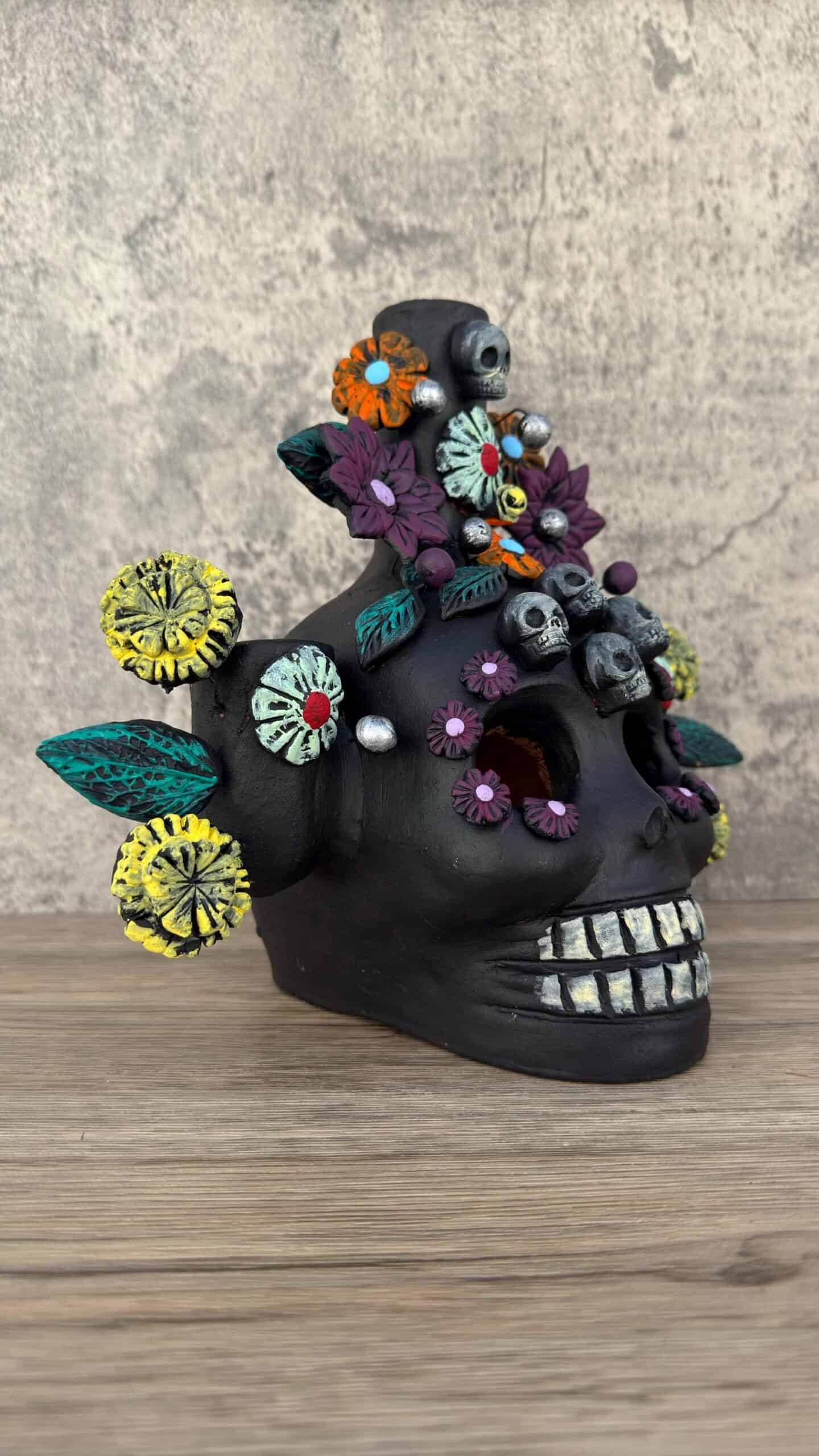 – Handmade by Mexican artisans Michoacan – clay material – Measures 8.5” wide 8” tall – Can also work as a mini Chimney of you put a plate under the skull (the bottom it’s not sealed)