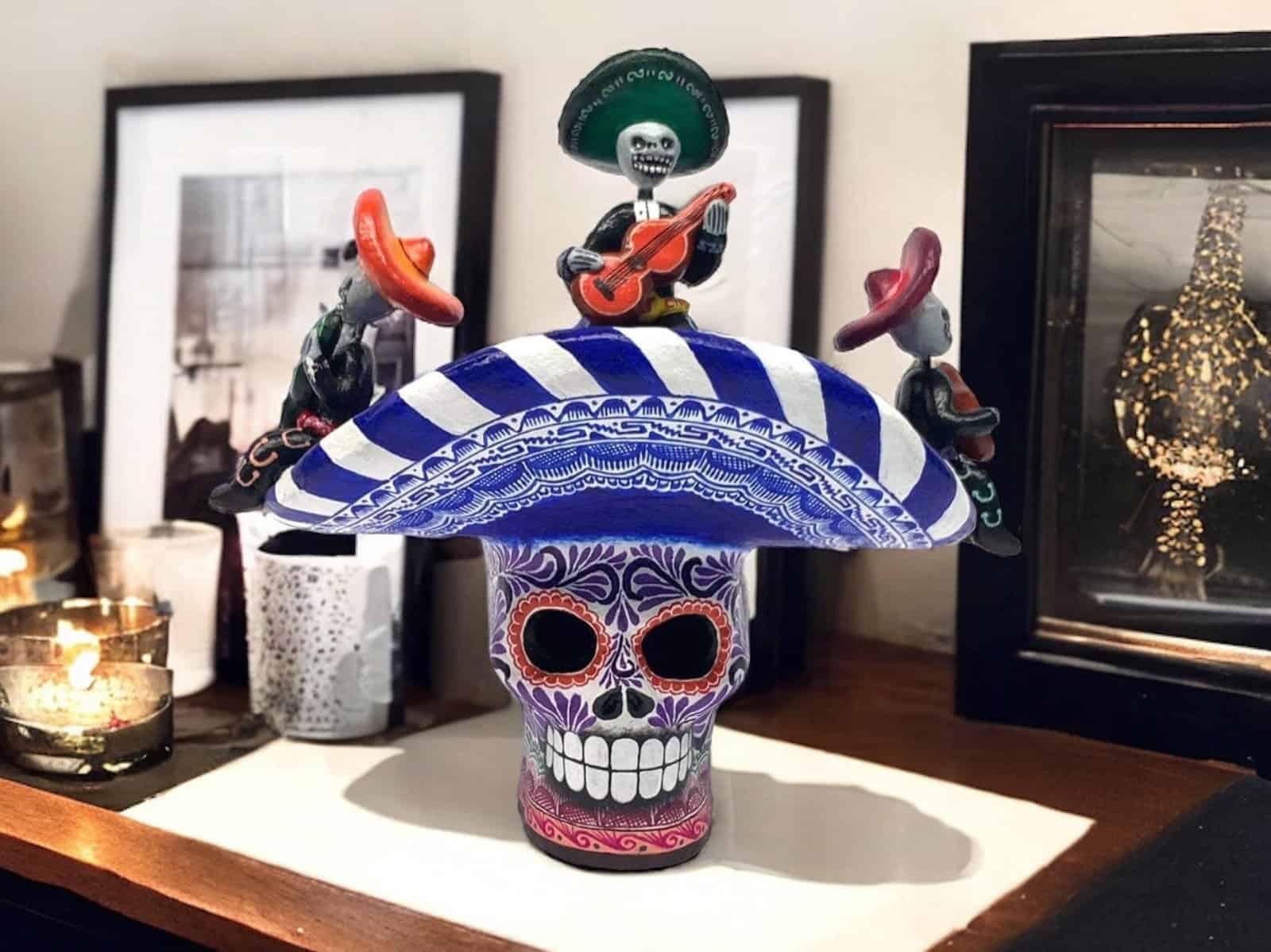 Sugar skull, Day of the Dead ornaments, skull as Mexican decoration, human skull sculpture, mariachi, 6.69 ”high