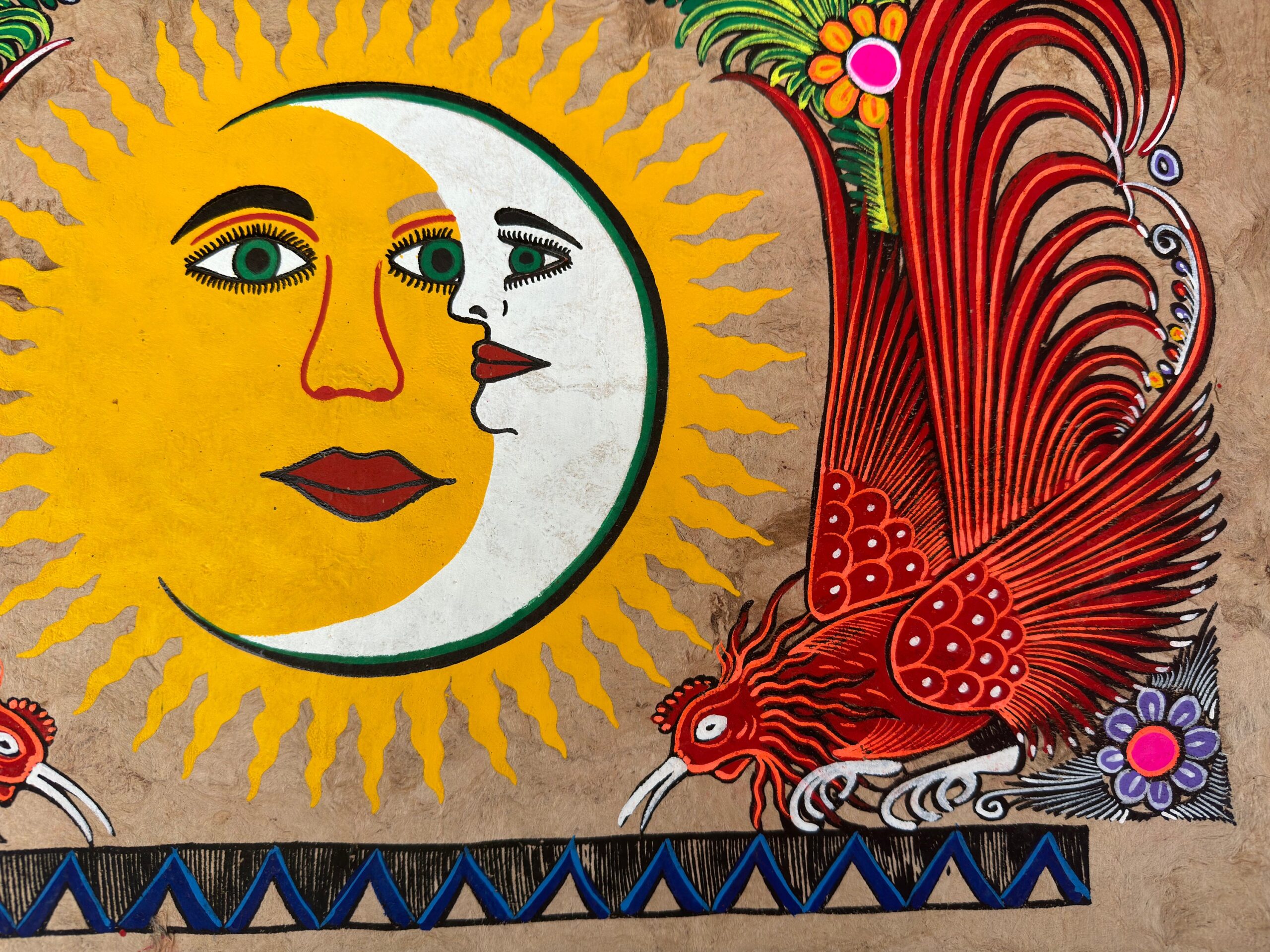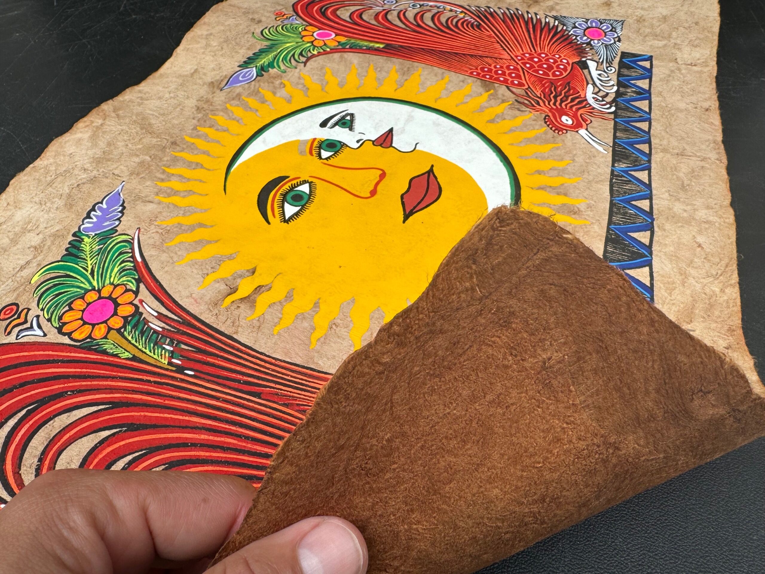 This colorful painting is hand painted on bark paper in Mexico. Mexican painting on bark paper is an ancient tradition in Mexico that has been part of its culture since the Aztec era.