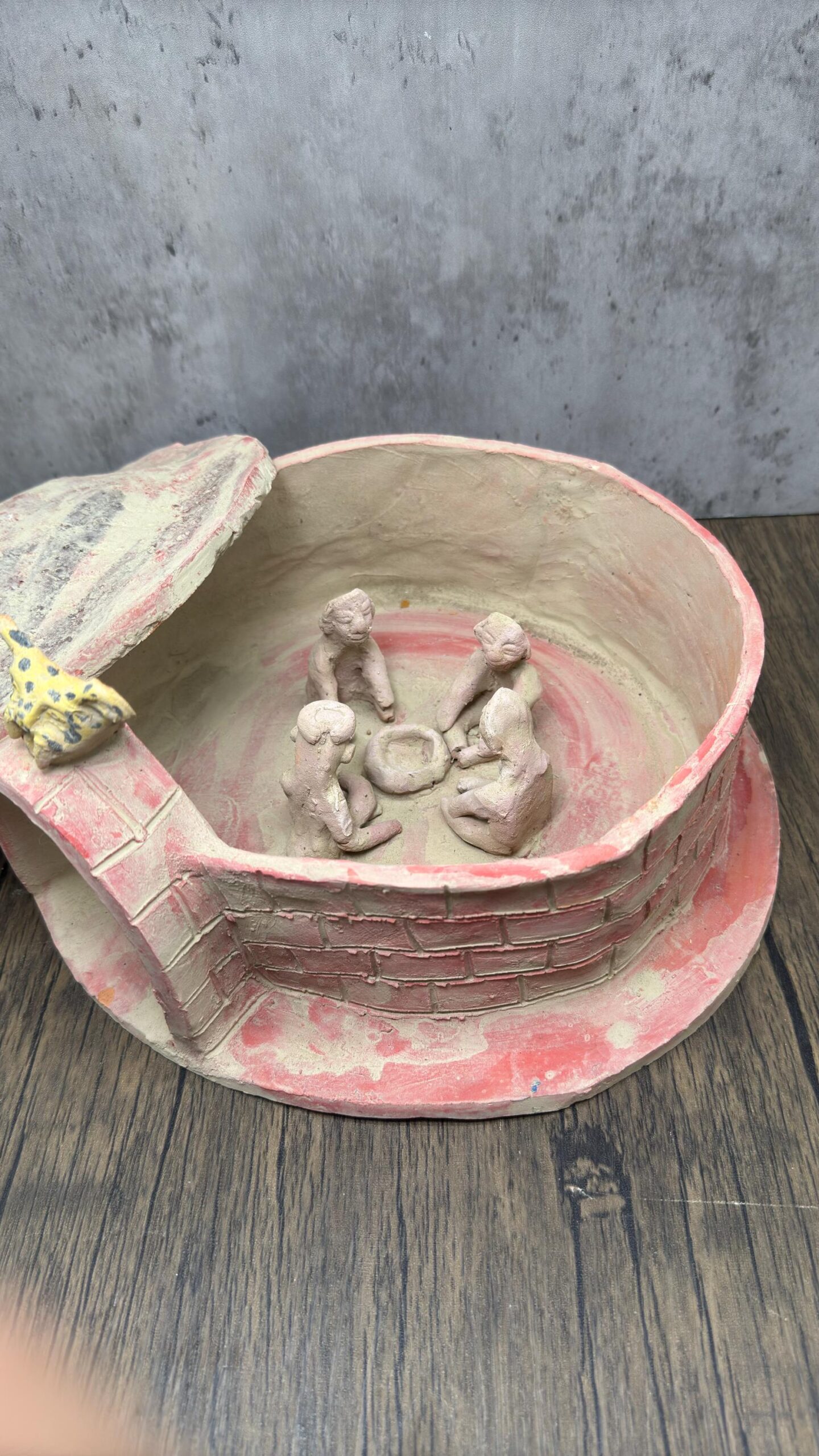 The exterior features hand-textured brick detailing and is topped with a symbolic jaguar head, often associated with protection and strength in pre-Hispanic culture. The removable roof reveals the interior scene, where figures gather around a symbolic fire pit, honoring centuries-old indigenous traditions of physical and spiritual cleansing.