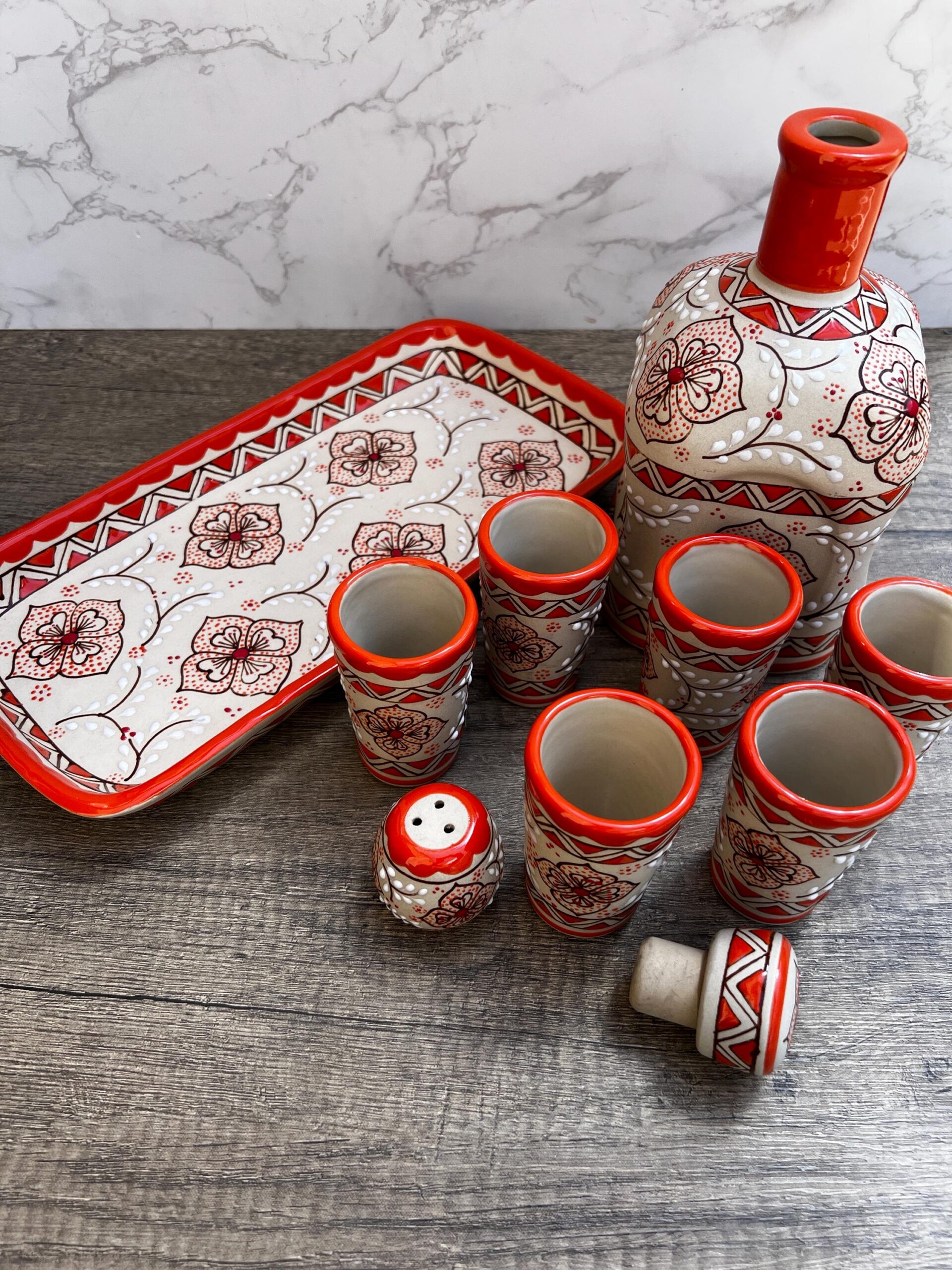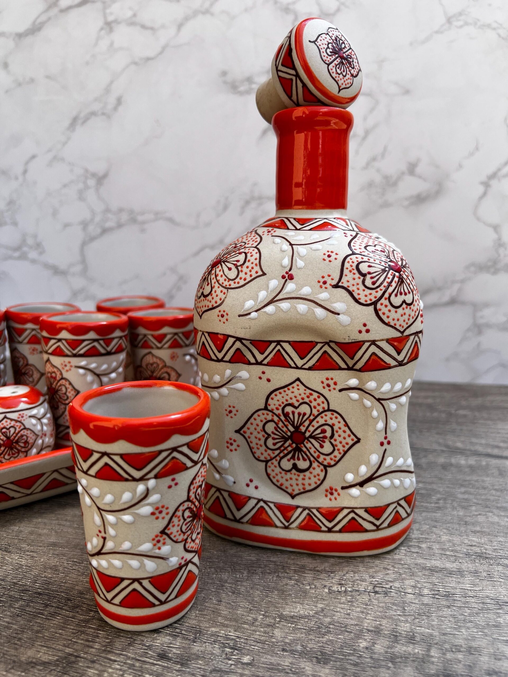 This beautiful Talavera tequila set is a true piece of Mexican artistry, handcrafted by skilled artisans in Puebla. Each piece is made with traditional techniques passed down for generations, featuring vibrant red floral and geometric patterns on a white glazed background.