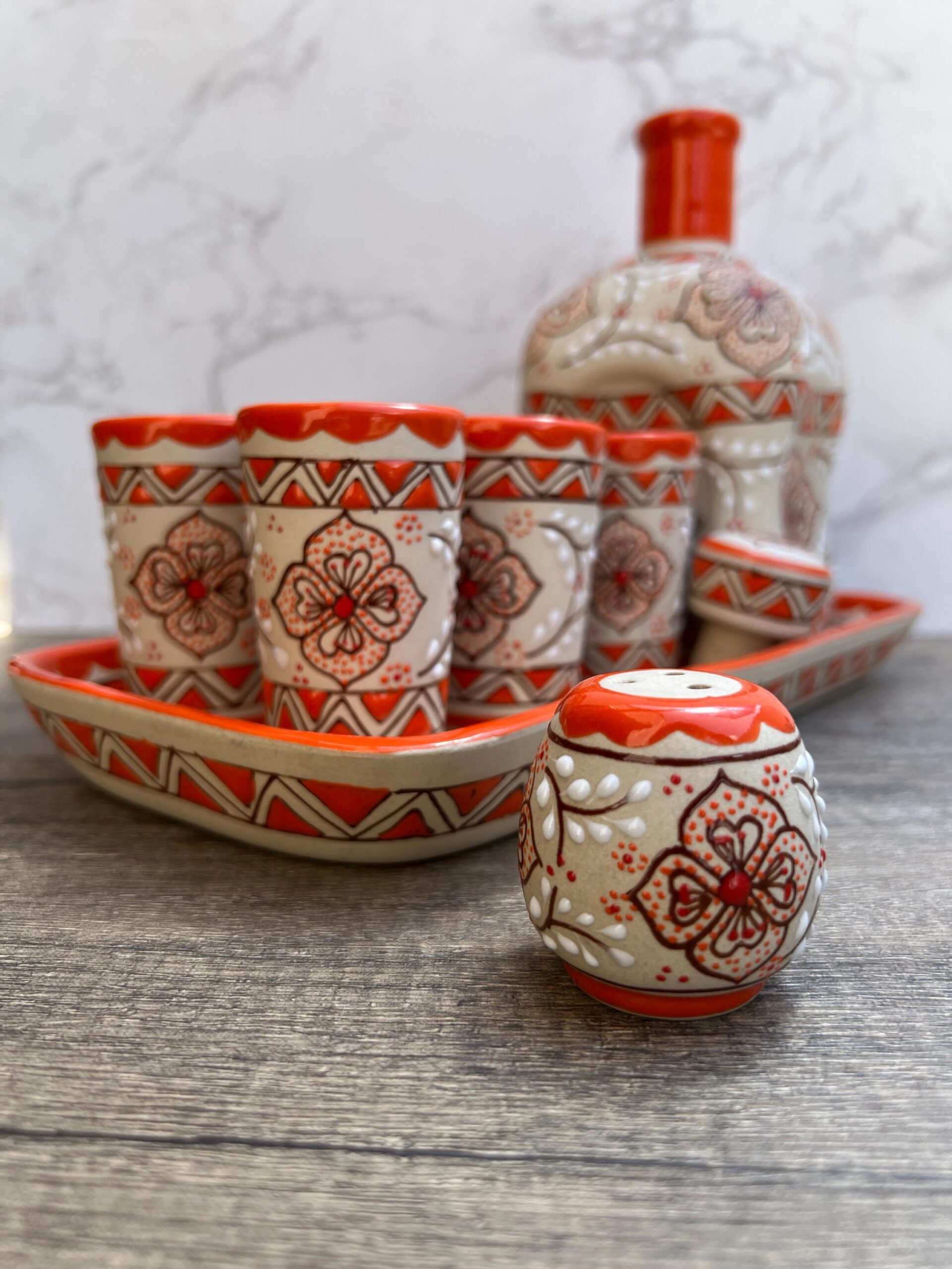The set includes a bottle, six matching shot glasses, a coordinating tray, and a salt shaker – perfect for sharing tequila in style. Its bold colors and detailed hand-painted designs make it not only functional but also a stunning centerpiece for your bar or kitchen.