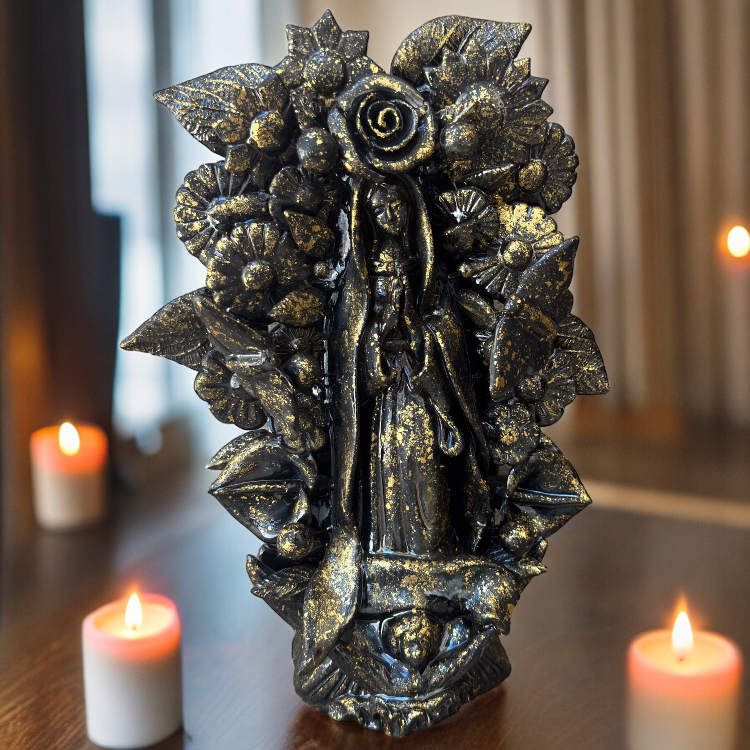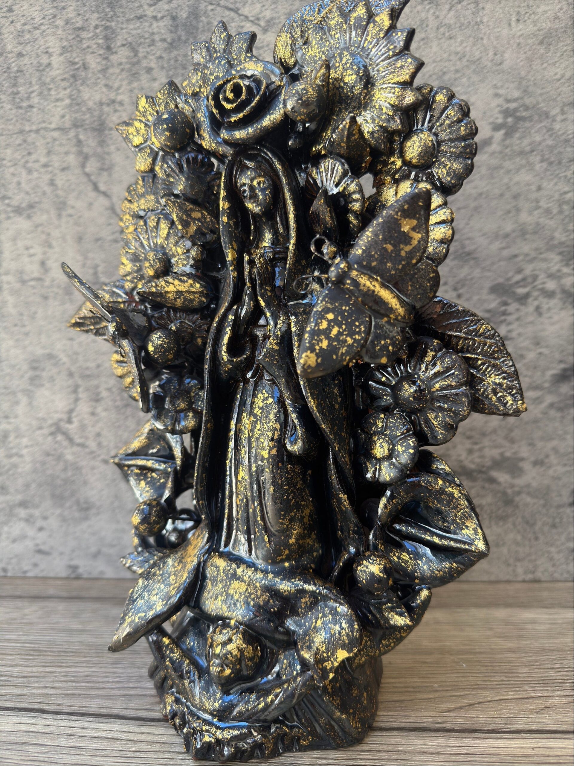 This handcrafted clay Virgin is a stunning representation of Mexican folk art, lovingly made by talented artisans in Metepec, Estado de México. Famous for its barro (clay) traditions, Metepec is a vibrant town where cultural heritage and craftsmanship are deeply rooted in every piece. Each Virgin is carefully shaped and painted by hand, featuring intricate details and warm earthy tones that reflect the spiritual and artistic essence of the region.