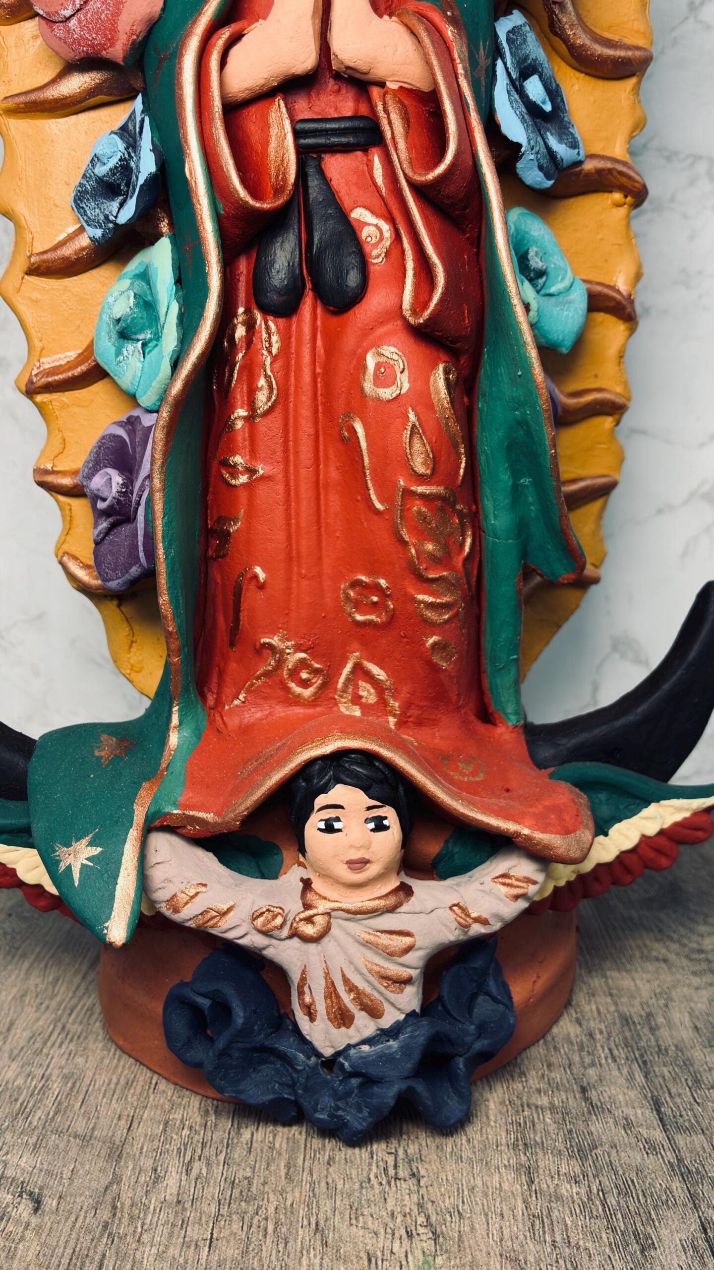 This handcrafted clay Virgin is a stunning representation of Mexican folk art, lovingly made by talented artisans in Metepec, Estado de México. Famous for its barro (clay) traditions, Metepec is a vibrant town where cultural heritage and craftsmanship are deeply rooted in every piece. Each Virgin is carefully shaped and painted by hand, featuring intricate details and warm earthy tones that reflect the spiritual and artistic essence of the region.