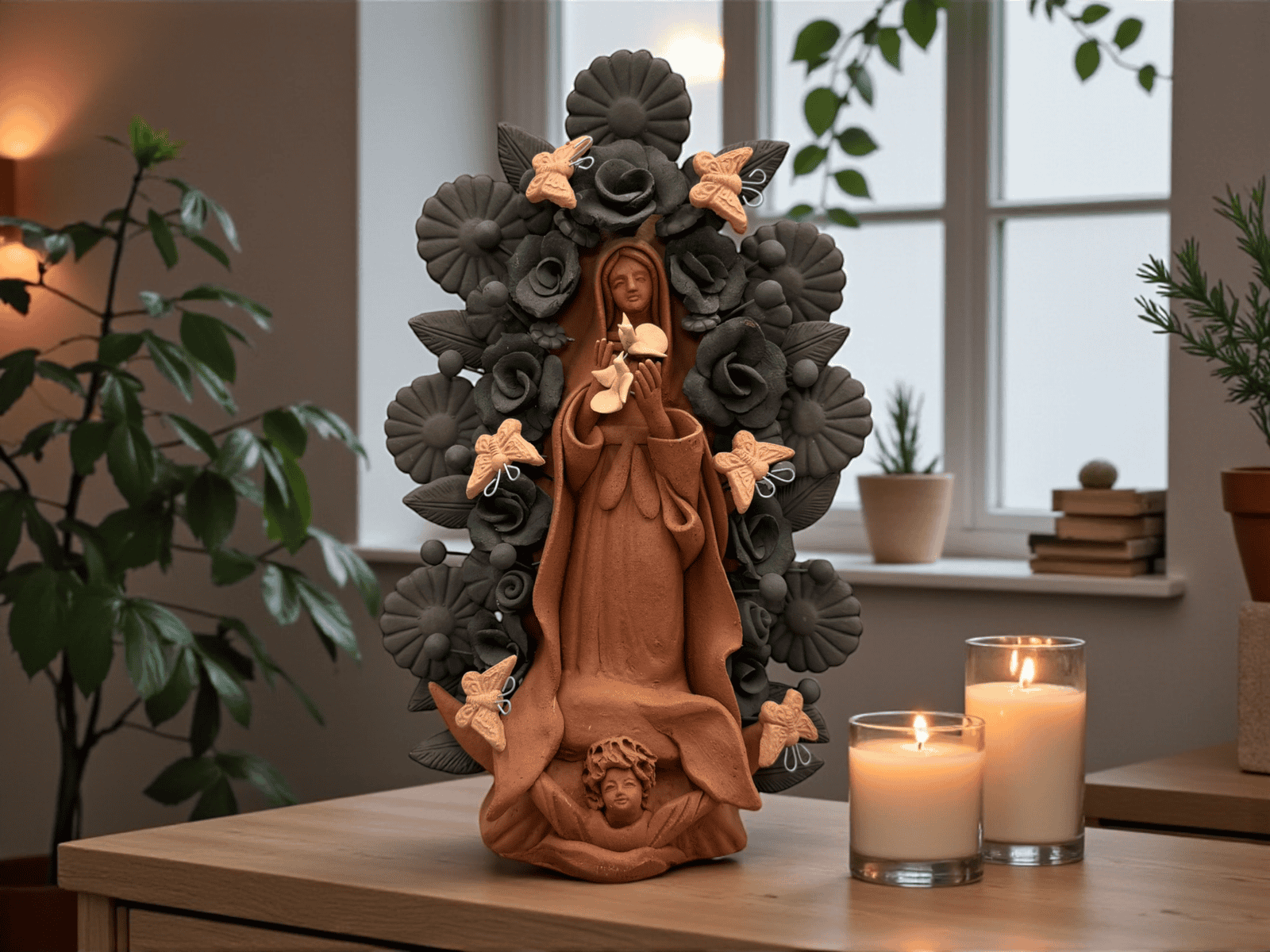 This handcrafted clay Virgin is a stunning representation of Mexican folk art, lovingly made by talented artisans in Metepec, Estado de México. Famous for its barro (clay) traditions, Metepec is a vibrant town where cultural heritage and craftsmanship are deeply rooted in every piece. Each Virgin is carefully shaped and painted by hand, featuring intricate details and warm earthy tones that reflect the spiritual and artistic essence of the region.