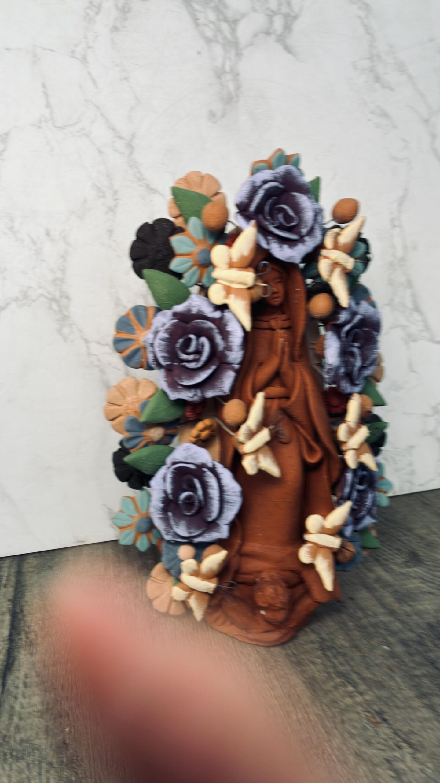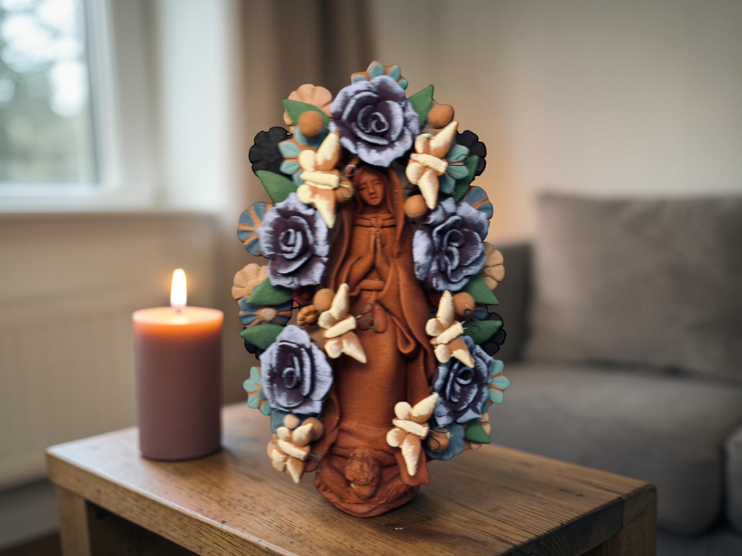 This handcrafted clay Virgin is a stunning representation of Mexican folk art, lovingly made by talented artisans in Metepec, Estado de México. Famous for its barro (clay) traditions, Metepec is a vibrant town where cultural heritage and craftsmanship are deeply rooted in every piece. Each Virgin is carefully shaped and painted by hand, featuring intricate details and warm earthy tones that reflect the spiritual and artistic essence of the region.