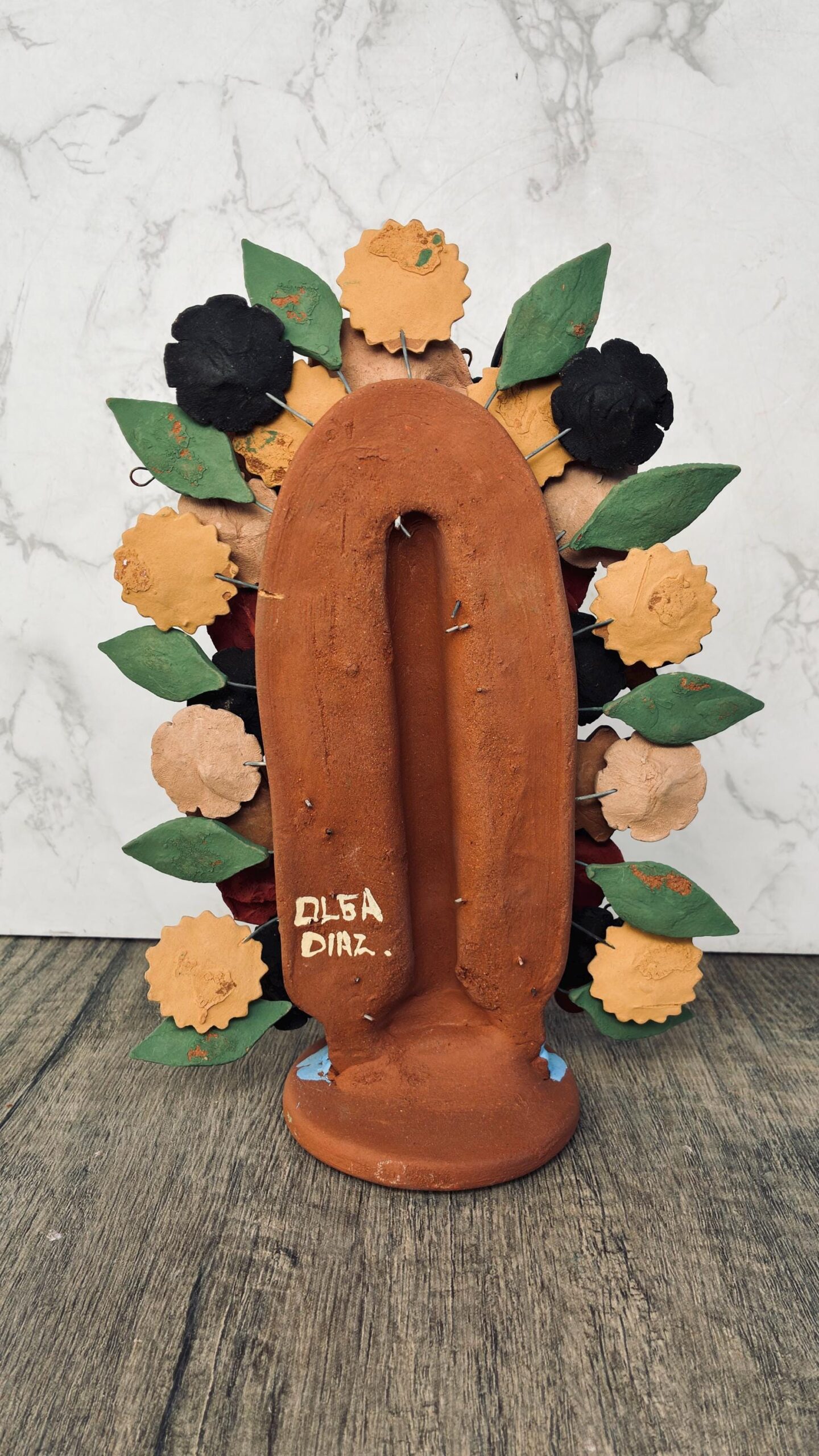 This handcrafted clay Virgin is a stunning representation of Mexican folk art, lovingly made by talented artisans in Metepec, Estado de México. Famous for its barro (clay) traditions, Metepec is a vibrant town where cultural heritage and craftsmanship are deeply rooted in every piece. Each Virgin is carefully shaped and painted by hand, featuring intricate details and warm earthy tones that reflect the spiritual and artistic essence of the region.