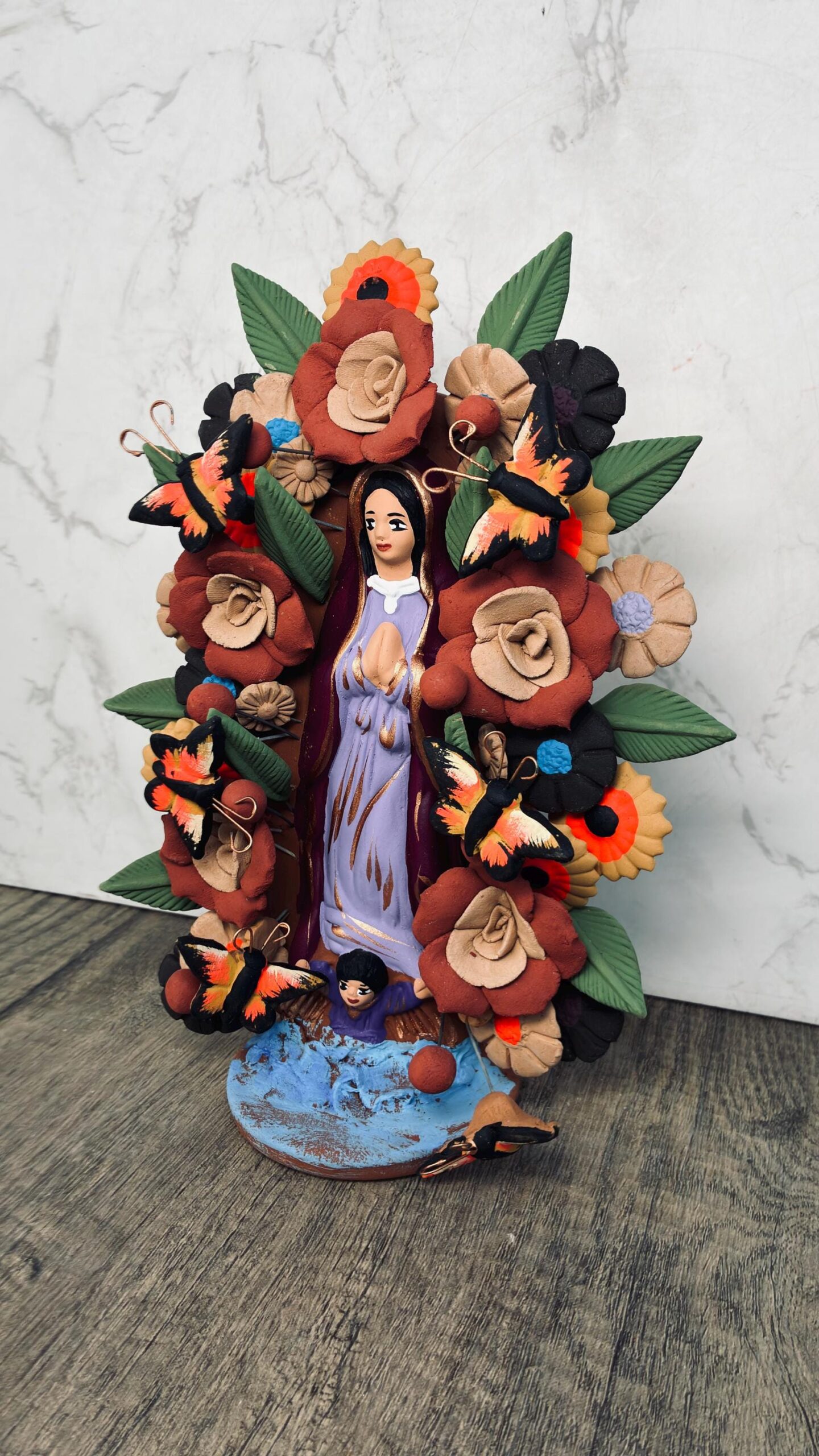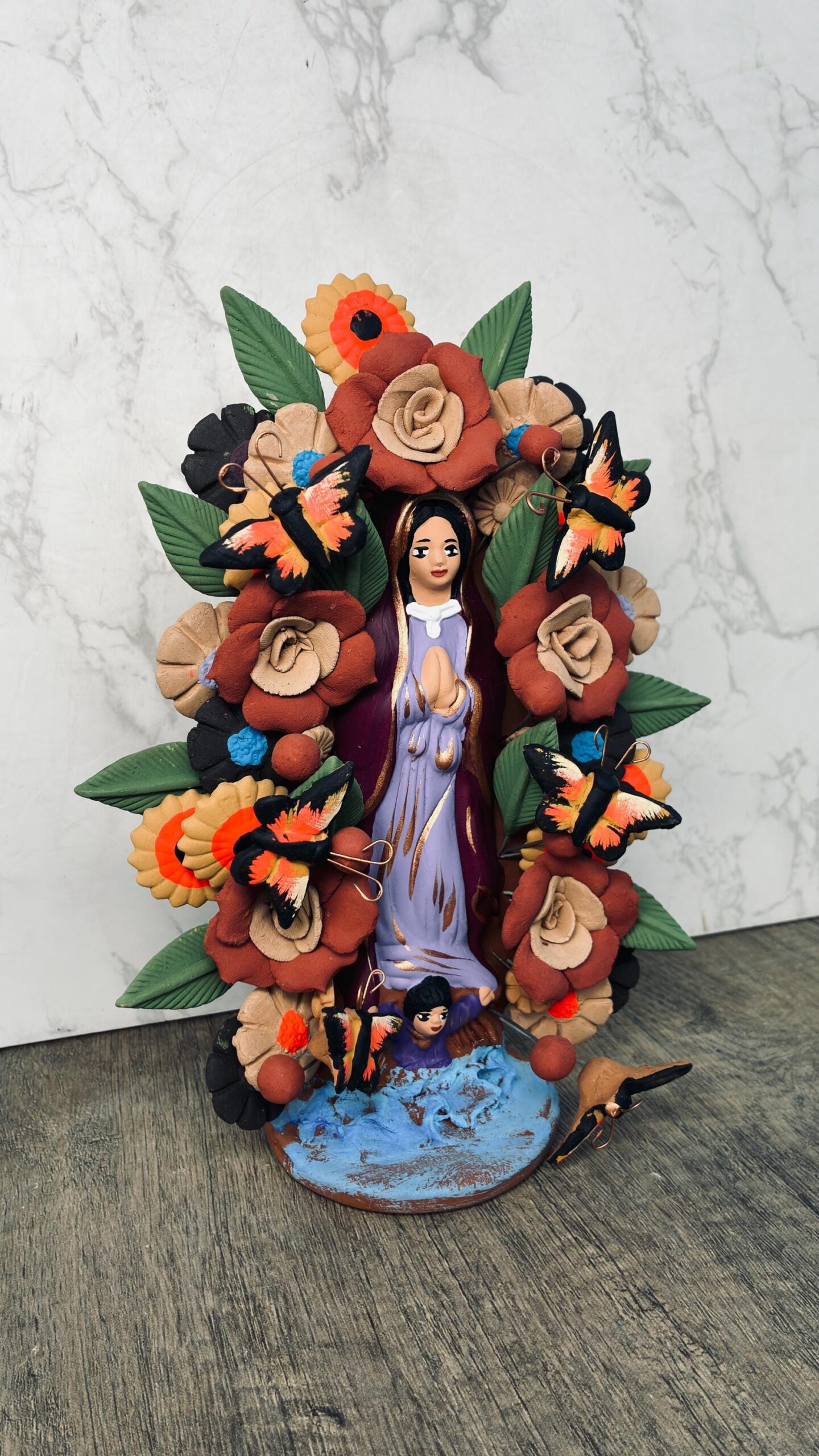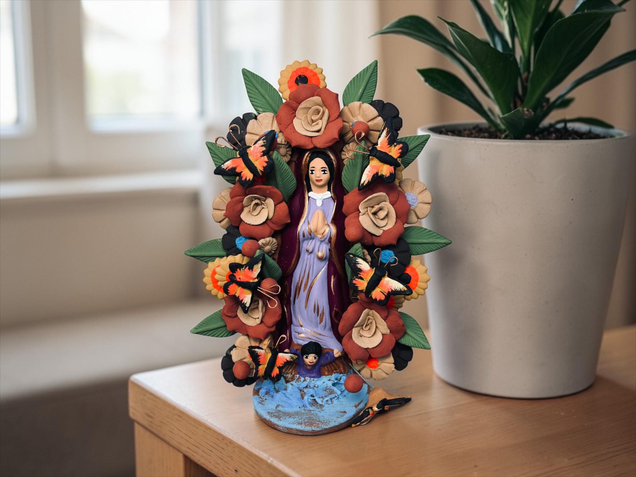 Mary Virgin with flowers decoration ideal to decorate your home or as a special gift, characteristic: – Handmade by Mexican artisans – Polychrome clay material – pigment clay natural colors – Dimentions 9” Tall This handcrafted clay Virgin is a stunning representation of Mexican folk art, lovingly made by talented artisans in Metepec, Estado de México. Famous for its barro (clay) traditions, Metepec is a vibrant town where cultural heritage and craftsmanship are deeply rooted in every piece. Each Virgin is carefully shaped and painted by hand, featuring intricate details and warm earthy tones that reflect the spiritual and artistic essence of the region. This beautiful figure brings a sacred, heartfelt presence to any home, altar, or devotional space. It’s not just a decoration—it’s a meaningful connection to tradition, faith, and the hands that created it. Every piece is unique, with slight variations in color and expression, adding to its authenticity and charm. Perfect as a gift or a treasured part of your own spiritual collection.