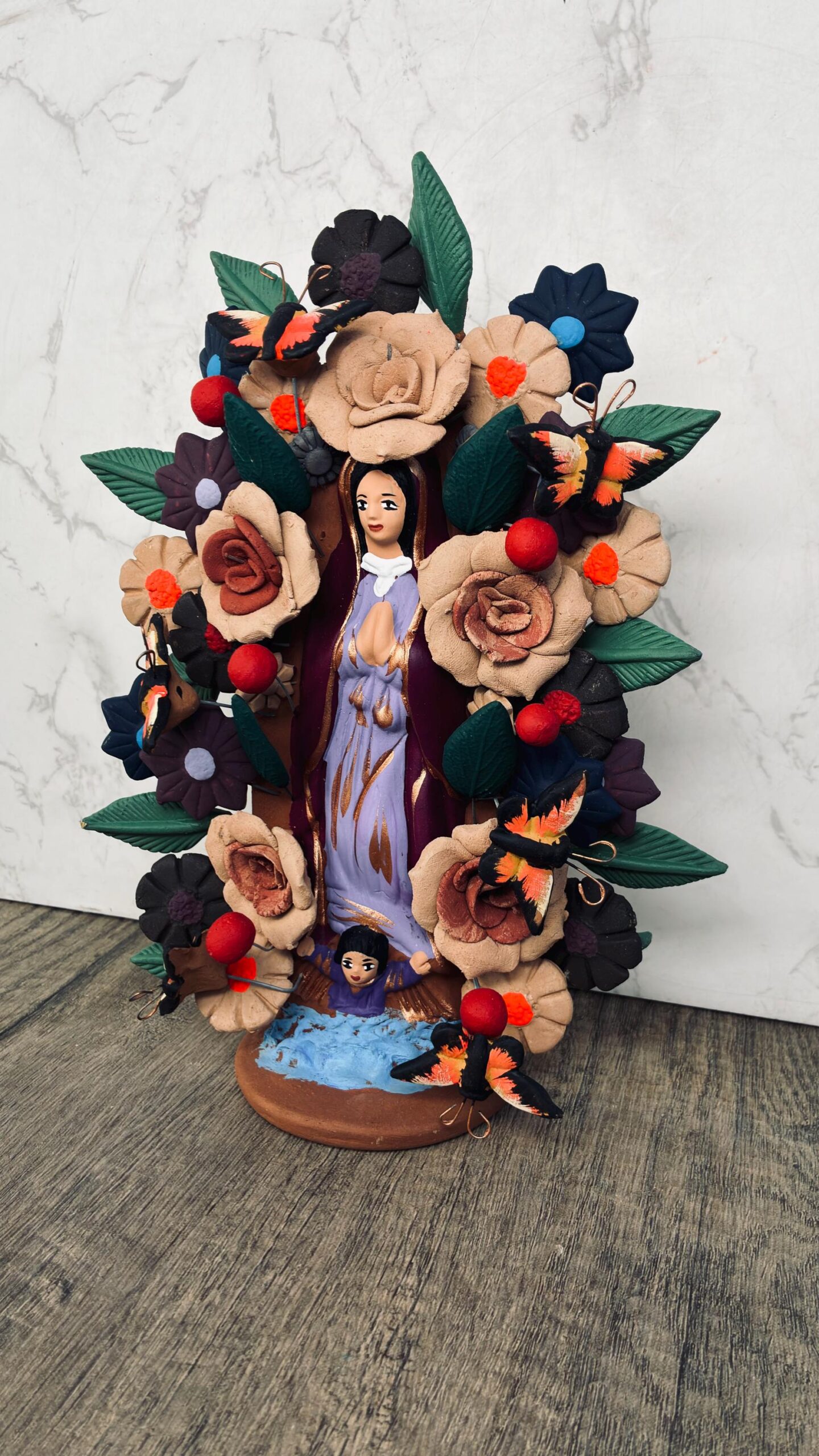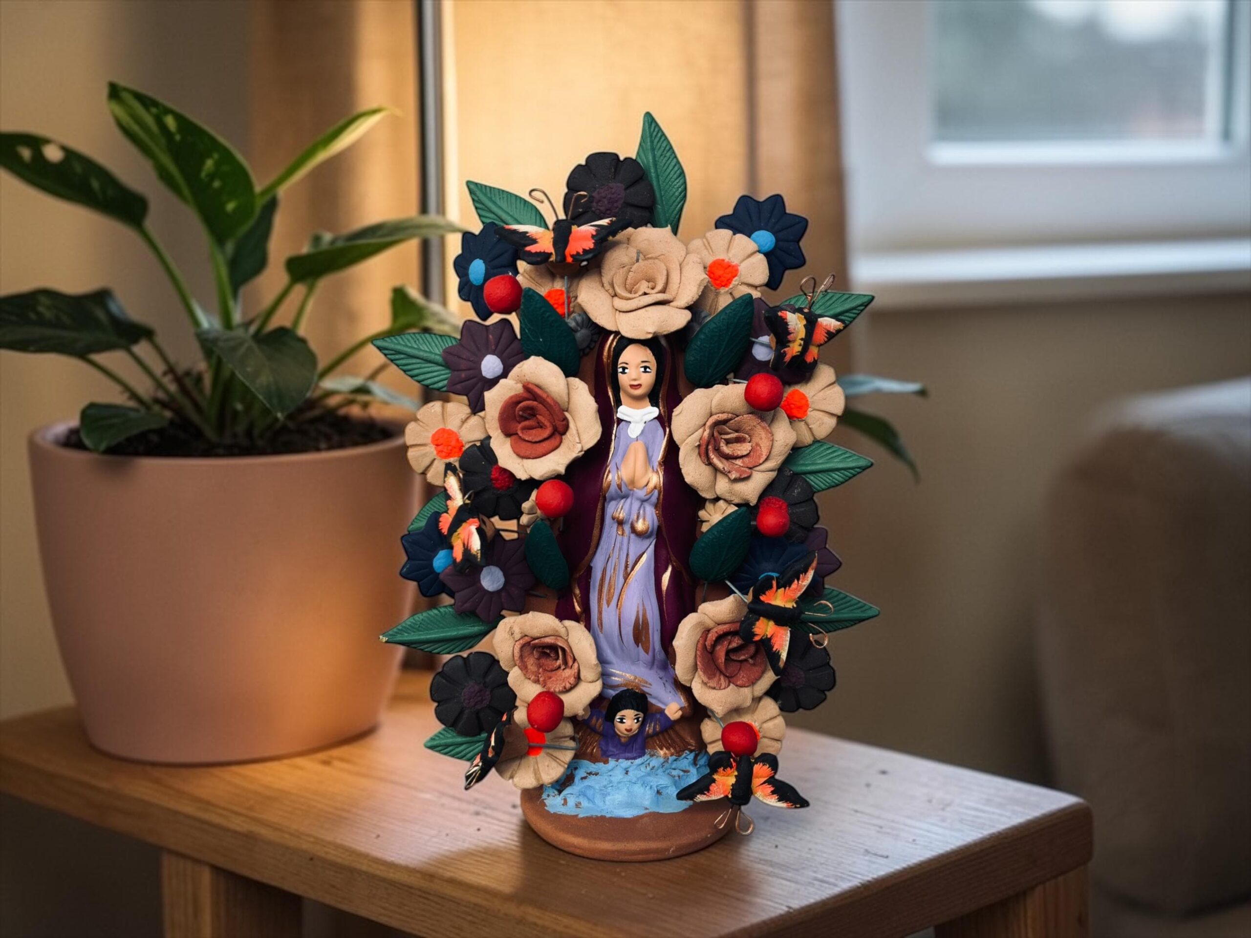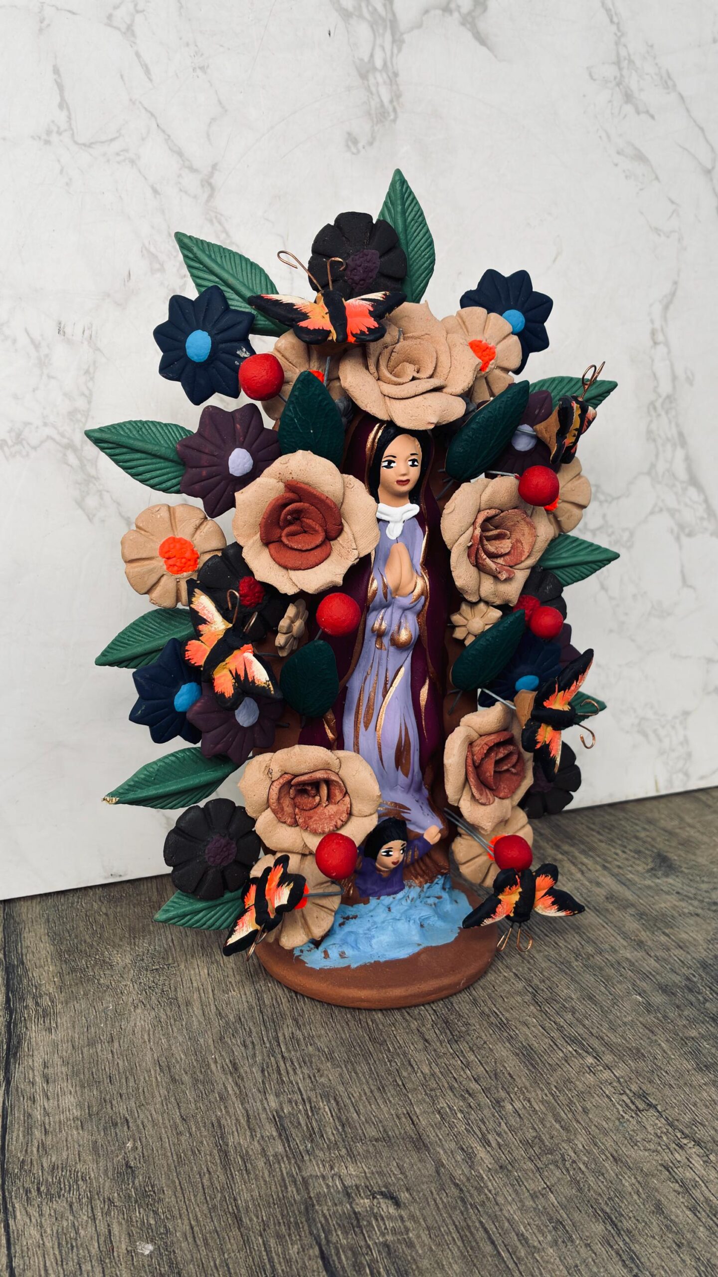Mary Virgin with flowers decoration ideal to decorate your home or as a special gift, characteristic: – Handmade by Mexican artisans – Polychrome clay material – pigment clay natural colors – Dimentions 9” Tall This handcrafted clay Virgin is a stunning representation of Mexican folk art, lovingly made by talented artisans in Metepec, Estado de México. Famous for its barro (clay) traditions, Metepec is a vibrant town where cultural heritage and craftsmanship are deeply rooted in every piece. Each Virgin is carefully shaped and painted by hand, featuring intricate details and warm earthy tones that reflect the spiritual and artistic essence of the region. This beautiful figure brings a sacred, heartfelt presence to any home, altar, or devotional space. It’s not just a decoration—it’s a meaningful connection to tradition, faith, and the hands that created it. Every piece is unique, with slight variations in color and expression, adding to its authenticity and charm. Perfect as a gift or a treasured part of your own spiritual collection.