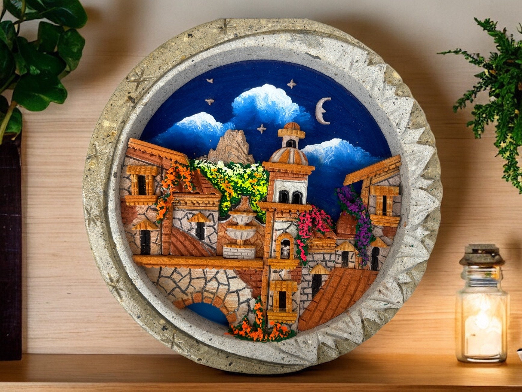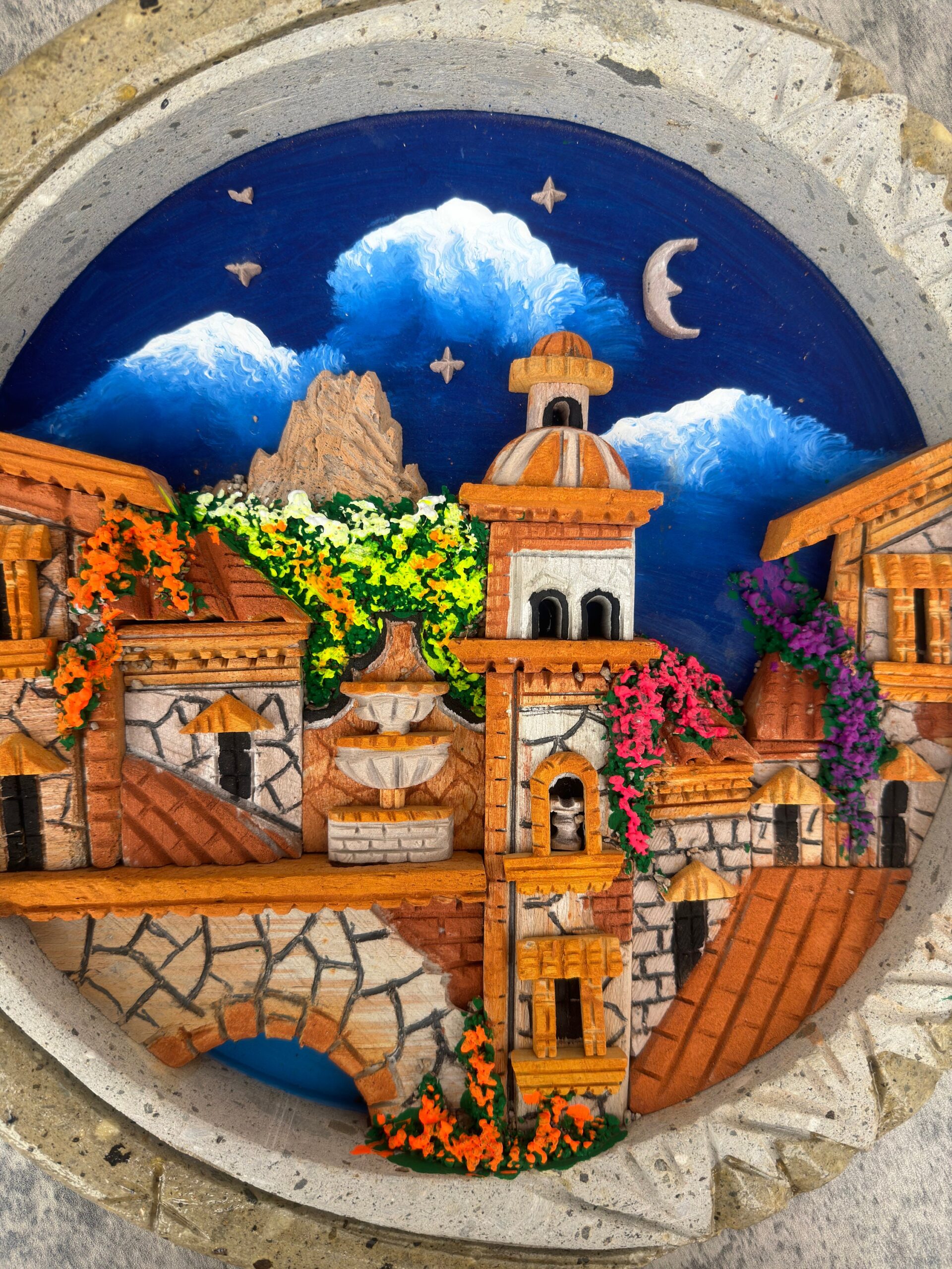 Item Features: – Landscape of a representation of region in Mexico – Dimentions 15.8” diameter – Rock Pomez in quarry frame – Painted with acrylic paints – Hang it in your wall or place it on your shelf