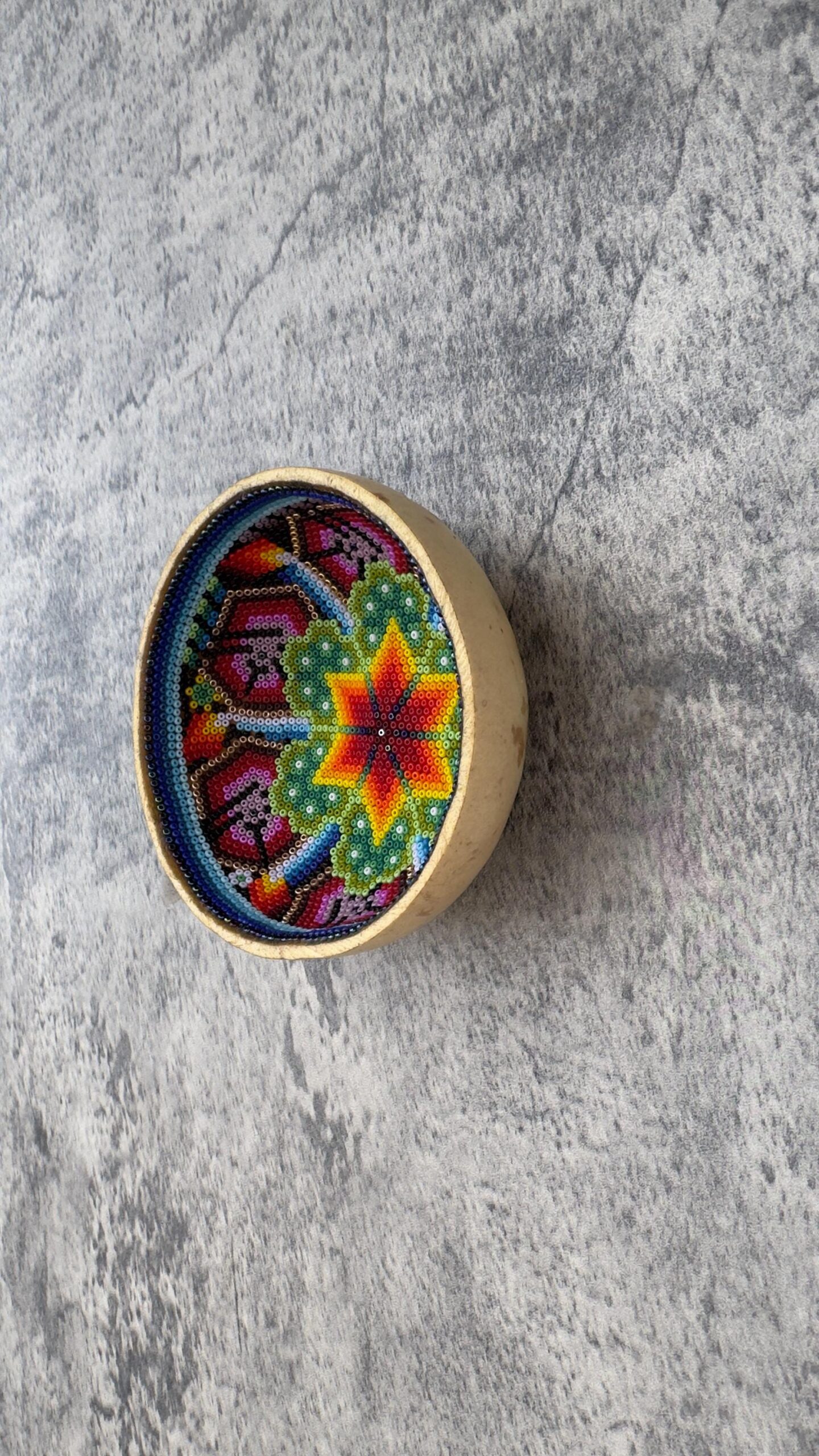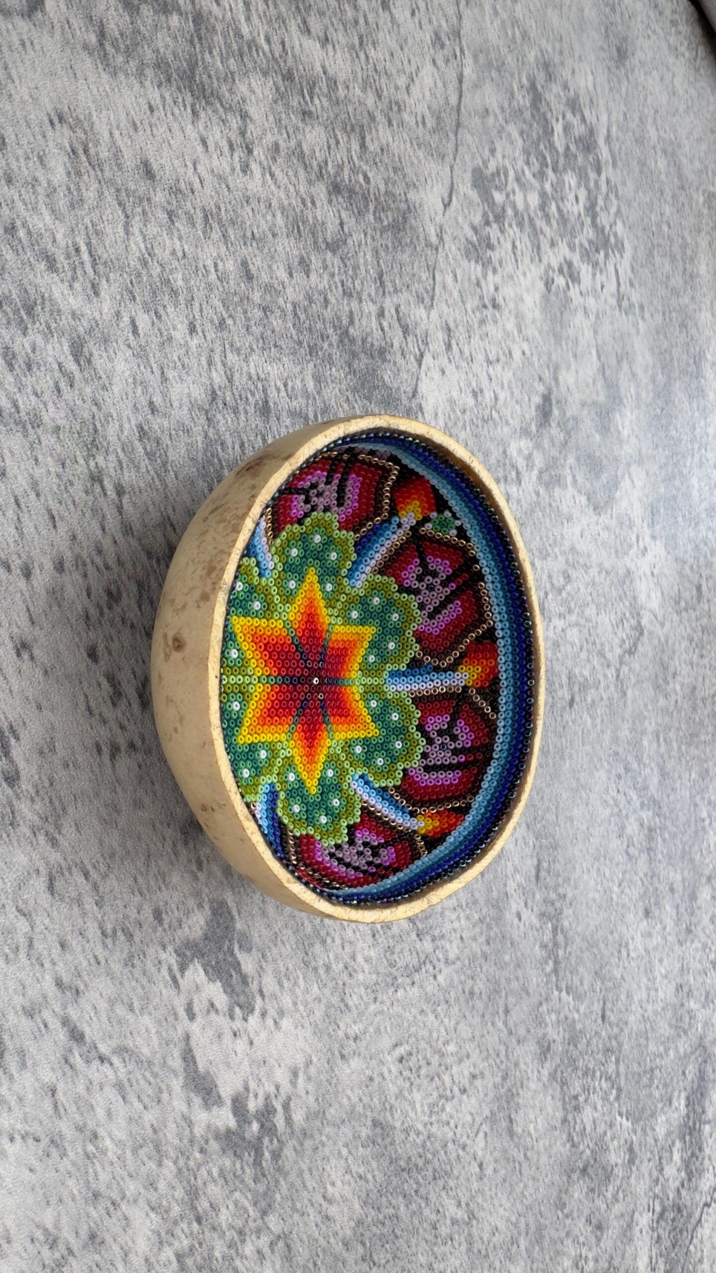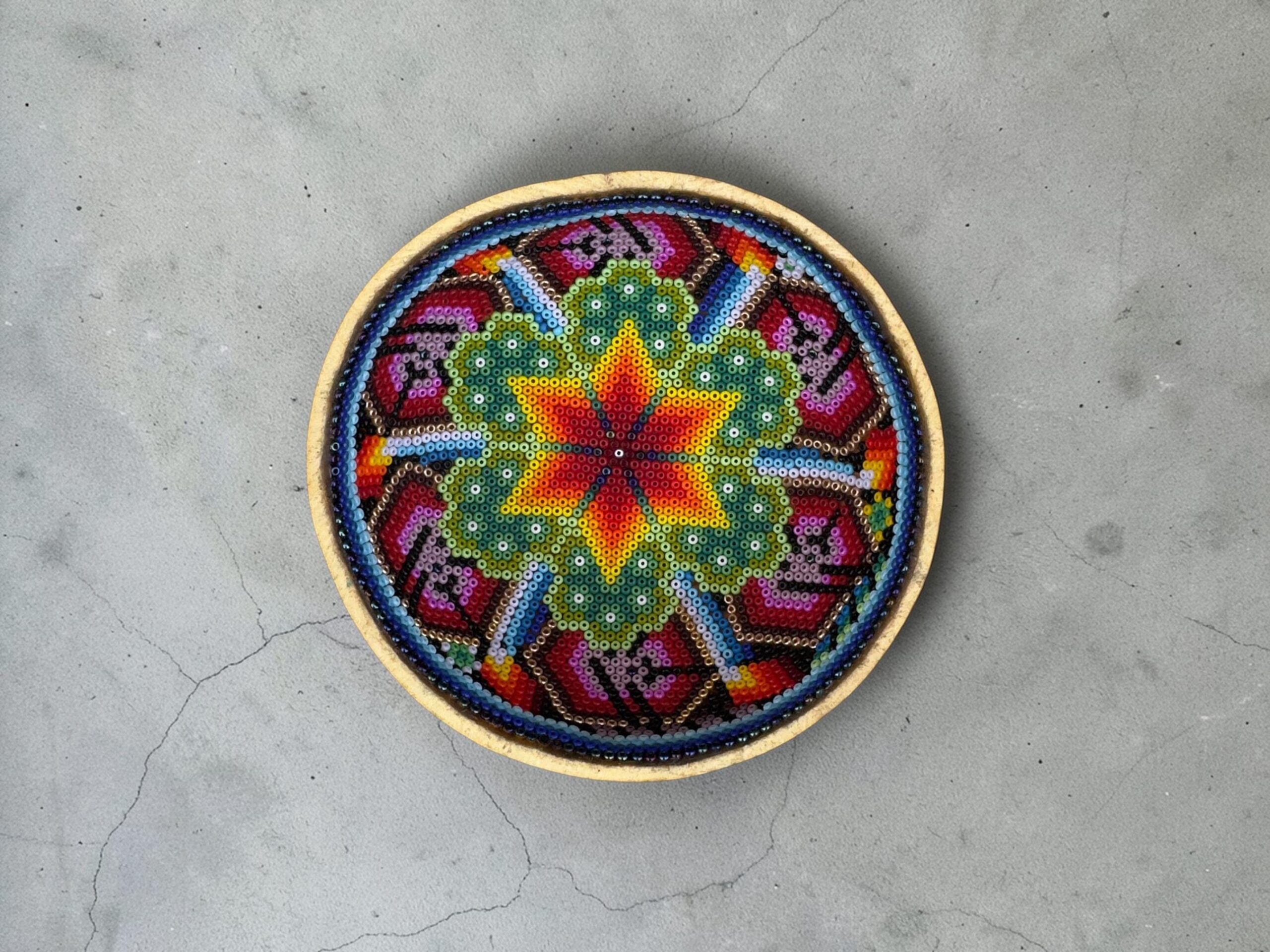 This handmade beaded wall plate is a beautiful piece of Mexican folk art inspired by the vibrant visual traditions of Wixárika craftsmanship. Carefully decorated with hundreds of tiny glass beads arranged in symmetrical patterns, each plate reflects the patience, skill, and artistry of traditional beadwork techniques.