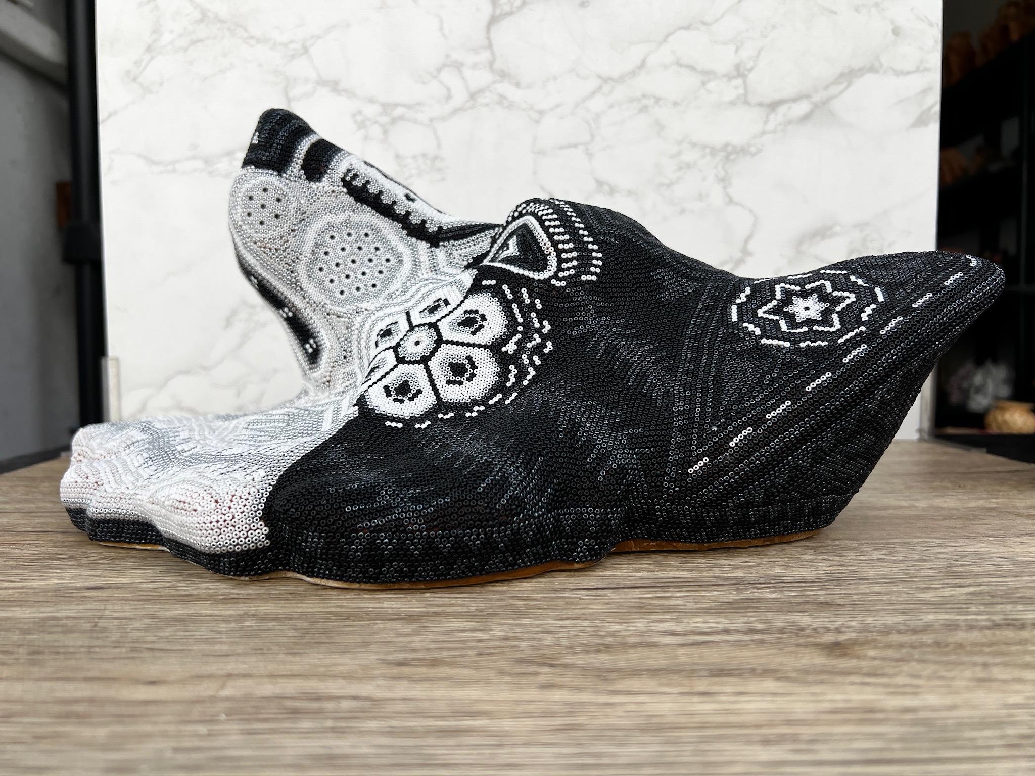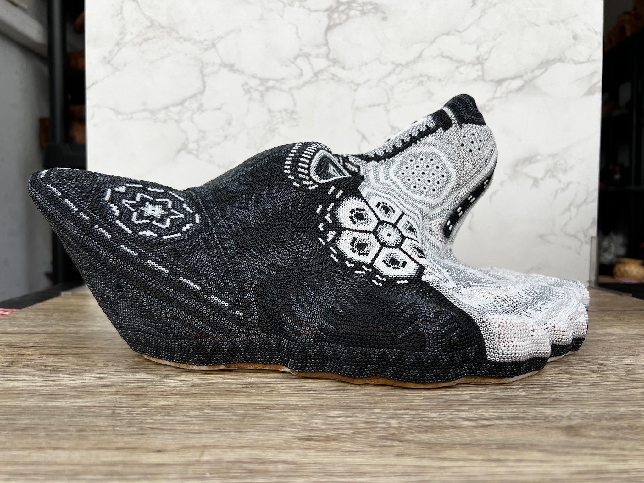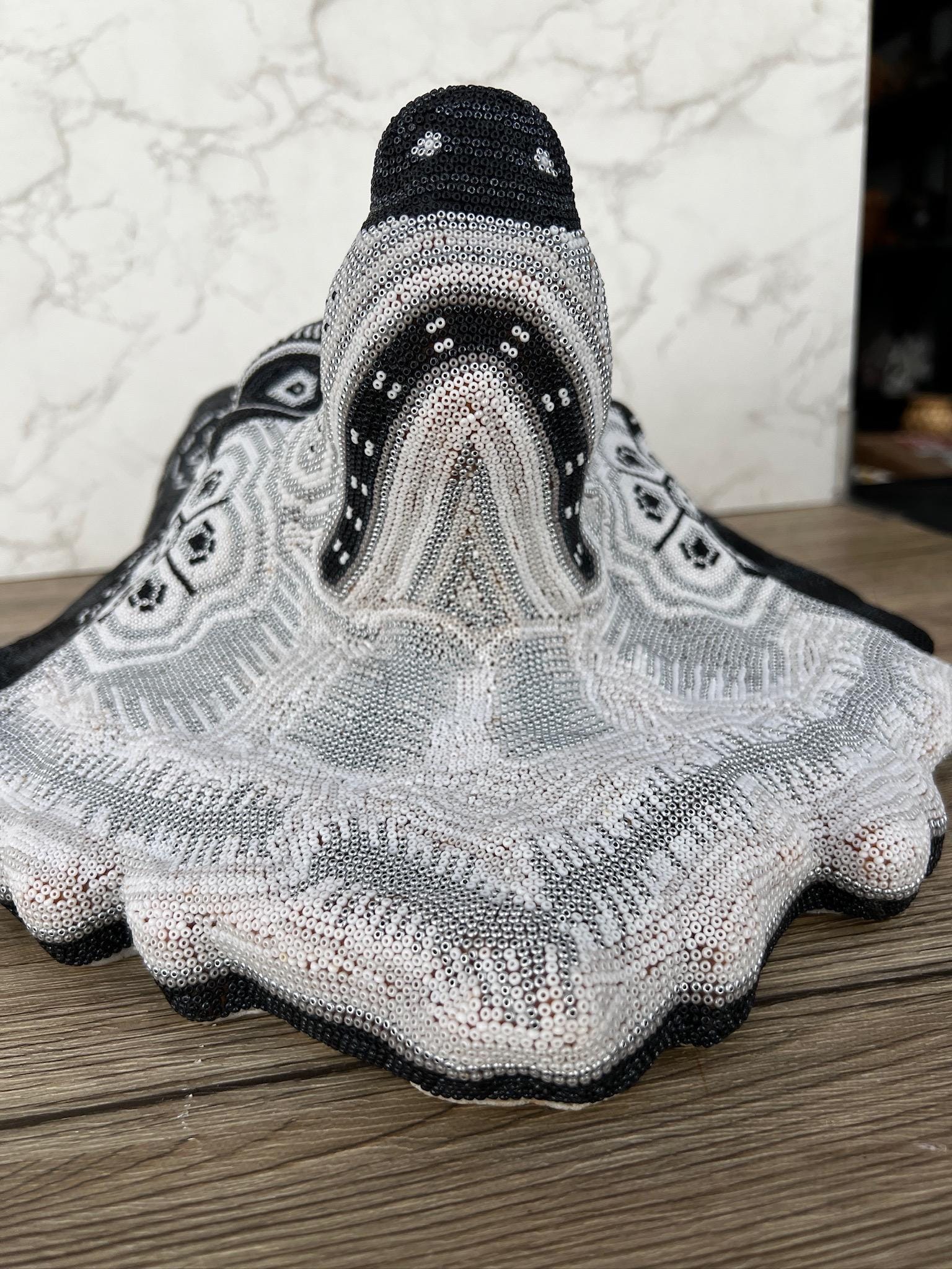 Item details * Materials: Chaquiras, sculpture in resin and Campeche wax. * Manufacturing process: Campeche wax will be evenly dispersed on the resin sculpture, this wax will serve as a glue and allow the beads to be easily placed on the surface.