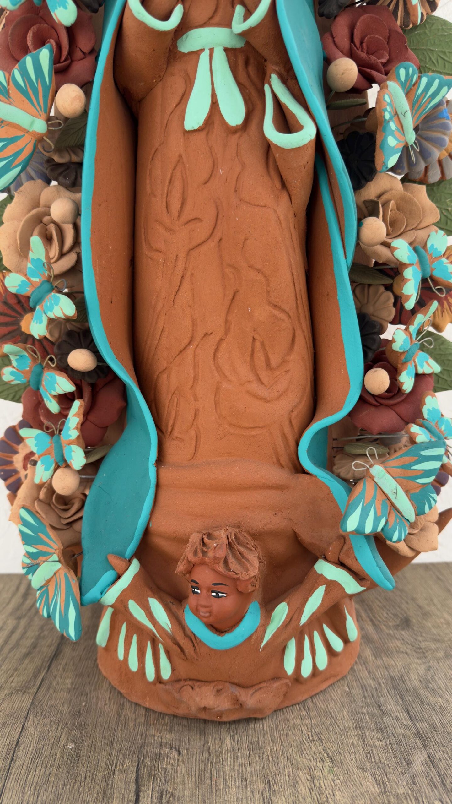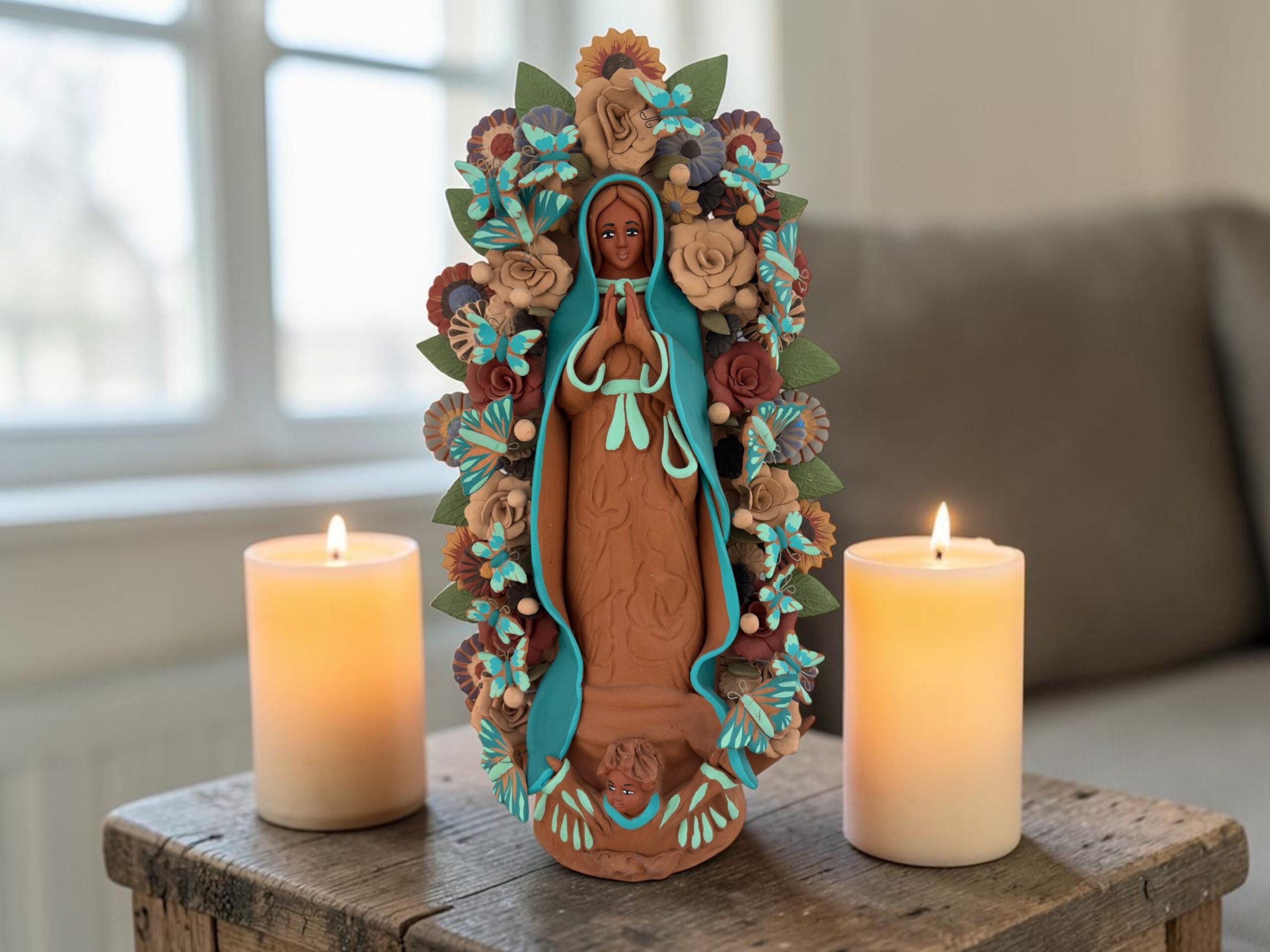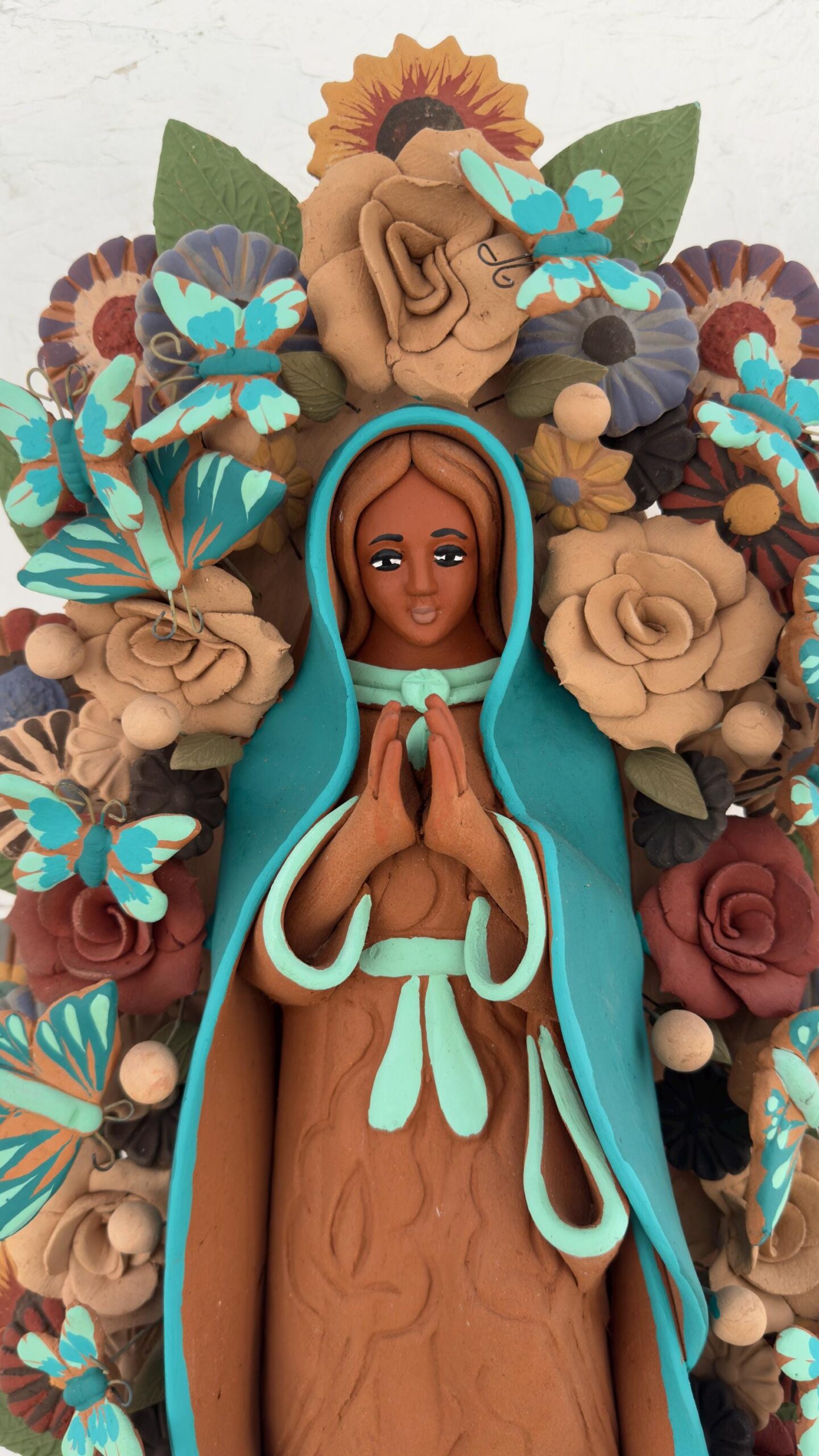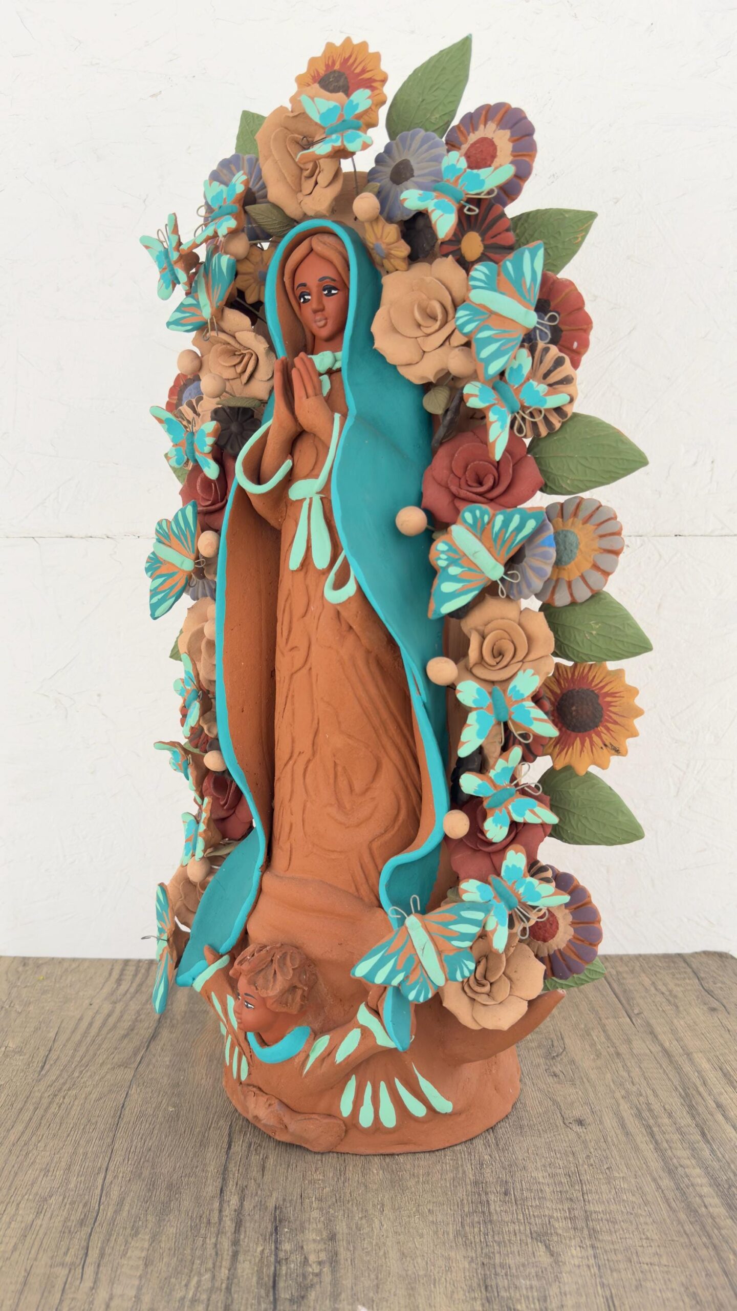 Mary Virgin with flowers decoration ideal to decorate your home or as a special gift, characteristic: – Handmade by Mexican artisans – clay material – clay natural colors – Dimentions 23.7” Tall This handcrafted clay Virgin is a stunning representation of Mexican folk art, lovingly made by talented artisans in Metepec, Estado de México. Famous for its barro (clay) traditions, Metepec is a vibrant town where cultural heritage and craftsmanship are deeply rooted in every piece. Each Virgin is carefully shaped and painted by hand, featuring intricate details and warm earthy tones that reflect the spiritual and artistic essence of the region. This beautiful figure brings a sacred, heartfelt presence to any home, altar, or devotional space. It’s not just a decoration—it’s a meaningful connection to tradition, faith, and the hands that created it. Every piece is unique, with slight variations in color and expression, adding to its authenticity and charm. Perfect as a gift or a treasured part of your own spiritual collection.