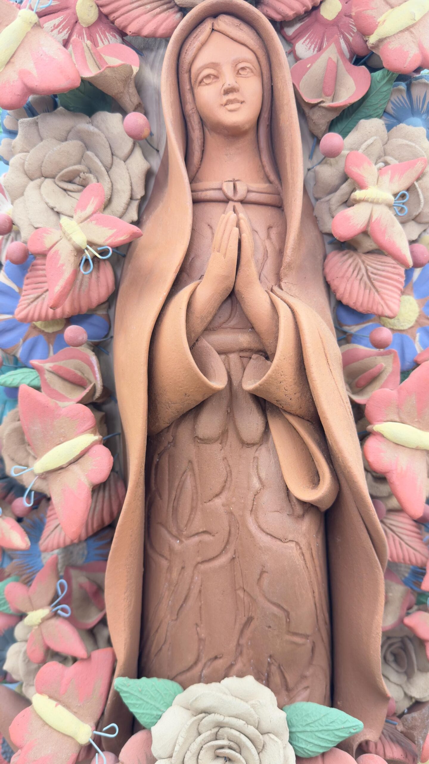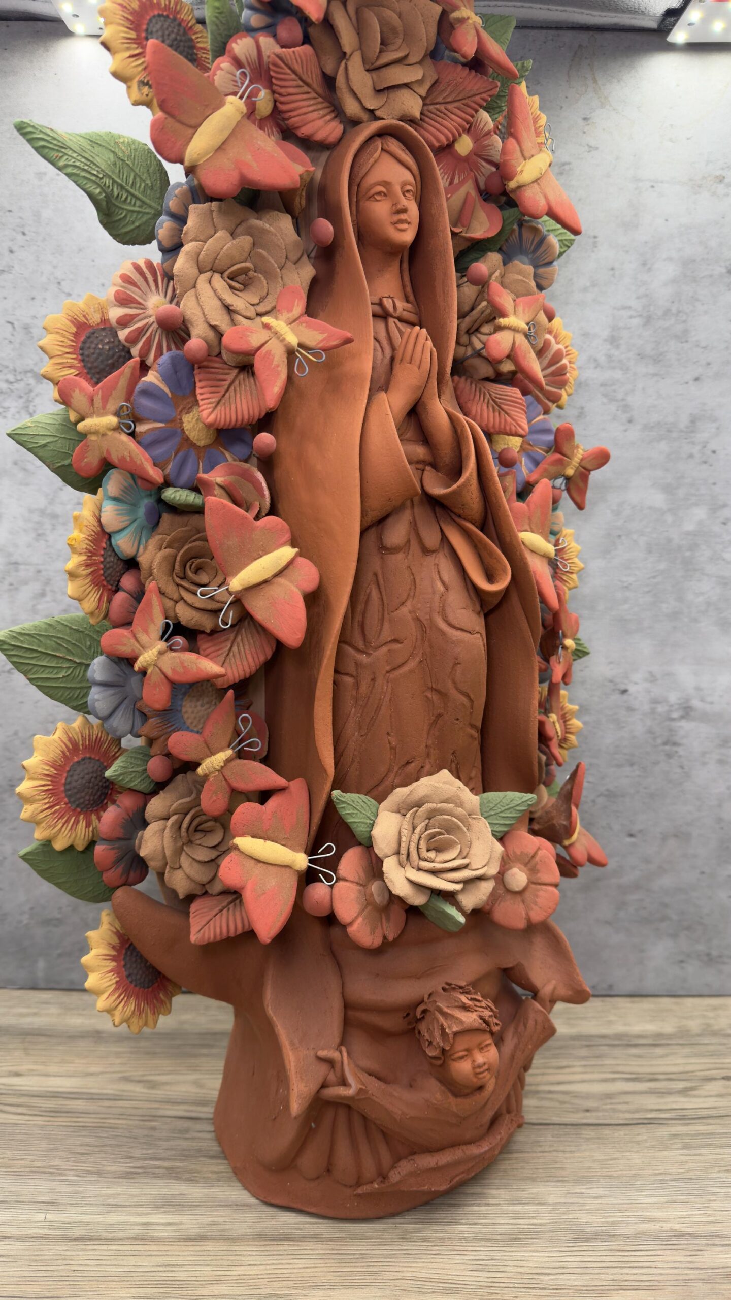 Mary Virgin with flowers decoration ideal to decorate your home or as a special gift, characteristic: – Handmade by Mexican artisans – clay material – clay natural colors – Dimentions 23.7” Tall This handcrafted clay Virgin is a stunning representation of Mexican folk art, lovingly made by talented artisans in Metepec, Estado de México. Famous for its barro (clay) traditions, Metepec is a vibrant town where cultural heritage and craftsmanship are deeply rooted in every piece. Each Virgin is carefully shaped and painted by hand, featuring intricate details and warm earthy tones that reflect the spiritual and artistic essence of the region. This beautiful figure brings a sacred, heartfelt presence to any home, altar, or devotional space. It’s not just a decoration—it’s a meaningful connection to tradition, faith, and the hands that created it. Every piece is unique, with slight variations in color and expression, adding to its authenticity and charm. Perfect as a gift or a treasured part of your own spiritual collection.