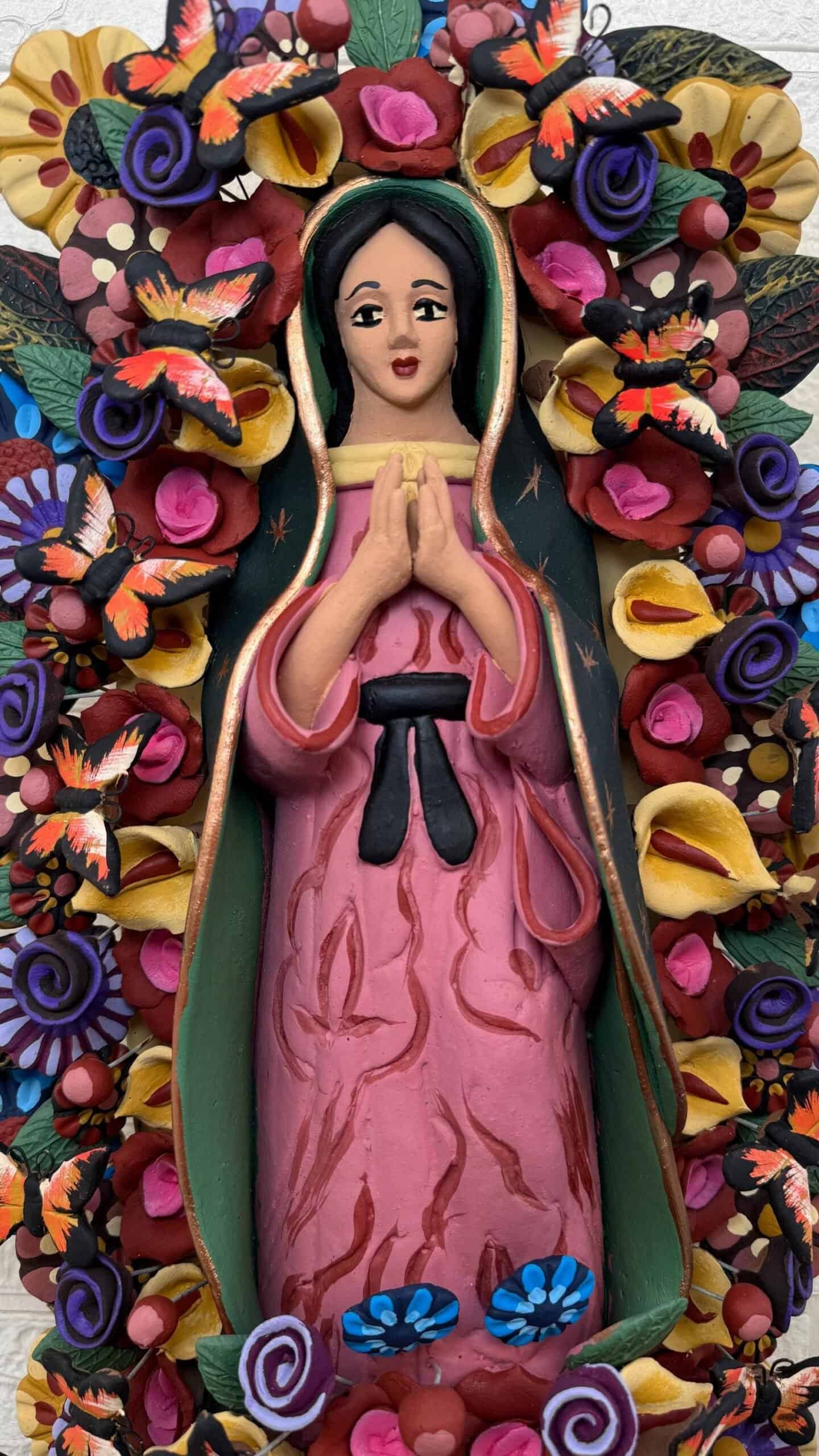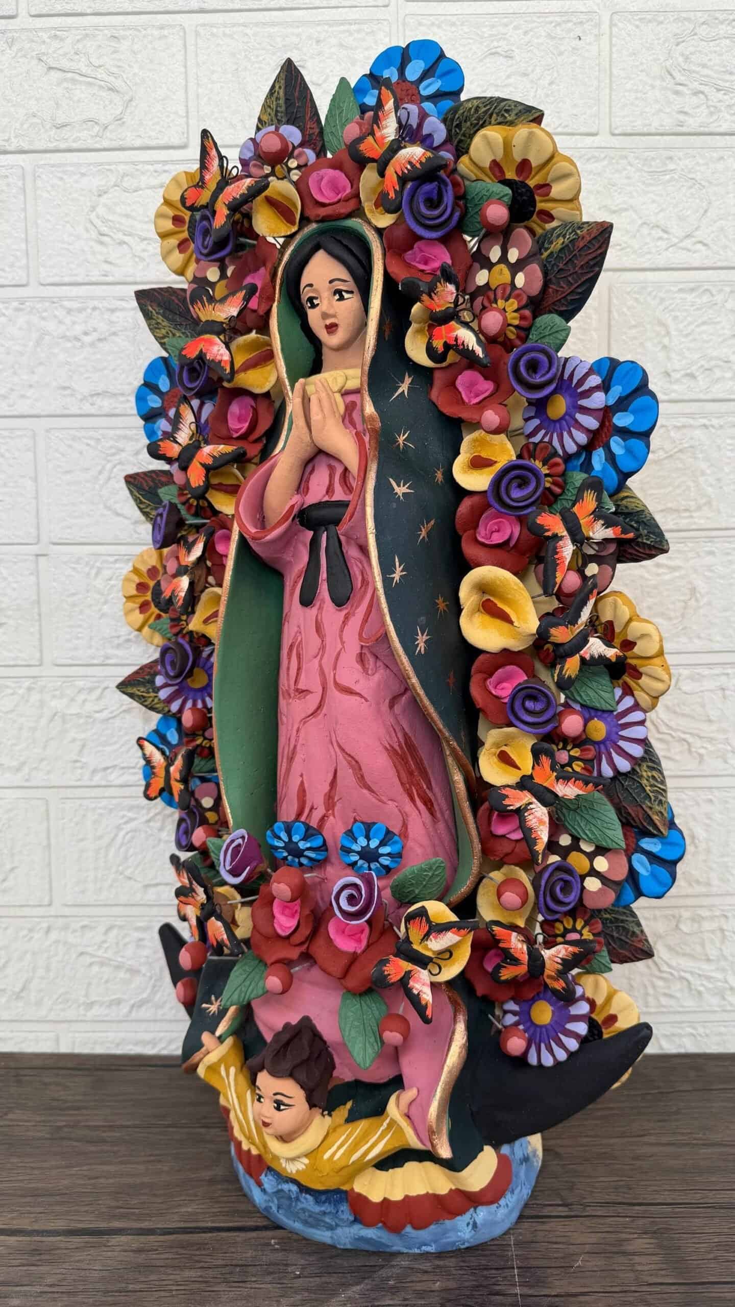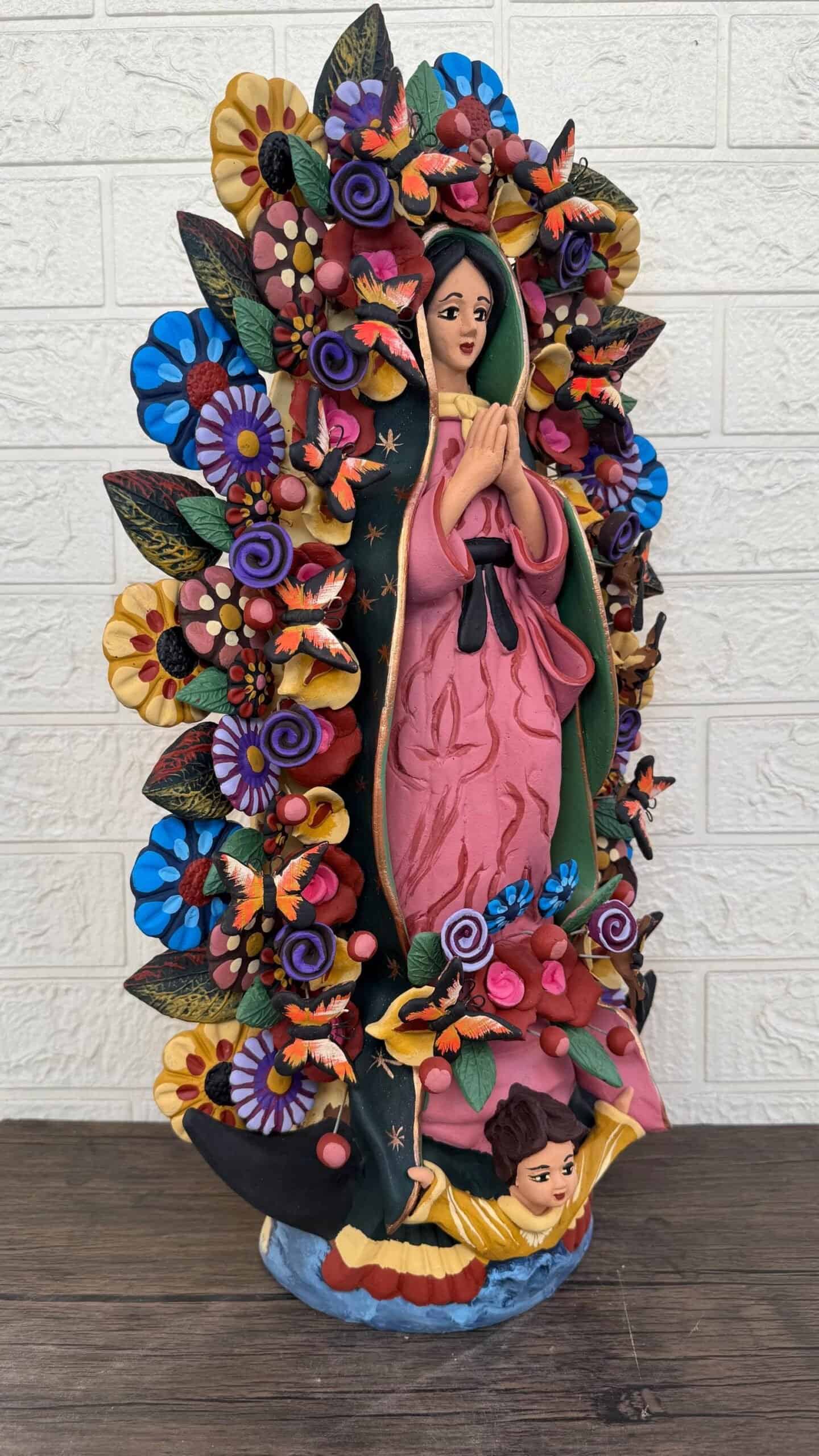 Mary Virgin with flowers decoration ideal to decorate your home or as a special gift, characteristic: – Handmade by Mexican artisans – clay material – clay natural colors – Dimentions 23.7” Tall This handcrafted clay Virgin is a stunning representation of Mexican folk art, lovingly made by talented artisans in Metepec, Estado de México. Famous for its barro (clay) traditions, Metepec is a vibrant town where cultural heritage and craftsmanship are deeply rooted in every piece. Each Virgin is carefully shaped and painted by hand, featuring intricate details and warm earthy tones that reflect the spiritual and artistic essence of the region. This beautiful figure brings a sacred, heartfelt presence to any home, altar, or devotional space. It’s not just a decoration—it’s a meaningful connection to tradition, faith, and the hands that created it. Every piece is unique, with slight variations in color and expression, adding to its authenticity and charm. Perfect as a gift or a treasured part of your own spiritual collection.