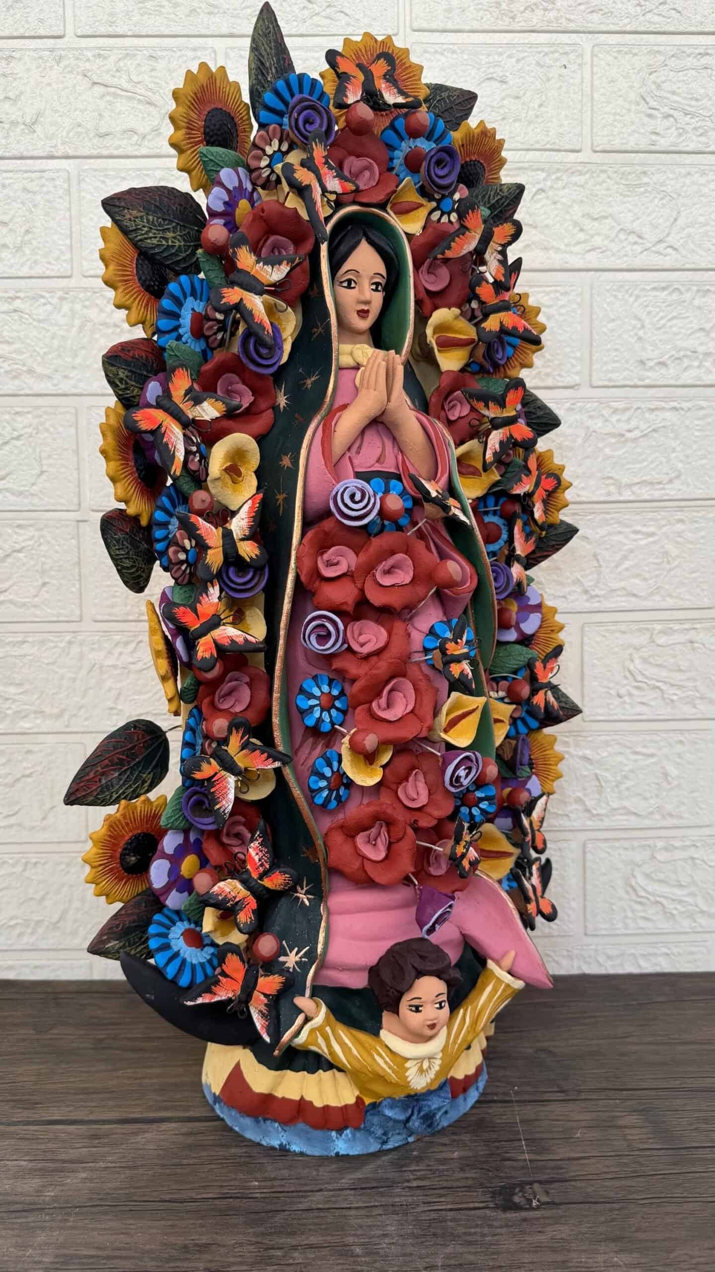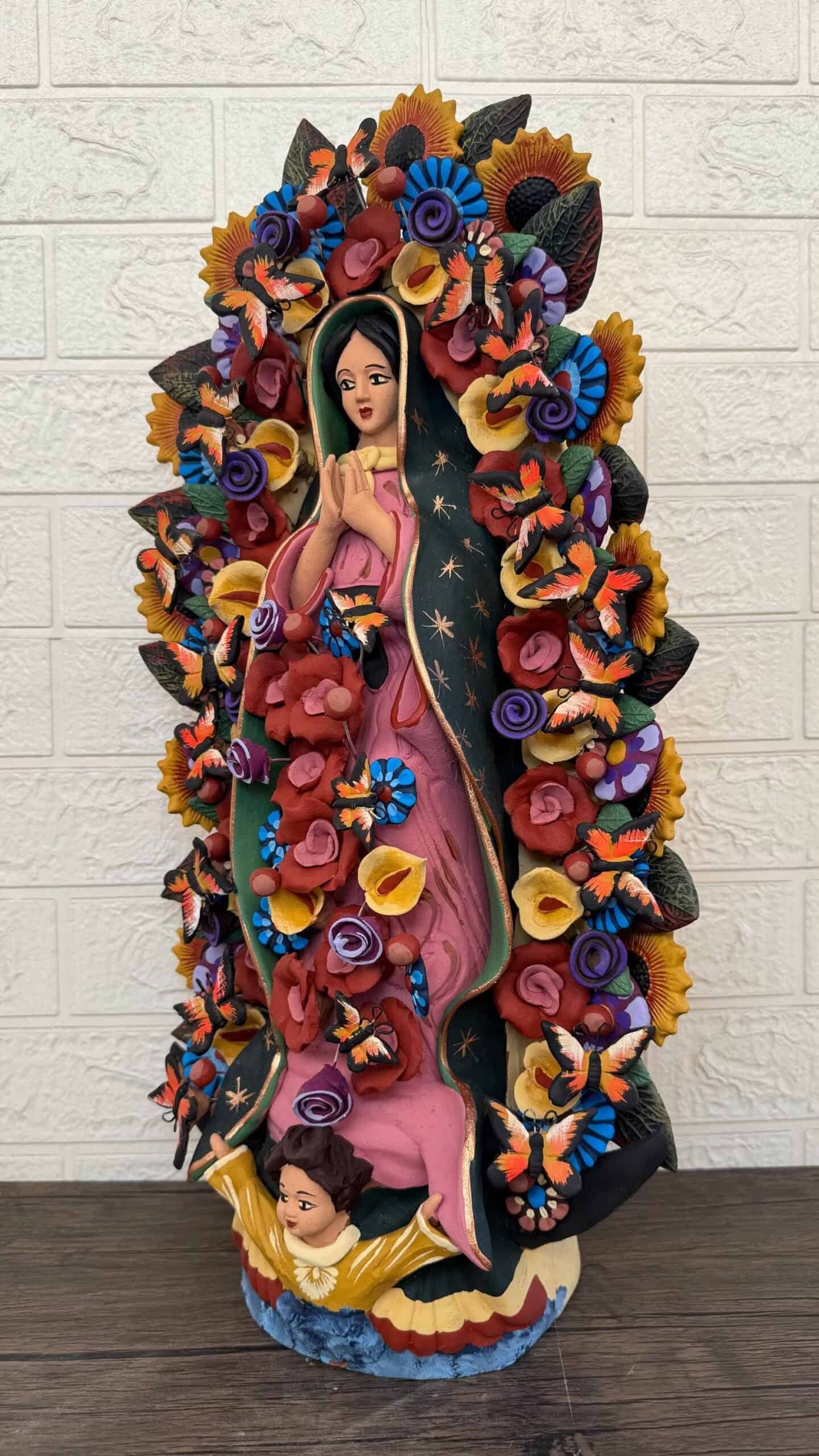 Mary Virgin with flowers decoration ideal to decorate your home or as a special gift, characteristic: – Handmade by Mexican artisans – clay material – clay natural colors – Dimentions 23.7” Tall This handcrafted clay Virgin is a stunning representation of Mexican folk art, lovingly made by talented artisans in Metepec, Estado de México. Famous for its barro (clay) traditions, Metepec is a vibrant town where cultural heritage and craftsmanship are deeply rooted in every piece. Each Virgin is carefully shaped and painted by hand, featuring intricate details and warm earthy tones that reflect the spiritual and artistic essence of the region. This beautiful figure brings a sacred, heartfelt presence to any home, altar, or devotional space. It’s not just a decoration—it’s a meaningful connection to tradition, faith, and the hands that created it. Every piece is unique, with slight variations in color and expression, adding to its authenticity and charm. Perfect as a gift or a treasured part of your own spiritual collection.